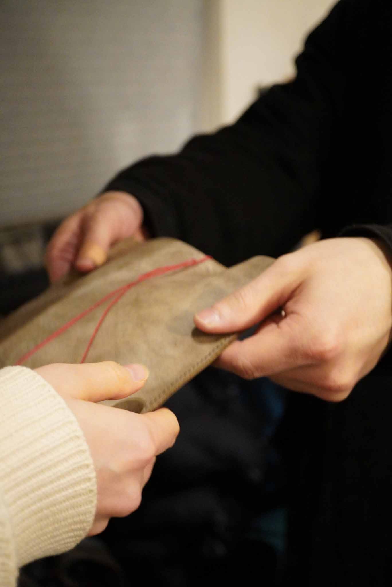 財布を購入したとき、阿部氏はレザーで丁寧に入れ物まで作ってくれました。