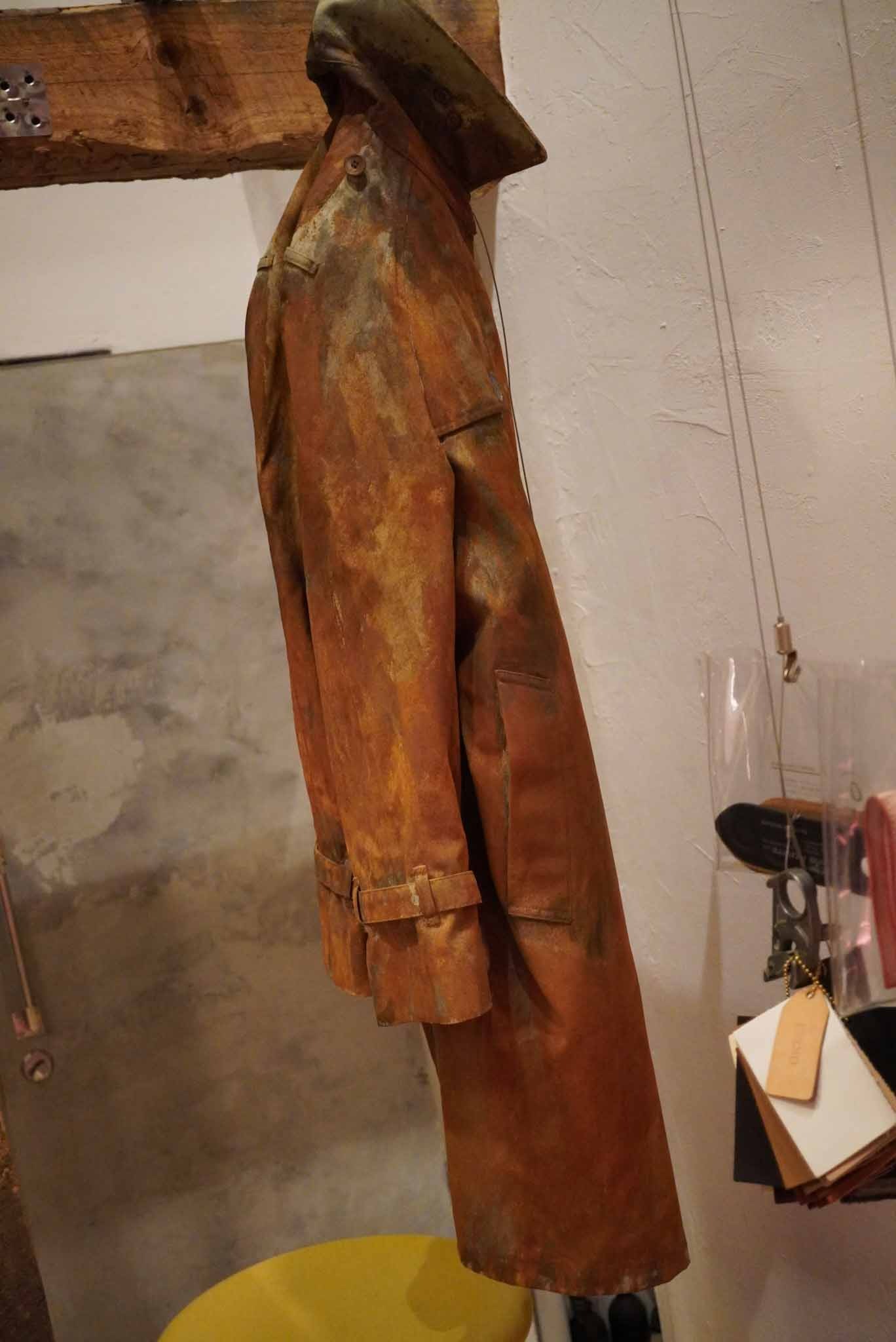 デッドストックの貴重なファブリックとタンニンなめしのホースハイドを使用したロングコート。