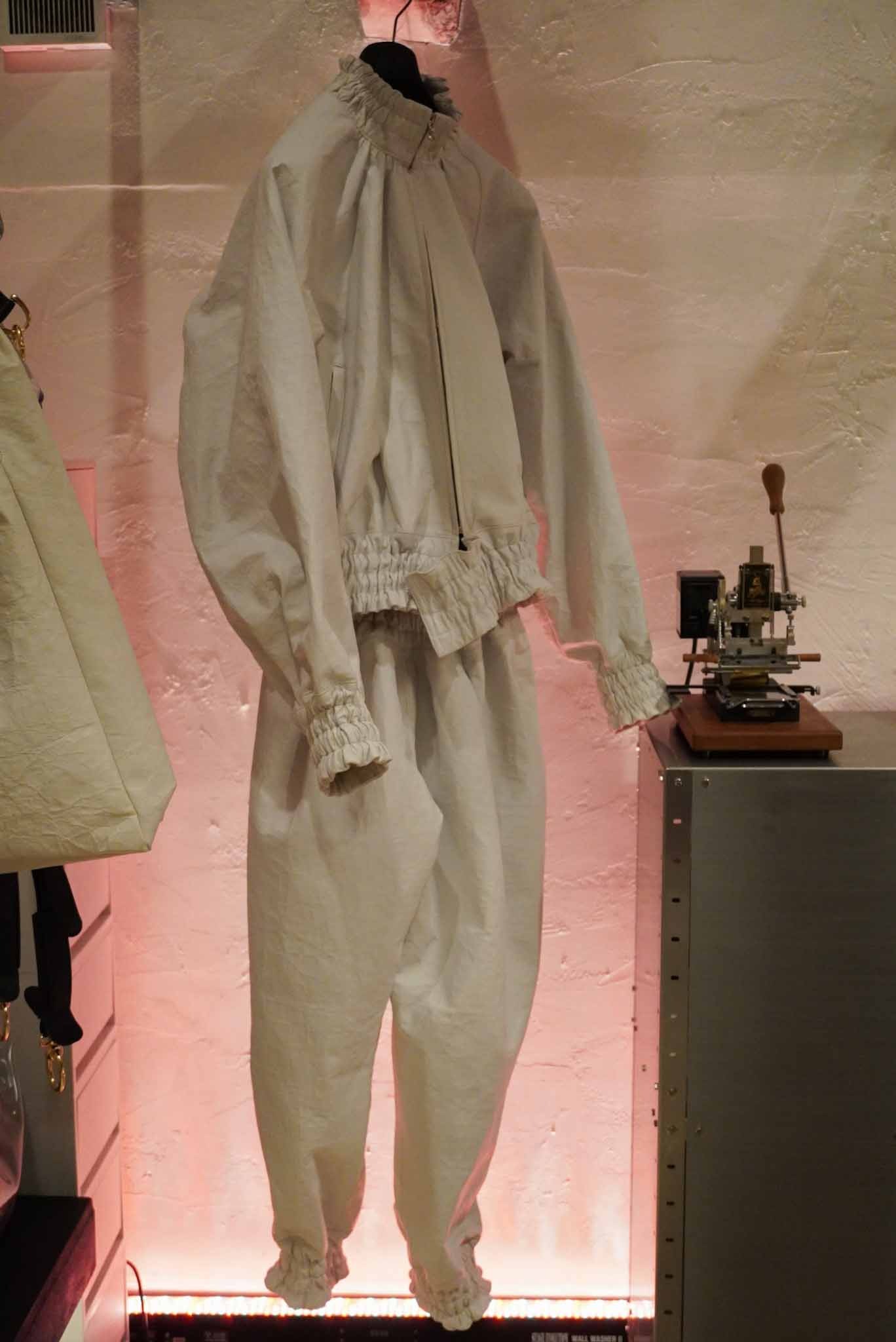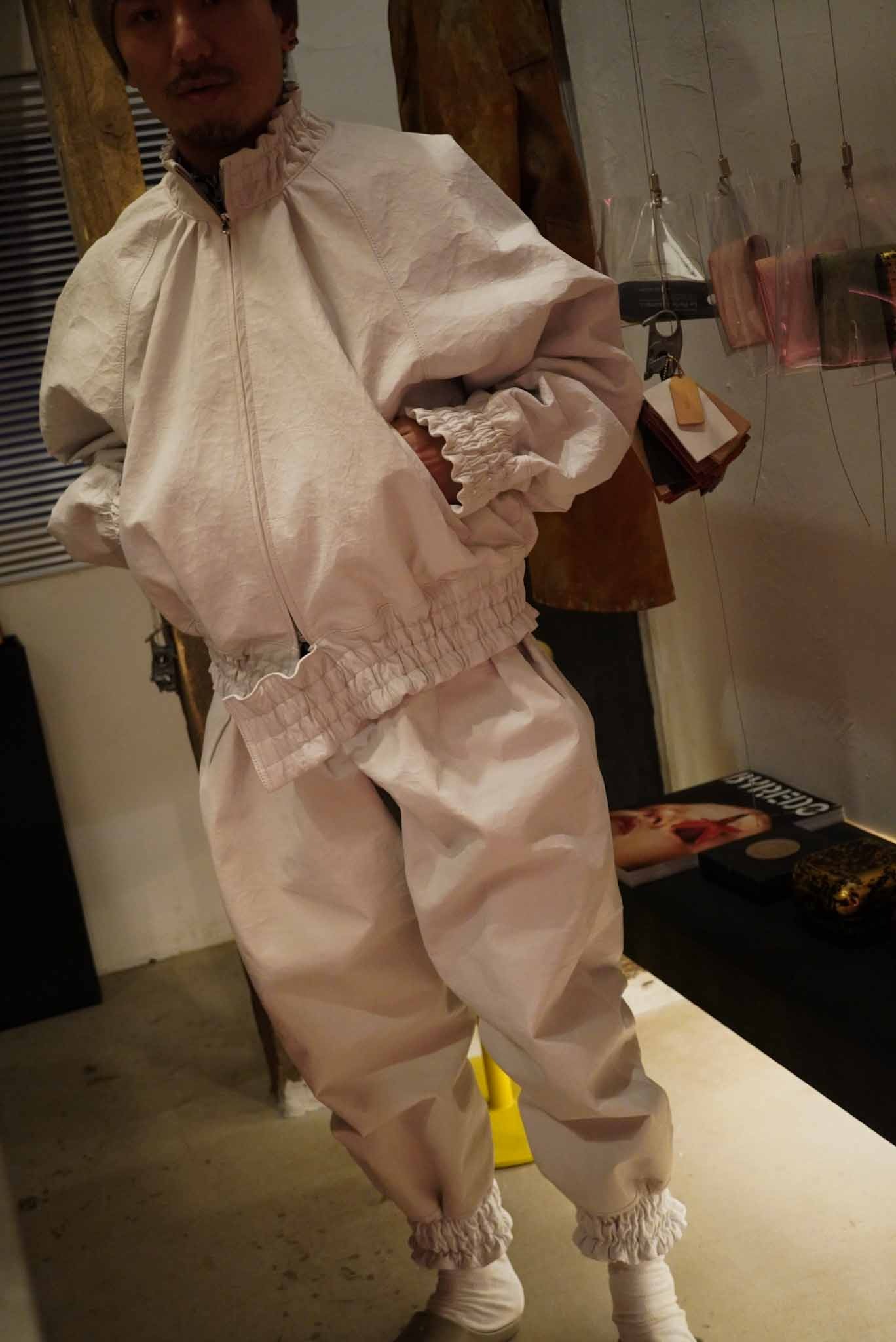 こちらは新作のアイテム。真っ白なレザーのセットアップ。