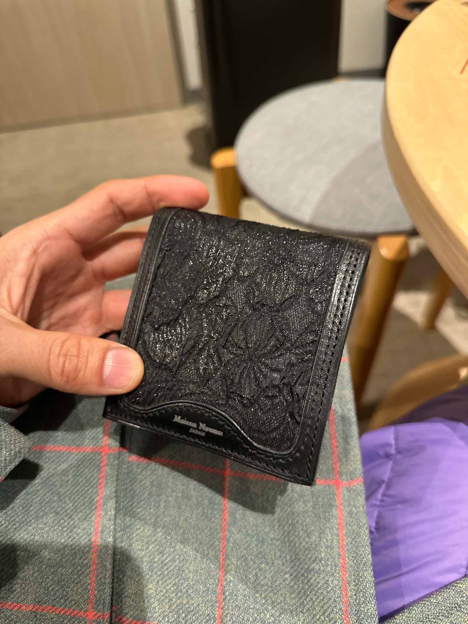 Noumu作品にあったヴィンテージのフラワージャガードとレザーを組み合わせた2つ折りの財布をゲット。
