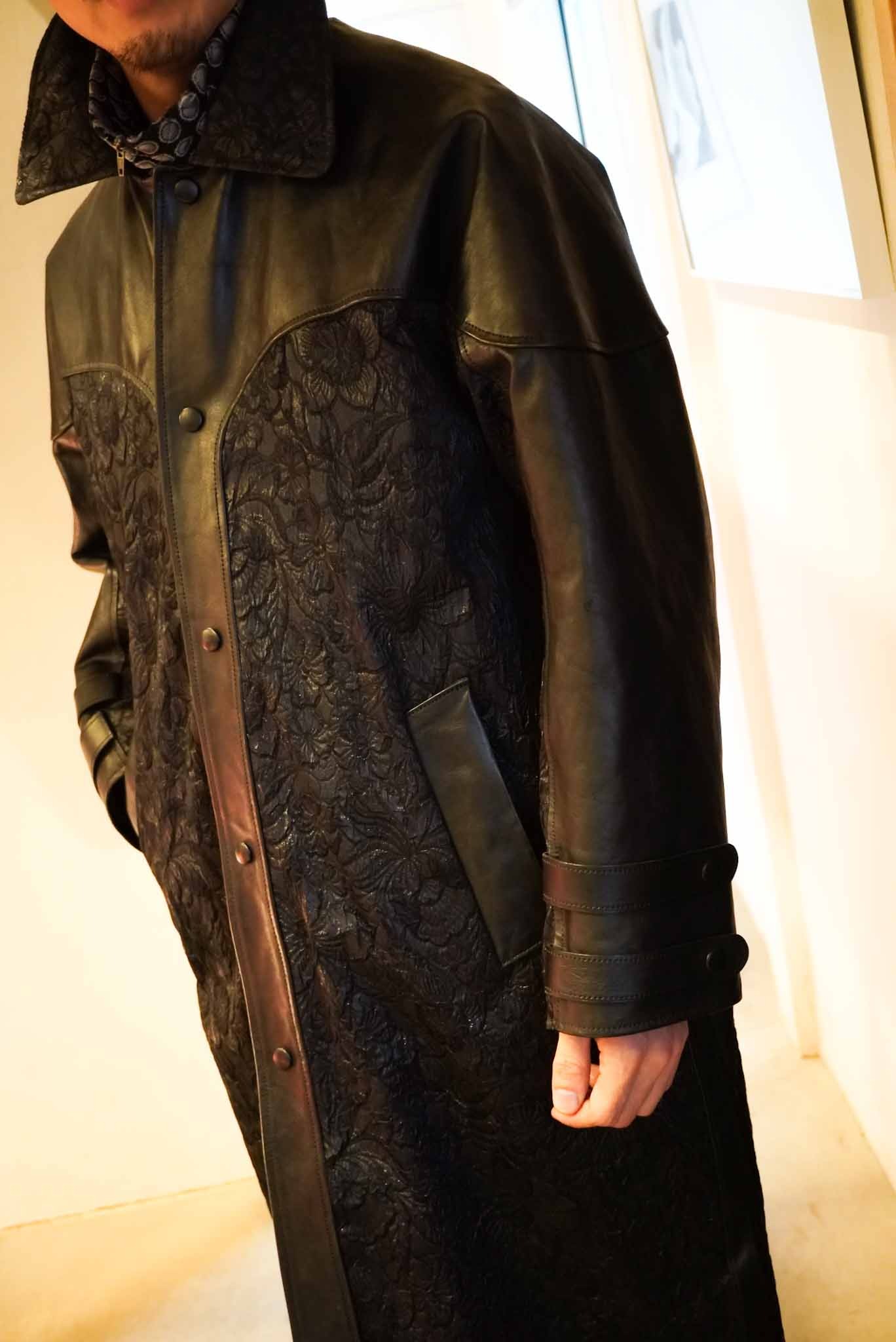 甲冑の様なデザインと大きなシルエットが重厚感と強いインパクトを与えるレザーコート。前身頃、後身頃(センターバック切り替え)袖のそれぞれのパーツを一枚剥ぎで裁断し、約5枚の革を贅沢に使用し作成したコートは牛革の素材感がダイレクトに伝わります。