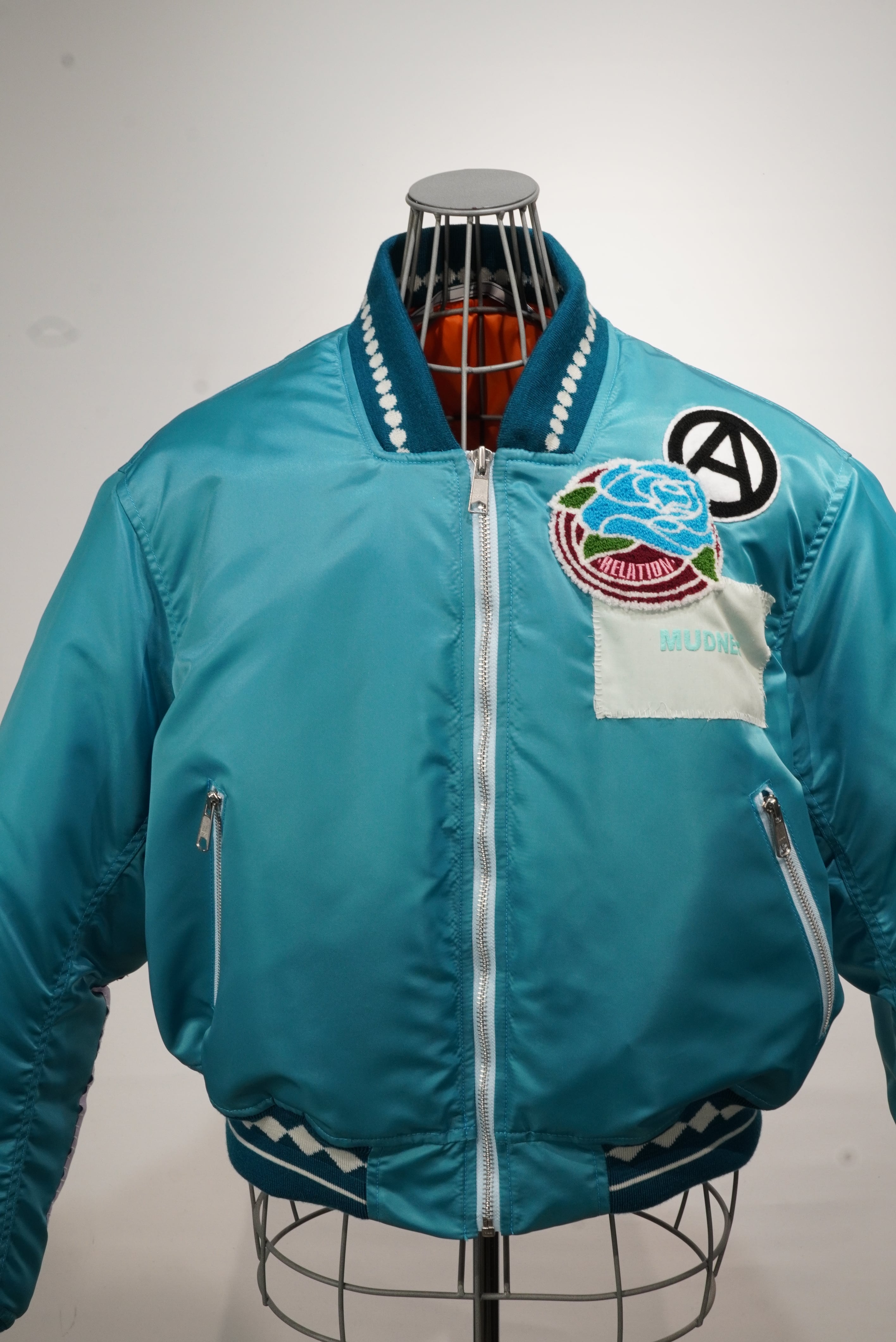 The tokio works original turquoise MA-1 is a special piece that reflects the punk spirit, with handmade patches and message crosses attached. It is shorter in length than the usual MA-1.