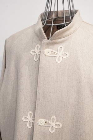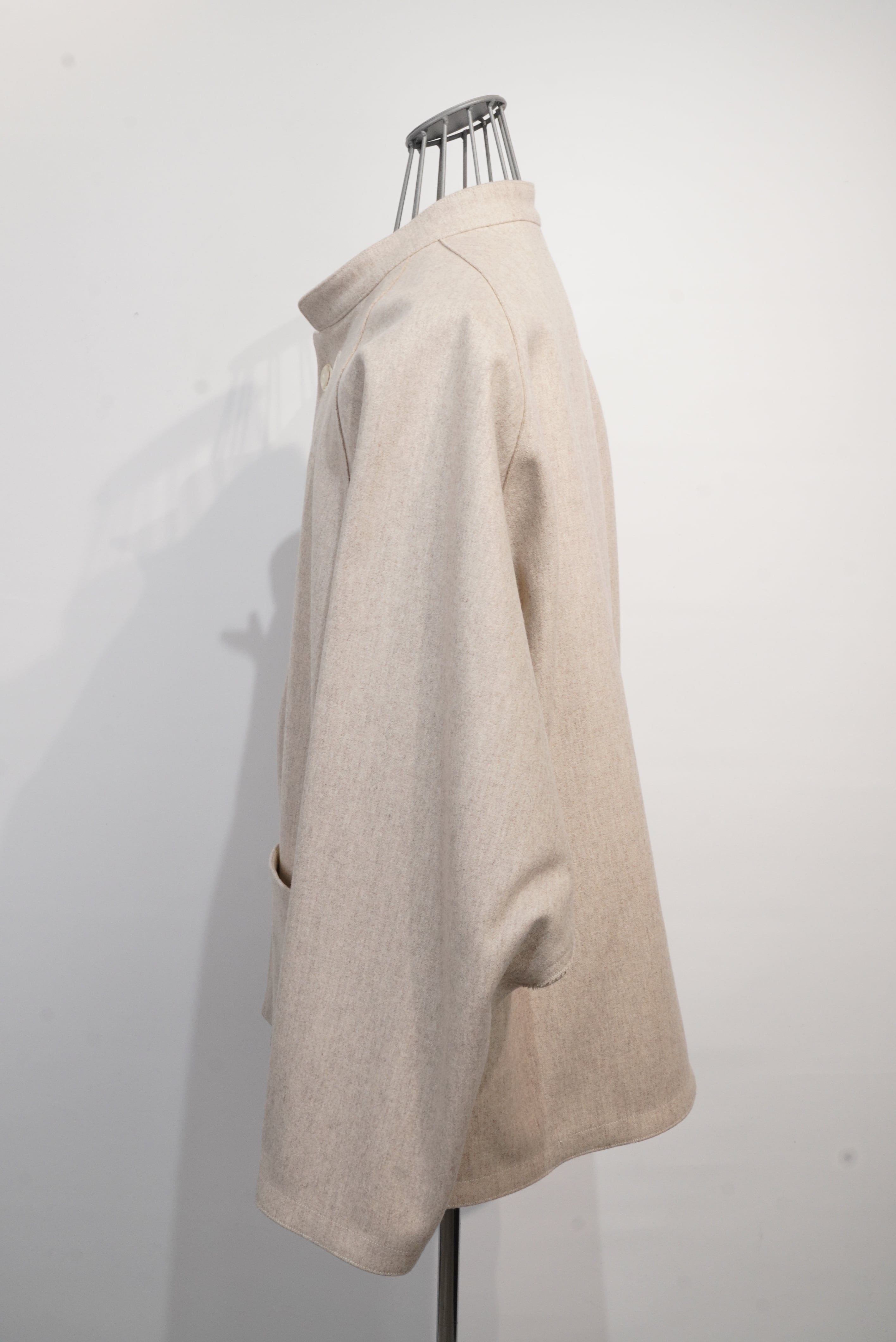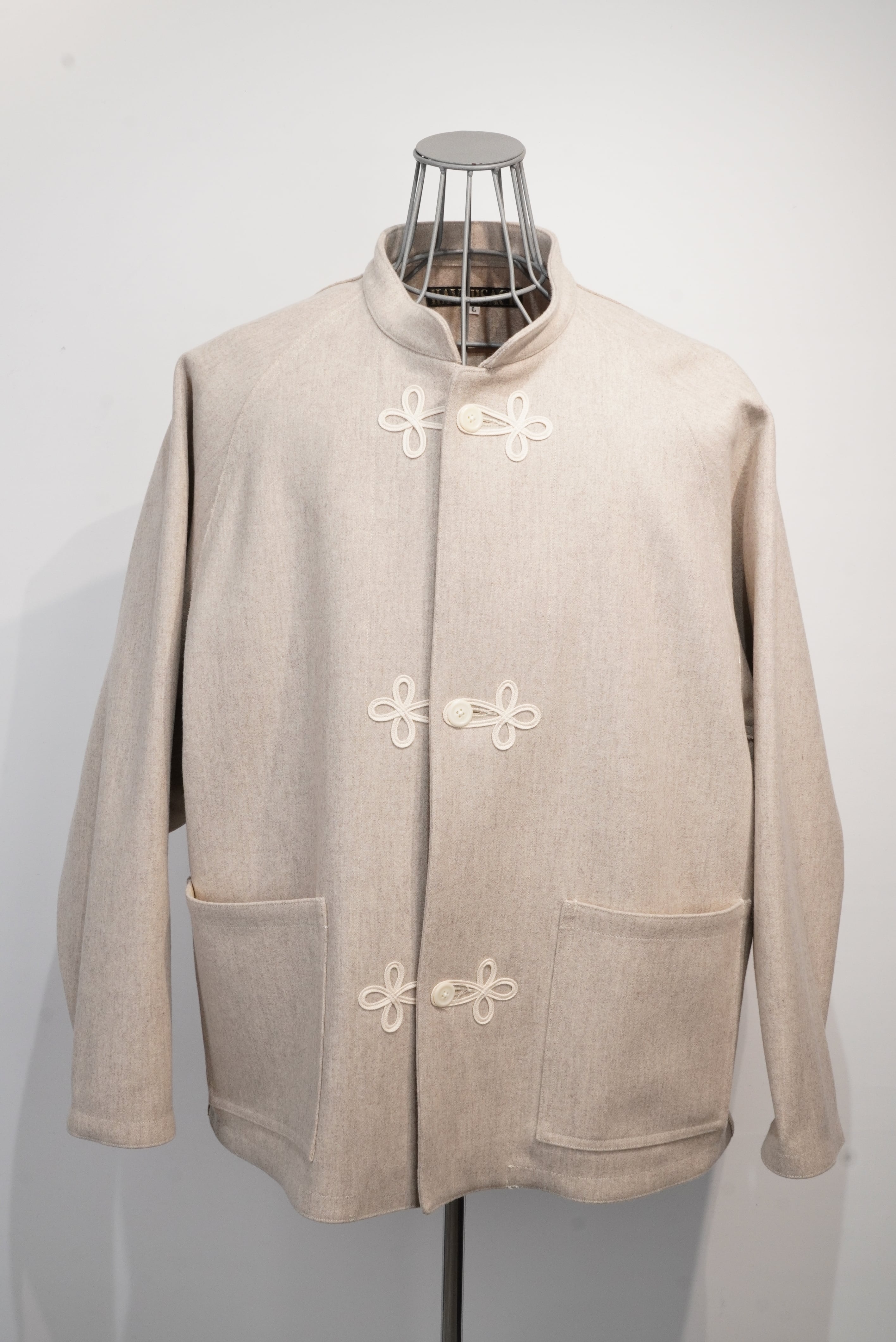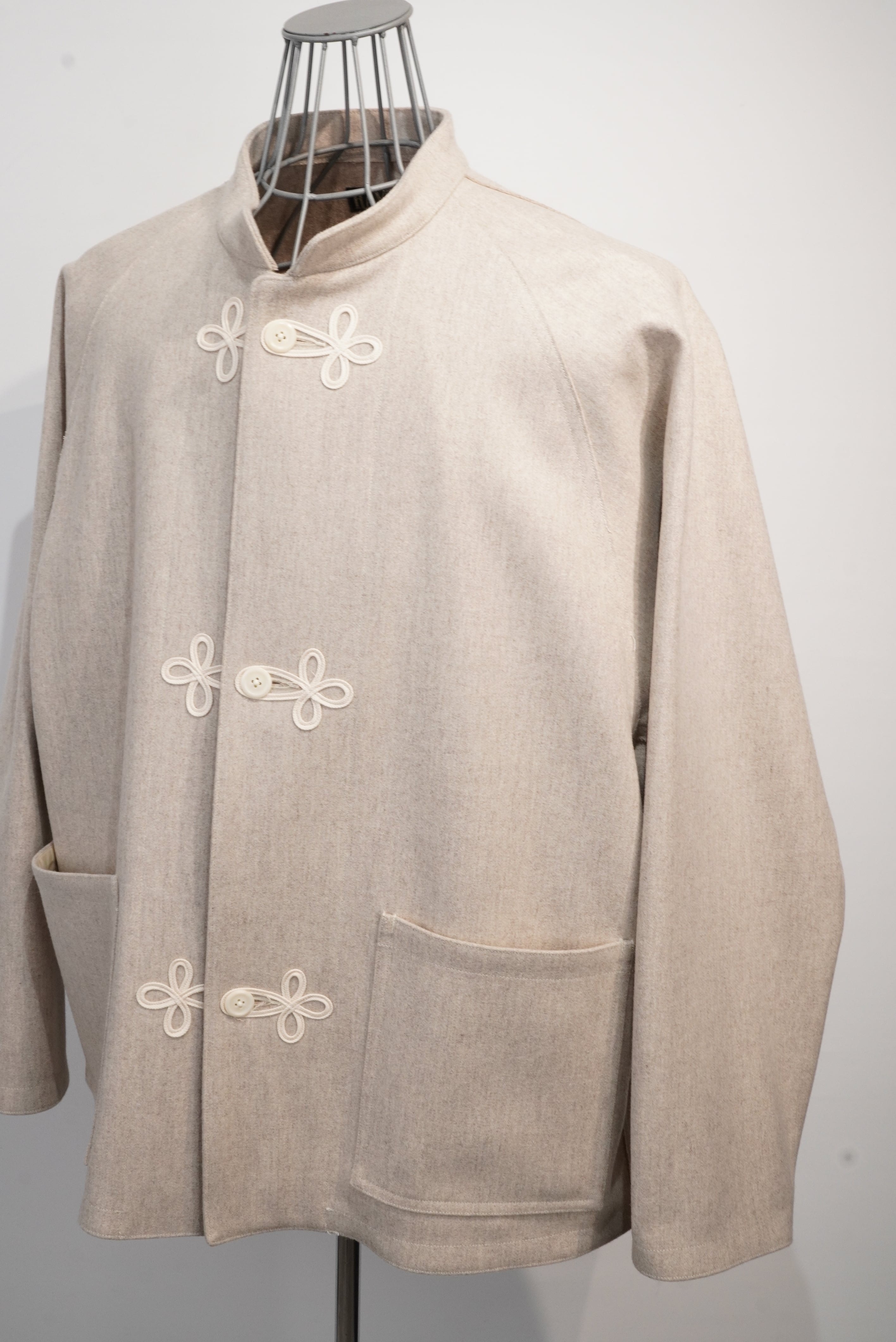 This stand-collar jacket is made from a single piece of HAVERSACK's original, tightly twisted vintage melton in a cut-off style. The raglan sleeves feature a large underarm gusset, which means the body doesn't get pulled down by the generous width, allowing for unrestricted arm movement and making it easy to wear. It's also perfectly fine to tuck a low-gauge knit underneath. The classic design, featuring decorative tape on the placket, creates an oriental feel. With this thickness, you won't even need a coat in the fall and winter. In fact, the jacket itself functions as a coat. Available in beige and black.
