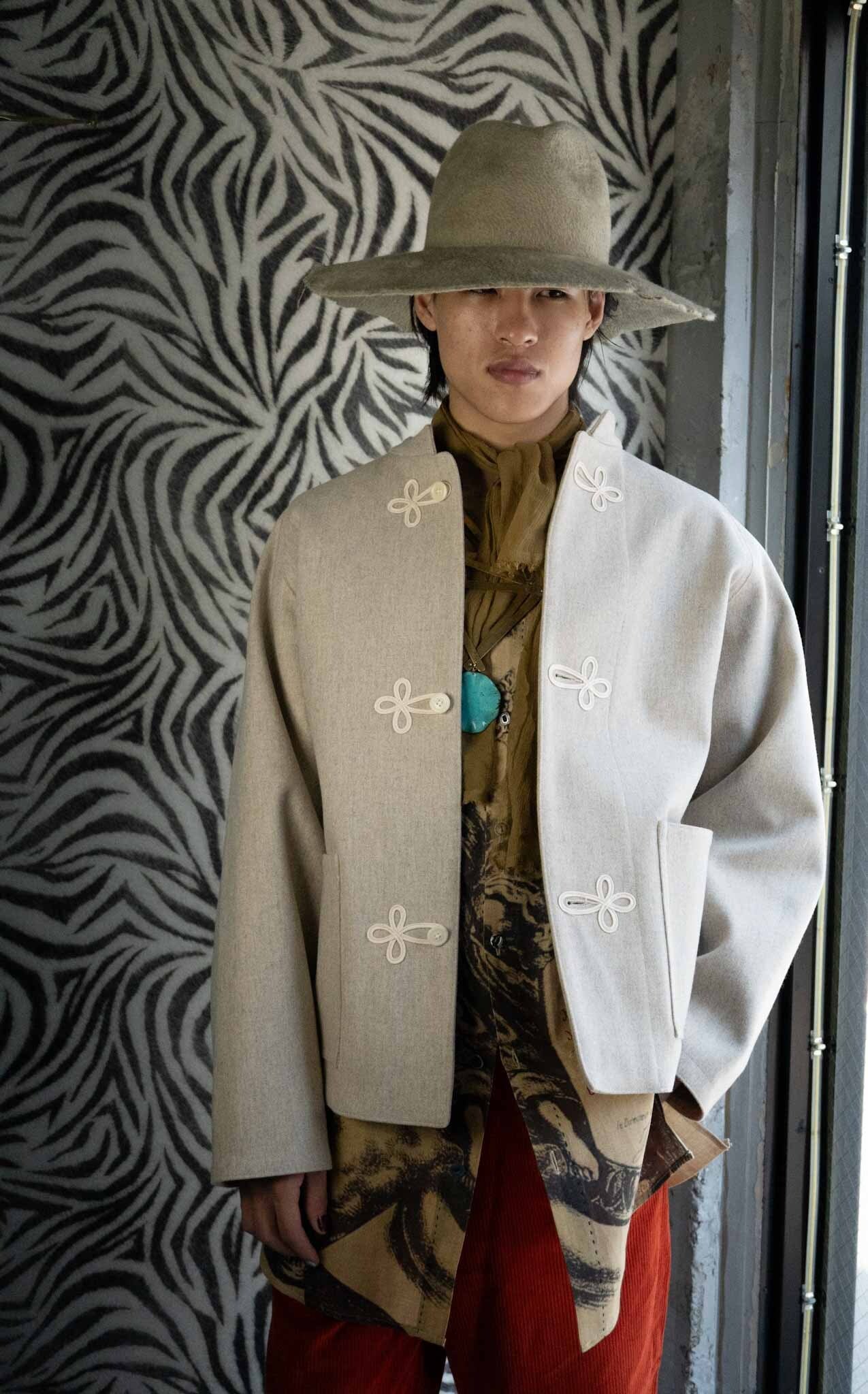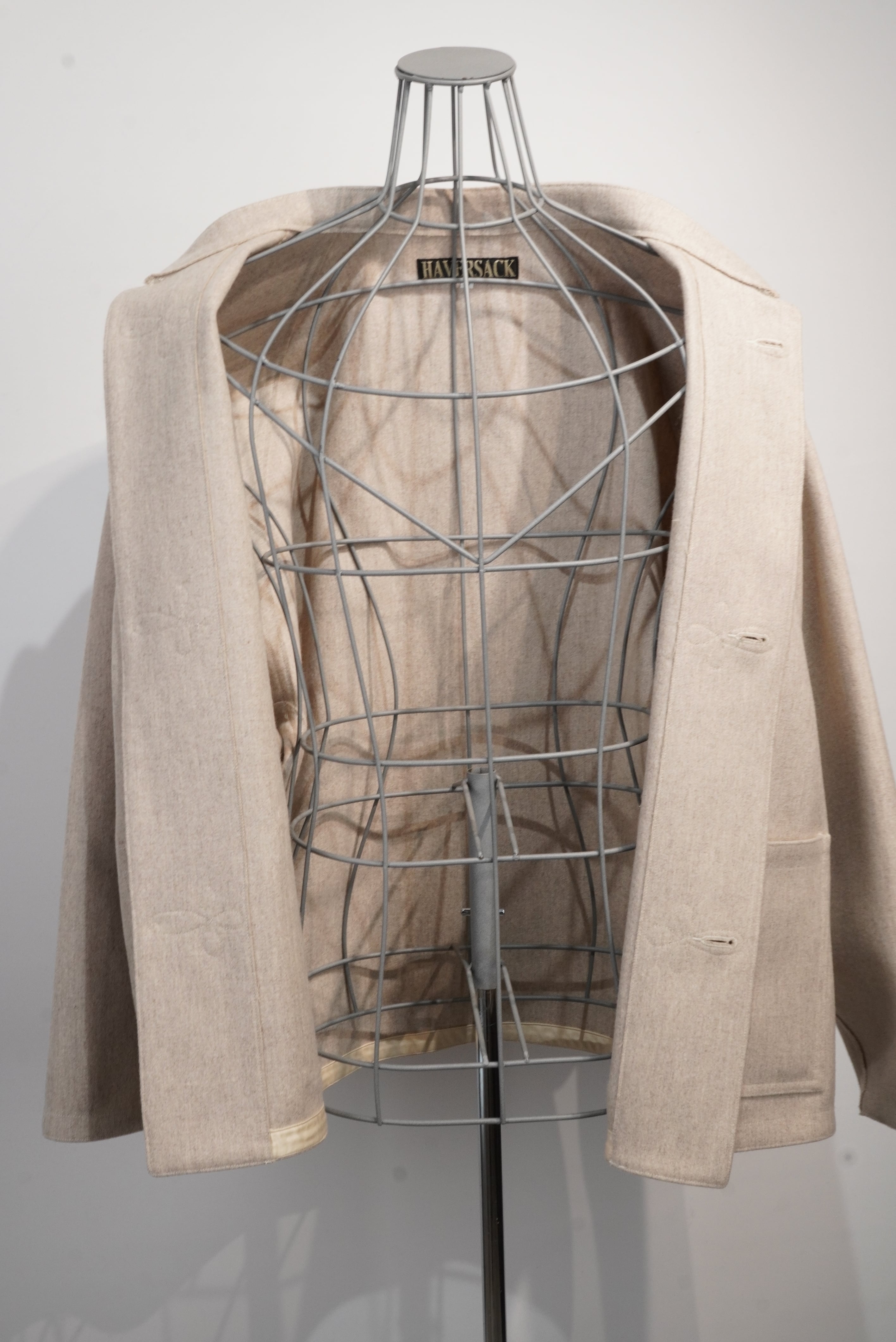 HAVERSACK オリジナルの強撚ヴィンテージメルトンをカットオフ仕様にした、1枚仕立てのスタンドカラージャケット。袖下の大きなマチが特徴のラグランスリーブを採用することで、身幅のゆとりにも身頃が引っ張られず、腕の可動域を妨げることなく、着やすい作りになっています。なのでローゲージニットを中にいれても全然大丈夫。前立てにテープの装飾をあしらった、クラシカルなデザインも特徴で、オリエンタルな雰囲気を醸し出しています。この厚さであれば秋冬もコートいらず。むしろこのジャケット自体がコートの役割となります。色はベージュとブラックをご用意しています。