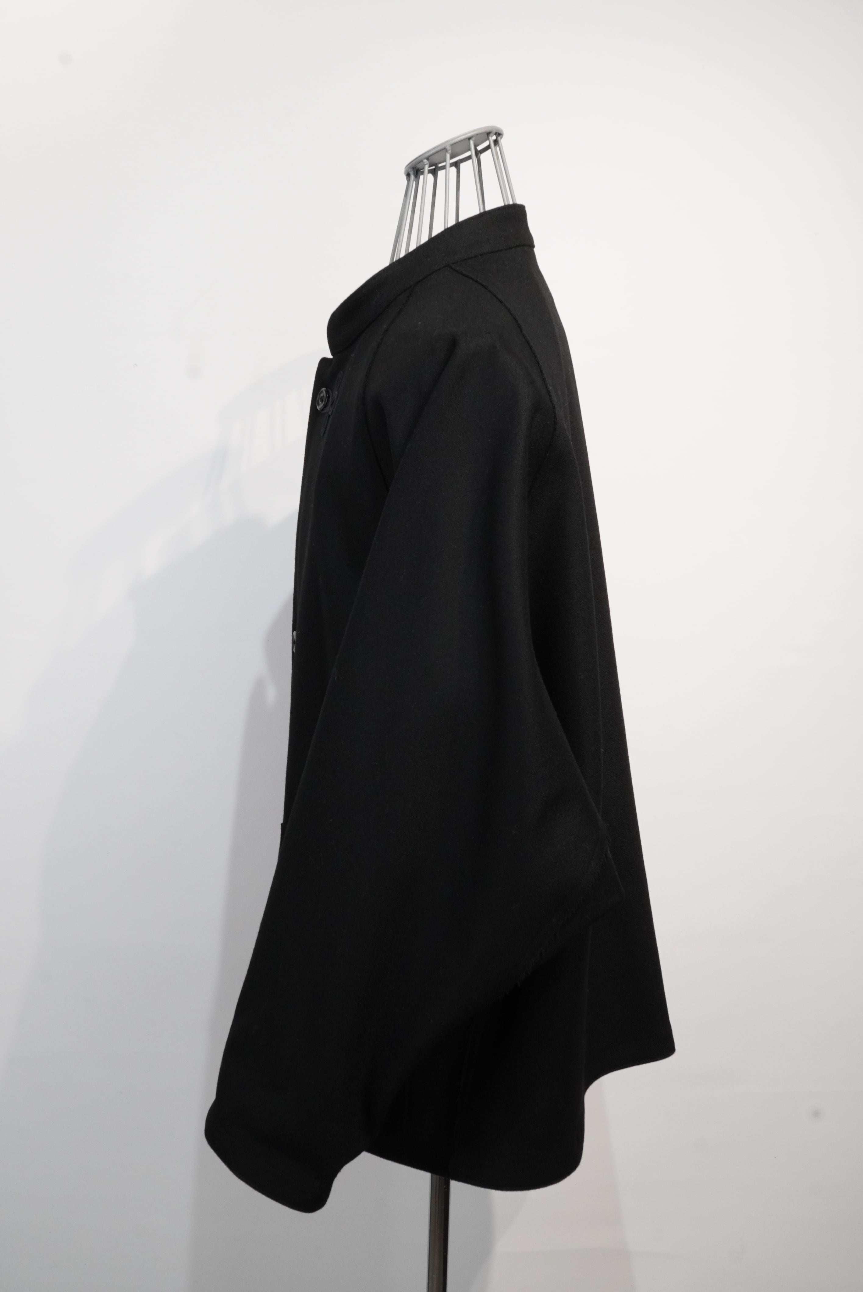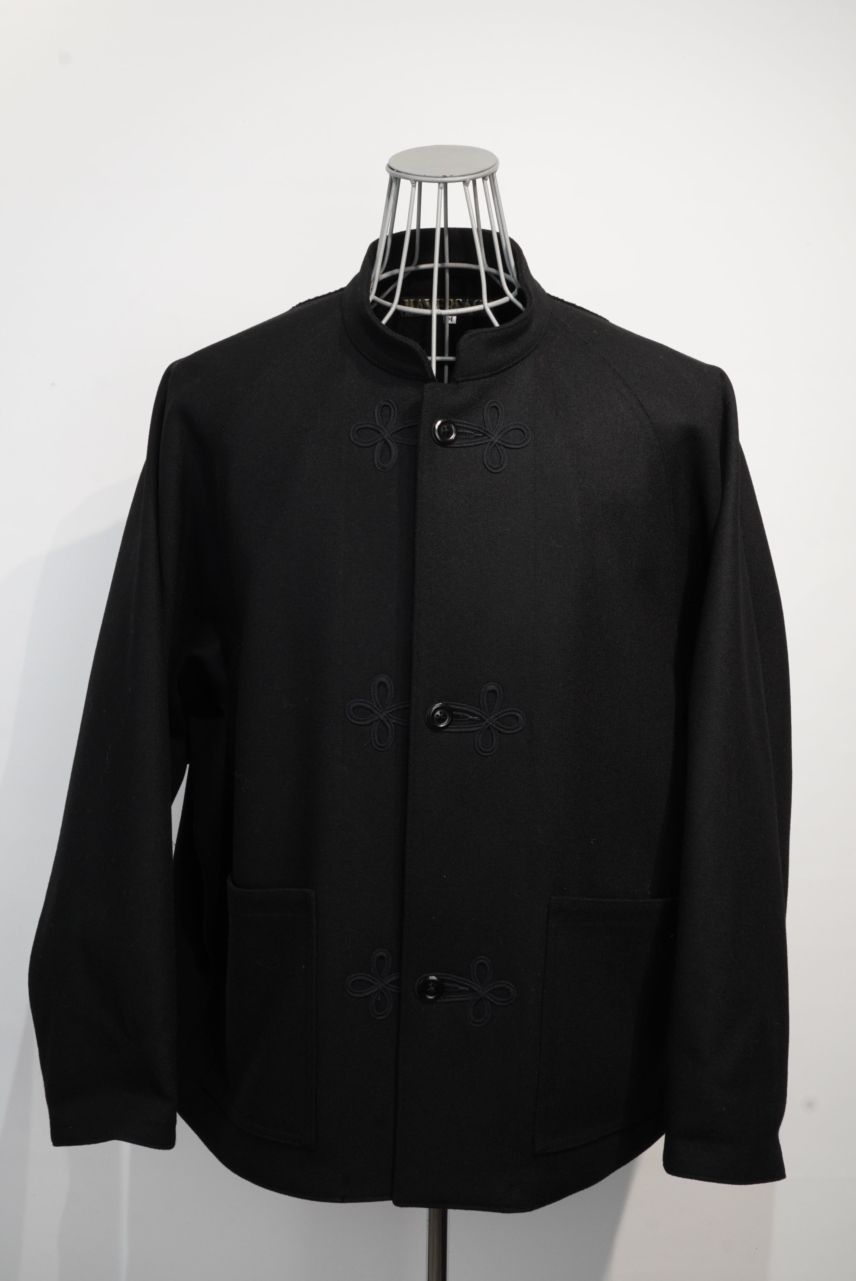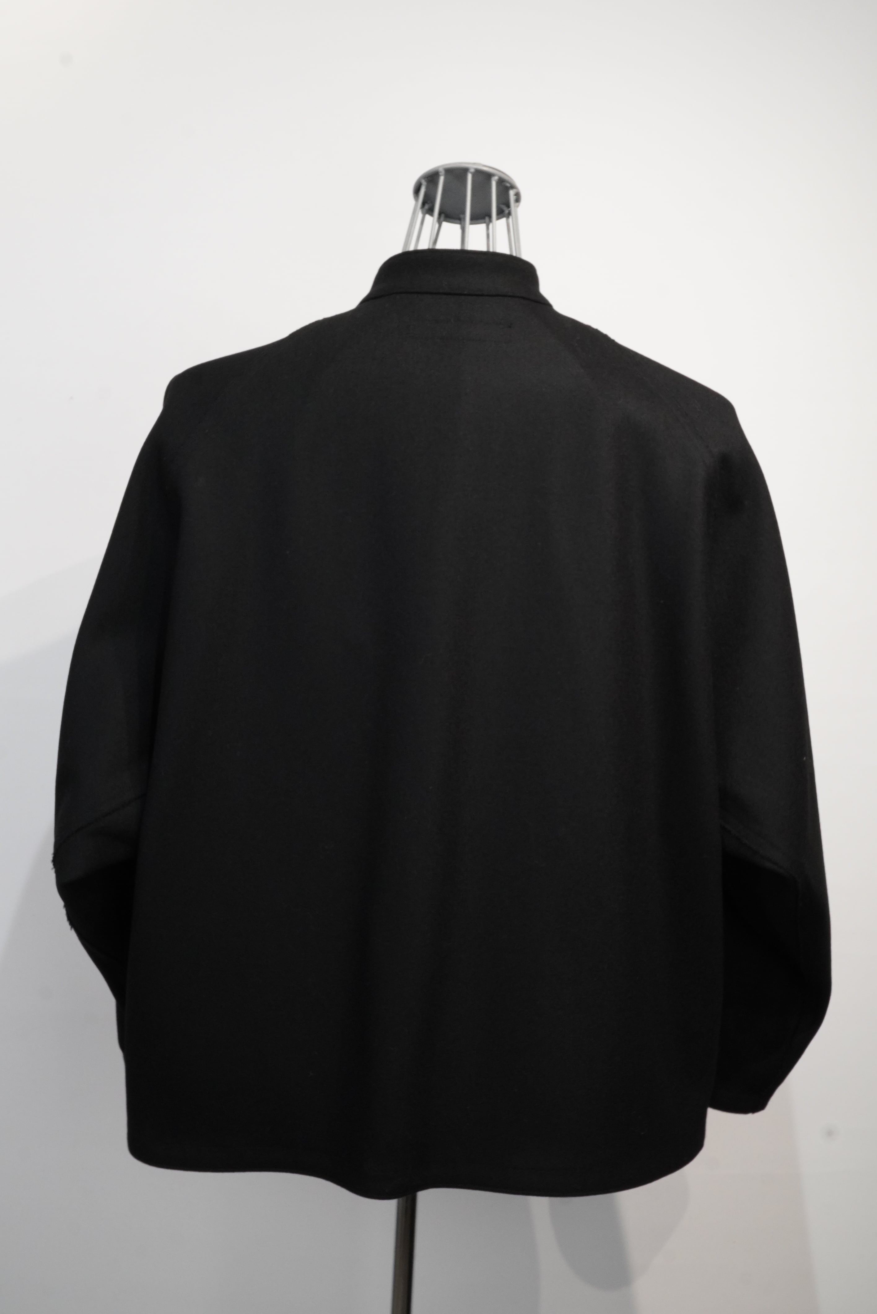 This stand-collar jacket is made from a single piece of HAVERSACK's original, tightly twisted vintage melton in a cut-off style. The raglan sleeves feature a large underarm gusset, which means the body doesn't get pulled down by the generous width, allowing for unrestricted arm movement and making it easy to wear. It's also perfectly fine to tuck a low-gauge knit underneath. The classic design, featuring decorative tape on the placket, creates an oriental feel. With this thickness, you won't even need a coat in the fall and winter. In fact, the jacket itself functions as a coat. Available in beige and black.