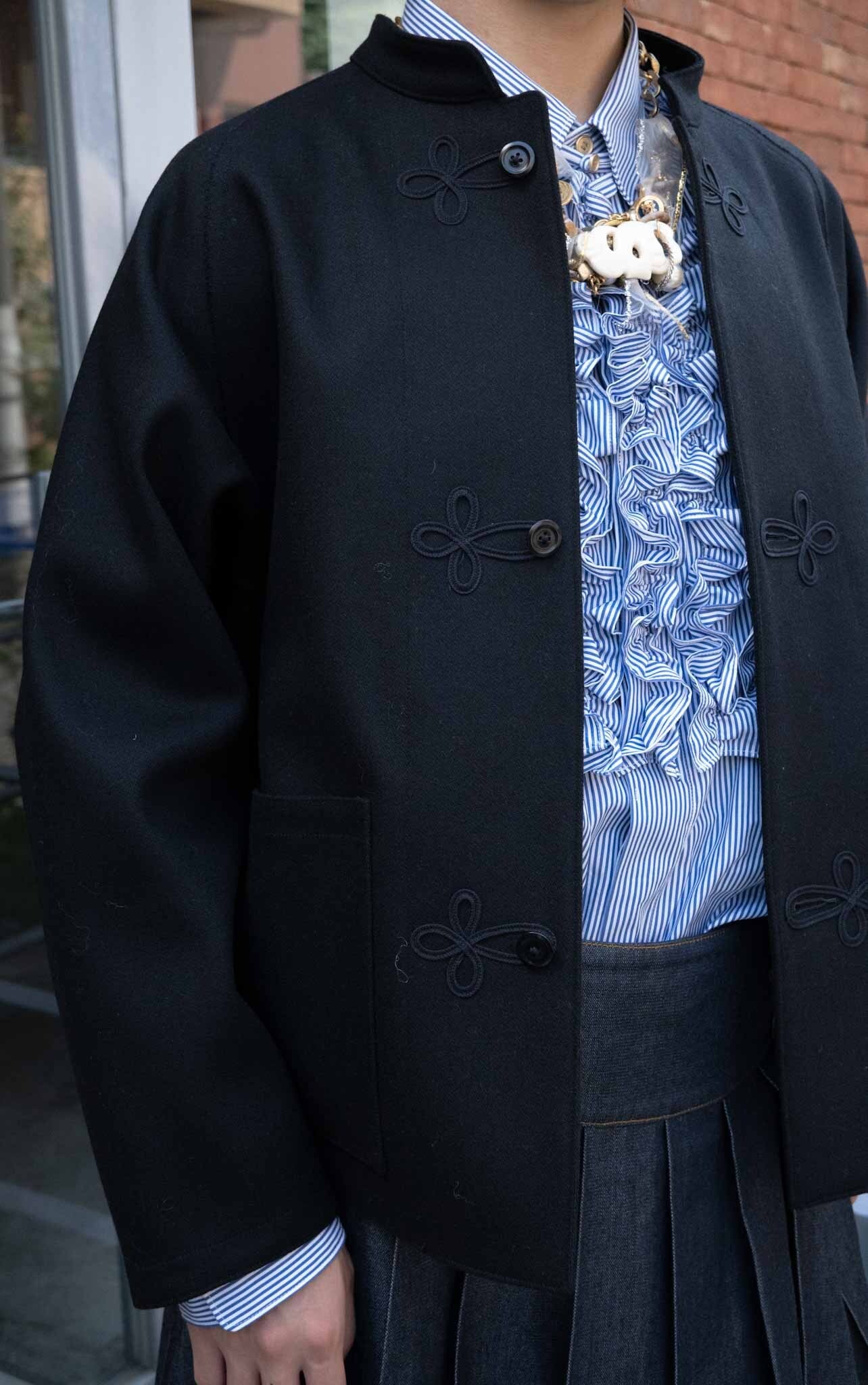 HAVERSACK オリジナルの強撚ヴィンテージメルトンをカットオフ仕様にした、1枚仕立てのスタンドカラージャケット。袖下の大きなマチが特徴のラグランスリーブを採用することで、身幅のゆとりにも身頃が引っ張られず、腕の可動域を妨げることなく、着やすい作りになっています。なのでローゲージニットを中にいれても全然大丈夫。前立てにテープの装飾をあしらった、クラシカルなデザインも特徴で、オリエンタルな雰囲気を醸し出しています。この厚さであれば秋冬もコートいらず。むしろこのジャケット自体がコートの役割となります。色はベージュとブラックをご用意しています。