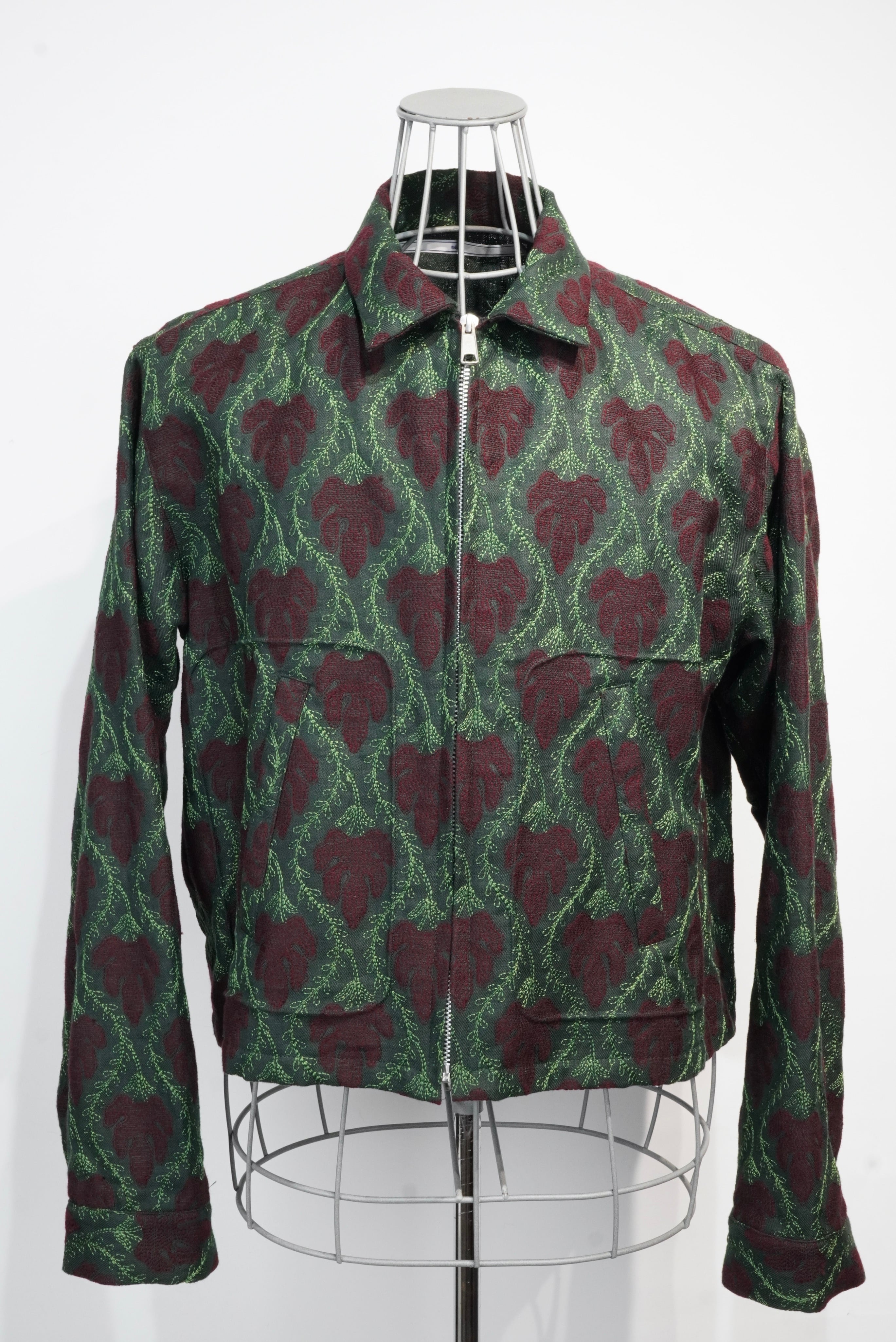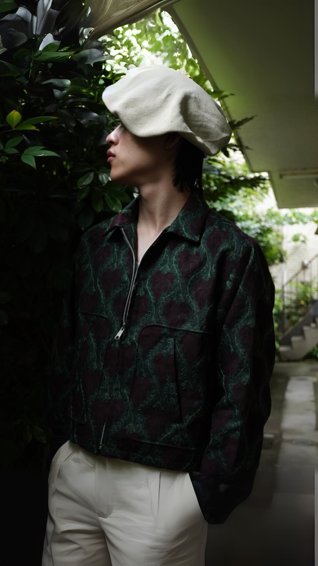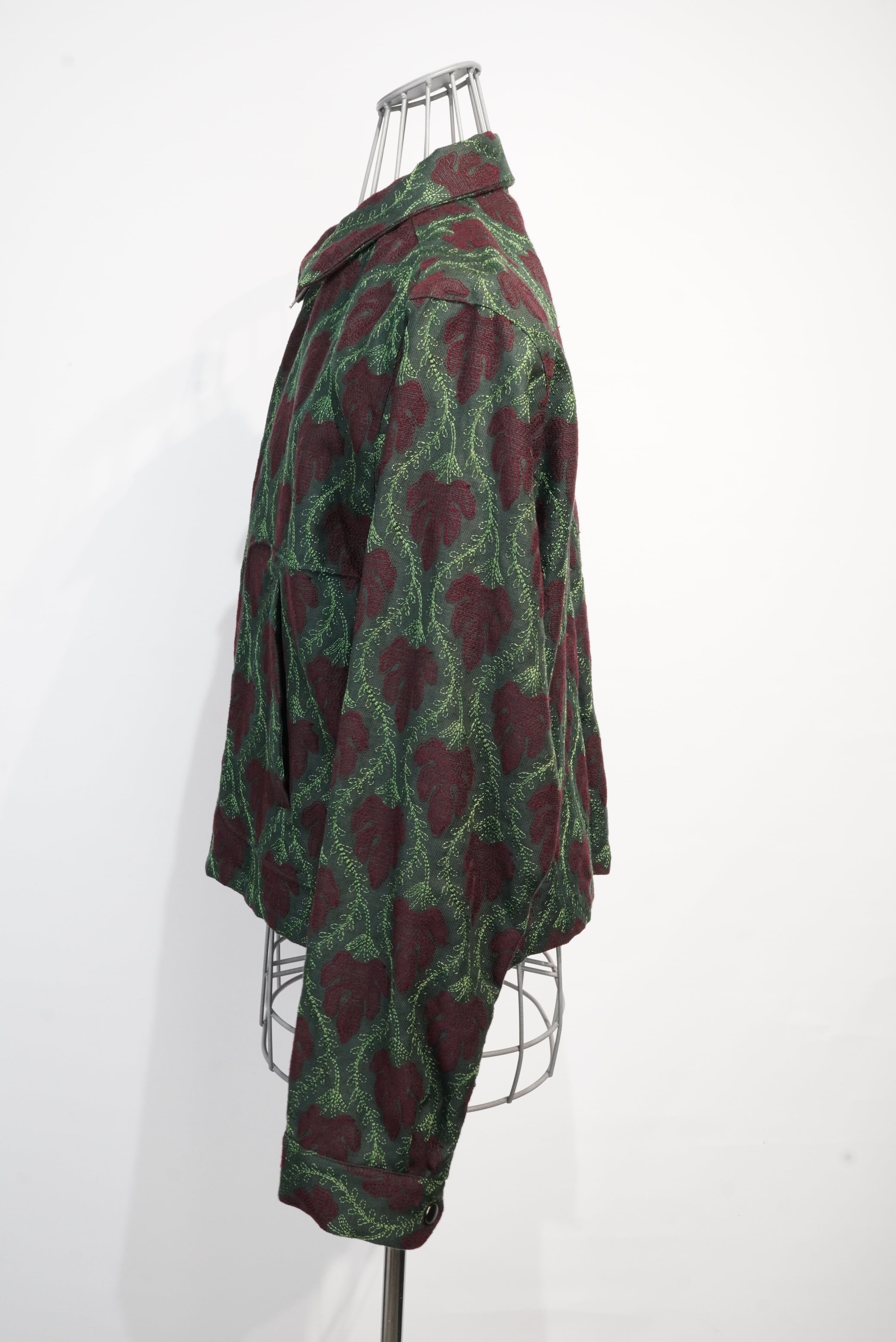 This jacket has a sophisticated feel with its botanical embroidery and deep green and vermilion leaf pattern. It is unlined and lightweight. It can be worn in multiple ways like a shirt. The length is intentionally kept short. It has a somewhat vintage drapery feel to it. The fabric is made from an original fabric created with great care by tokio. The designer himself says that this is his favorite item in this collection. It is highly versatile and can be worn all year round in any season.