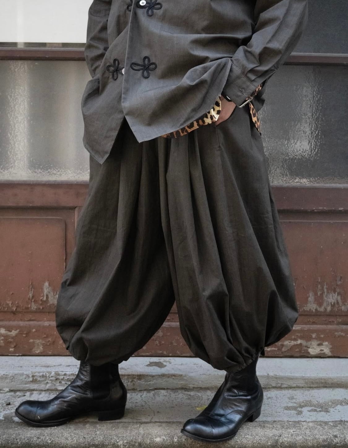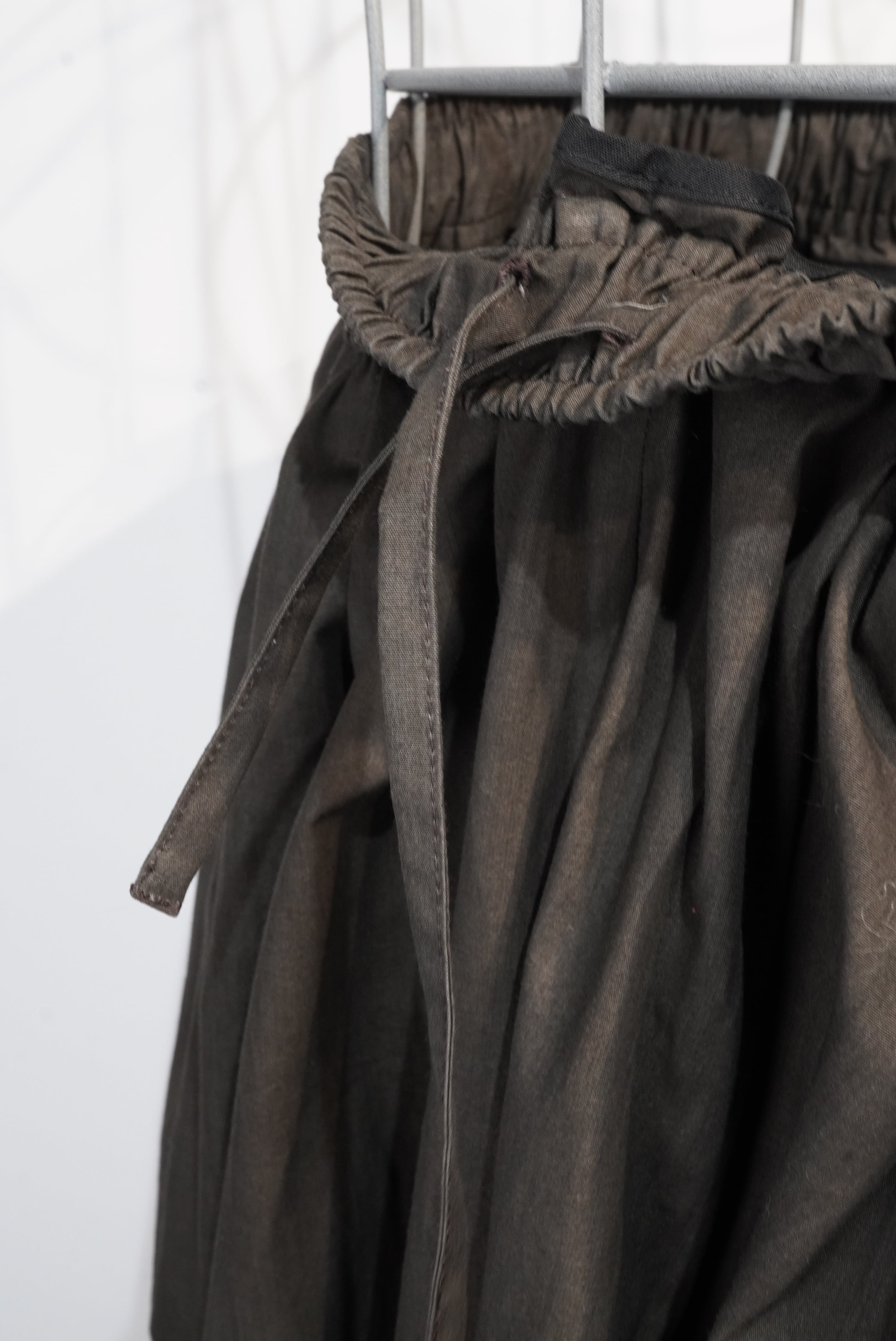 HAVERSACK has many classic pants, but if we had to pick one, it would be the "Zouave Panji." These HAVERSACK Zouave pants feature ample pleats and gathers for a voluminous look. The waist and hem are elastically shirred, allowing for adjustable hem length, creating a versatile look. The name "Zouave Pants" originates from the Zouave soldiers of the Algerian infantry of the French Army, formed in 1830 by the French colony of North Africa, primarily composed of Algerians and Tunisians. The balloon-shaped design, incorporating ethnic elements and functional ease of movement, is distinctive. Made from ink-dyed broadcloth, these pants feature the characteristic ink shading of ink paintings. We recommend pairing them with a matching sleeping shirt. Pairing this set with a jacket or coat will expand your wardrobe.