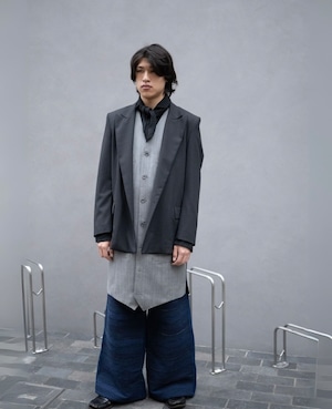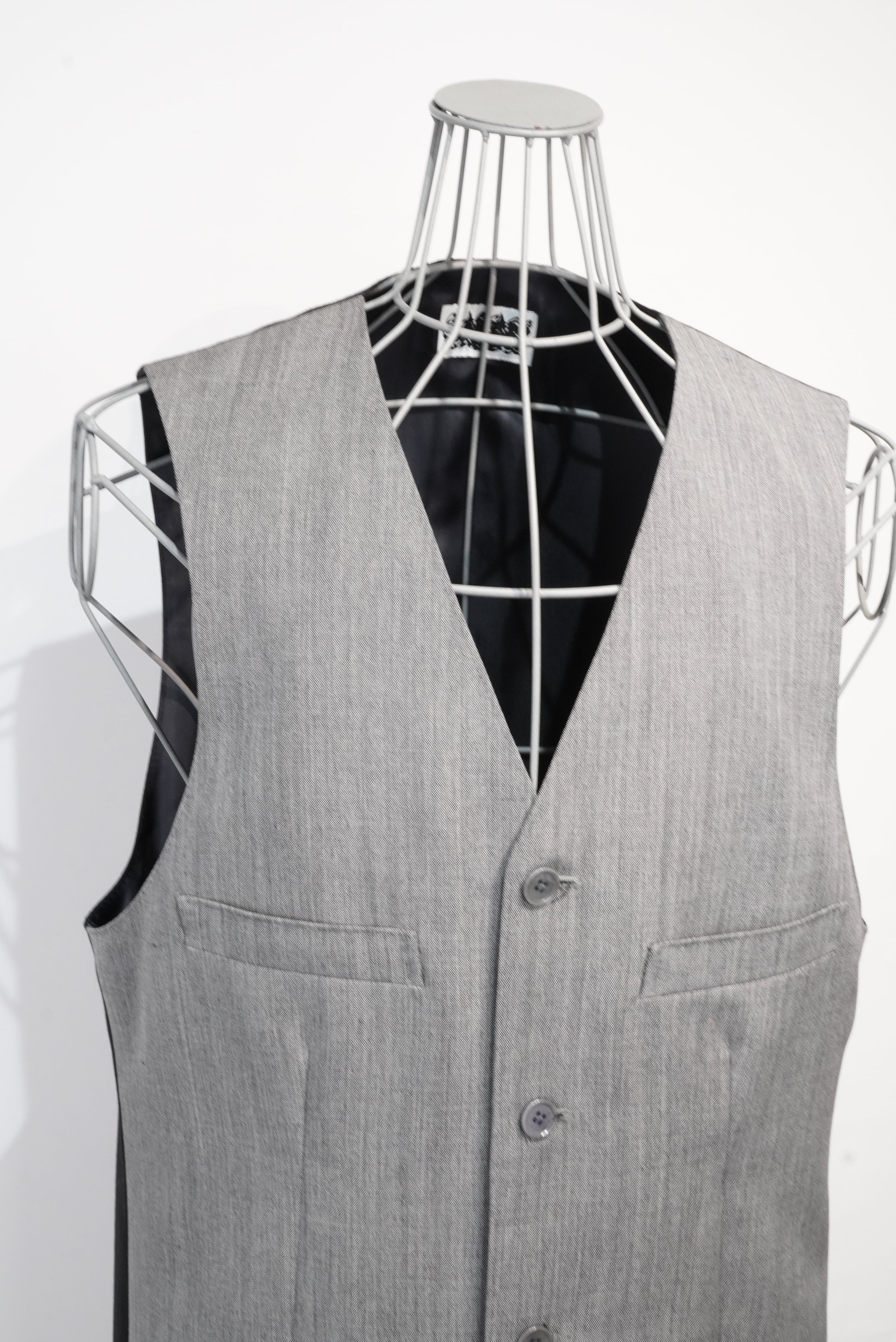 CLASSのシャークスキンジレ。ジレの着丈を膝丈まで長くしています。違和感のあるその長さは、1枚でインパクトを与えてくれますが、着丈を利用してレイヤードを楽しむのが最適。