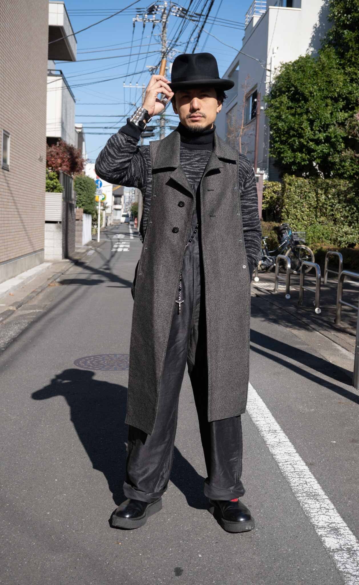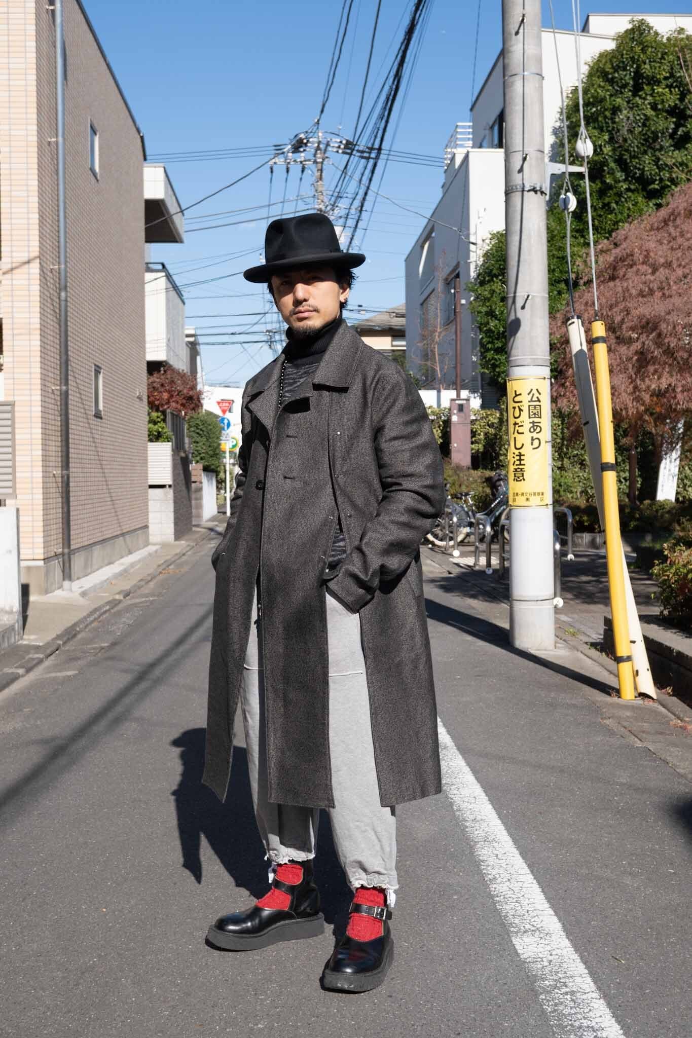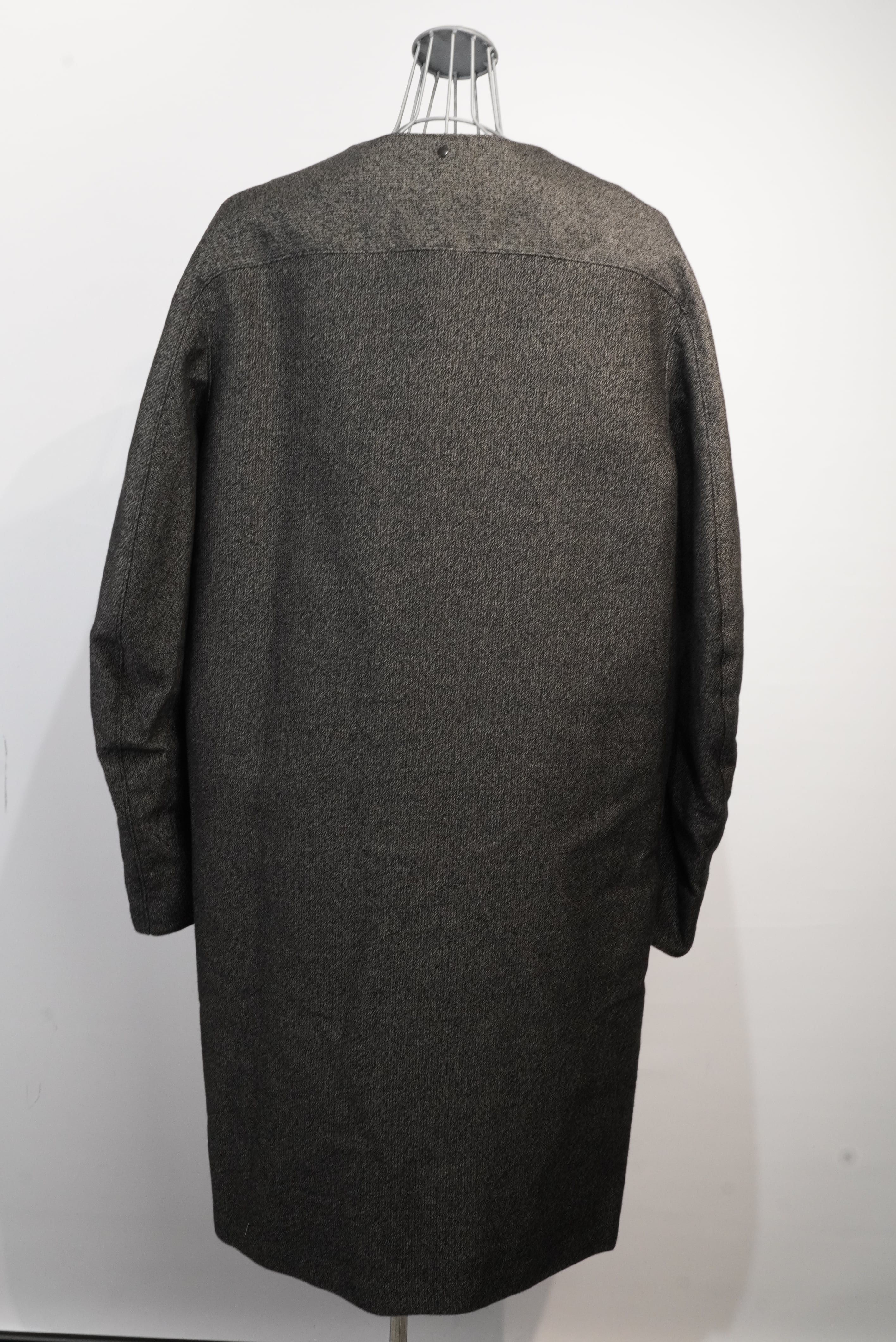 This coat is made from heathered cord cotton, reminiscent of vintage workwear. The front can be detached vertically. It can be used in three ways, as a vest or a collarless coat, separately. It has box pockets on the sides and buffalo buttons on the front. Snap buttons are sewn into various places, allowing for a variety of different looks. ARCD only makes sizes 48 to order. We recommend wearing it a little oversized so that it can be worn as a coat-in-a-coat.