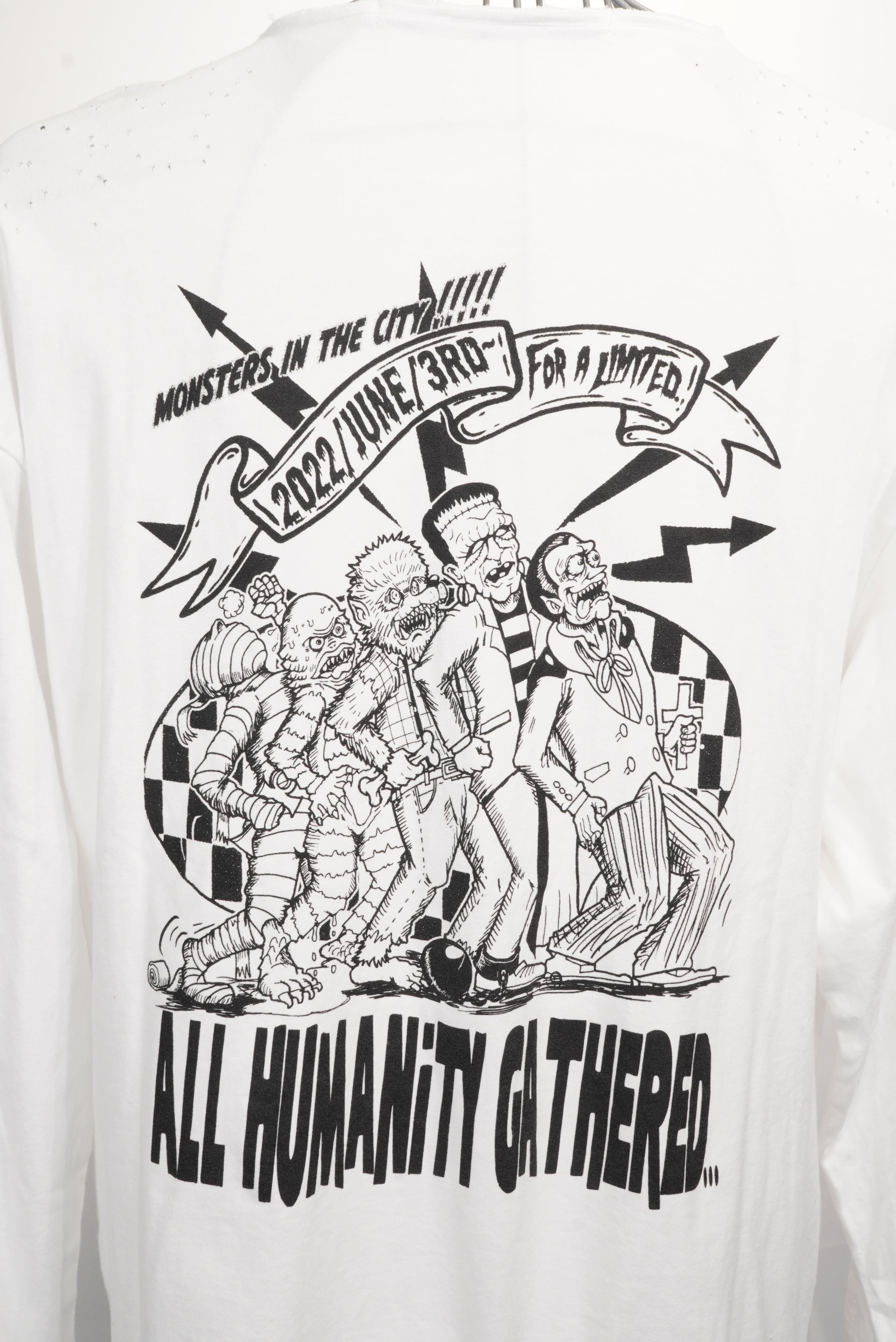 2025AWシーズンをスタートさせるにあたり、元々イメージの中にあったUKの匂いを表現することやI'mSTRANGERのテーマに基づき、ファッションは魔法、というところからカボチャの馬車が思いつき、それをいつもお願いしている点描アーティストに書いてもらったり襟ぐりを切り、ボディをボロボロにしたりしてみました。背面は実は2022年にイベントに併せて作った版ですが、前述のUK要素や魔法が解ける、にちなんで大好きなモンスター達を再度刷りました。配置の列や背面の矢印モチーフなど往年のスカファンには涙ものの内容。6人組はマッドネスというスカバンド。矢印のバンドはそこに書いてある、デッド60sとなります。背後の市松模様もスペシャルズからもらいました。