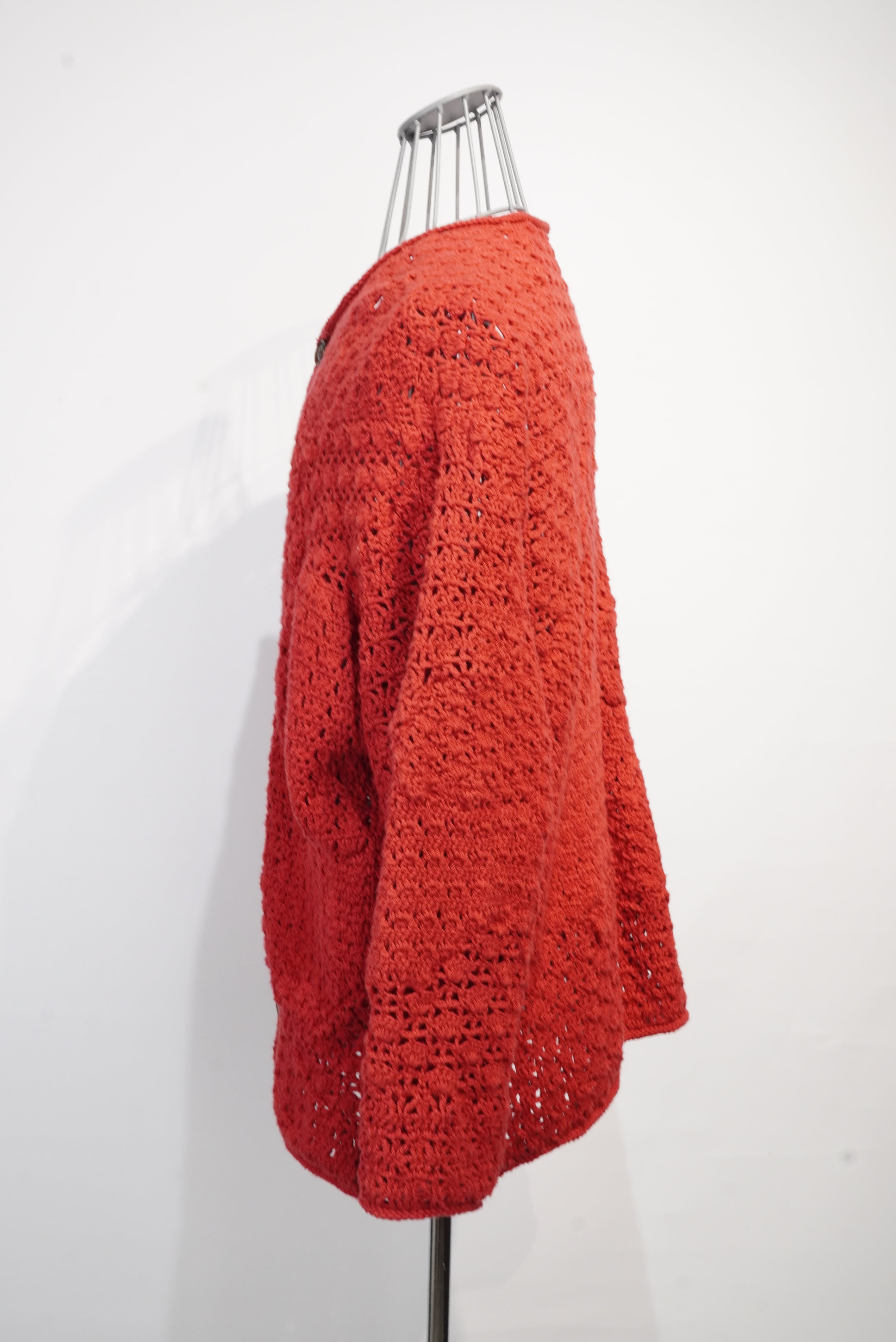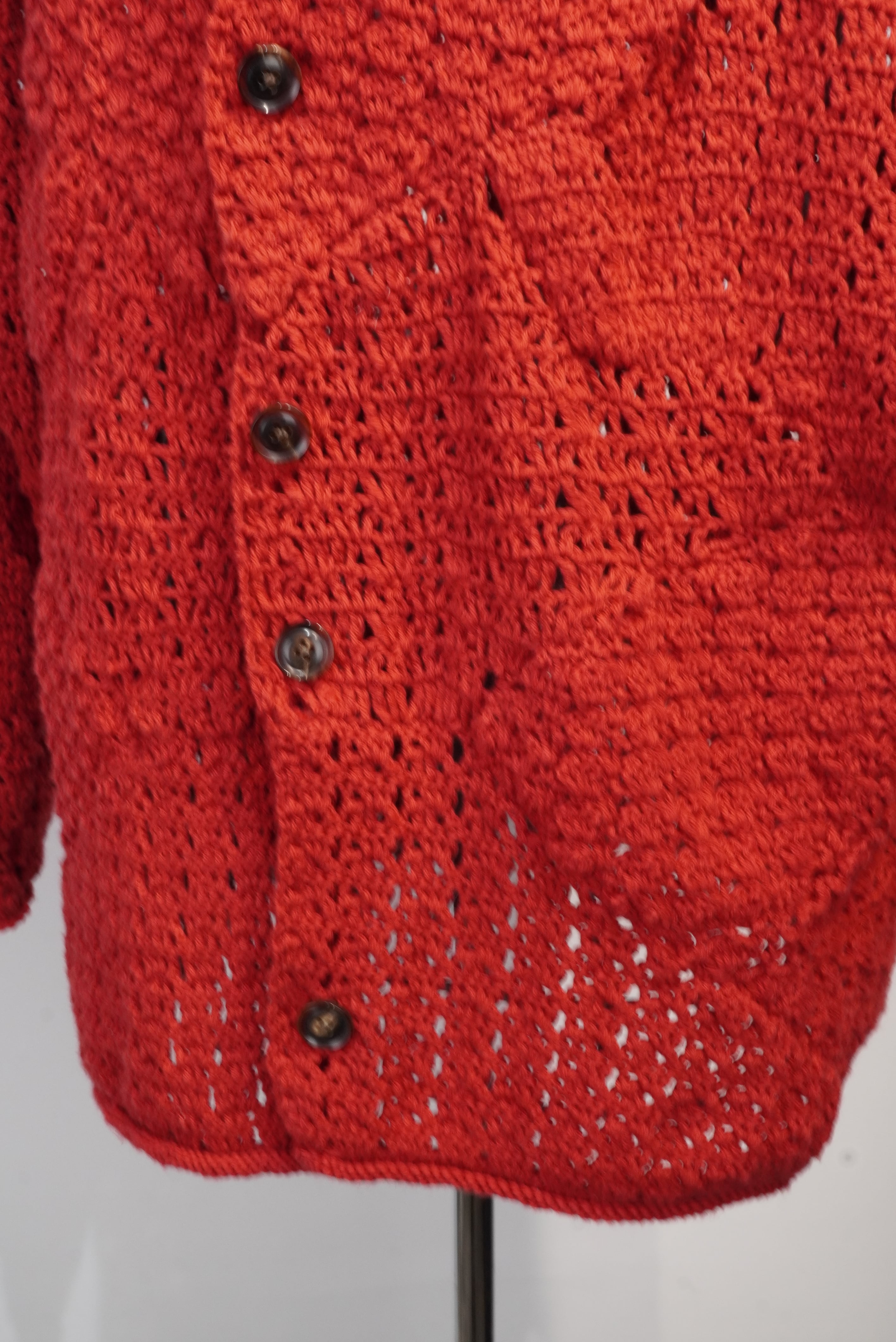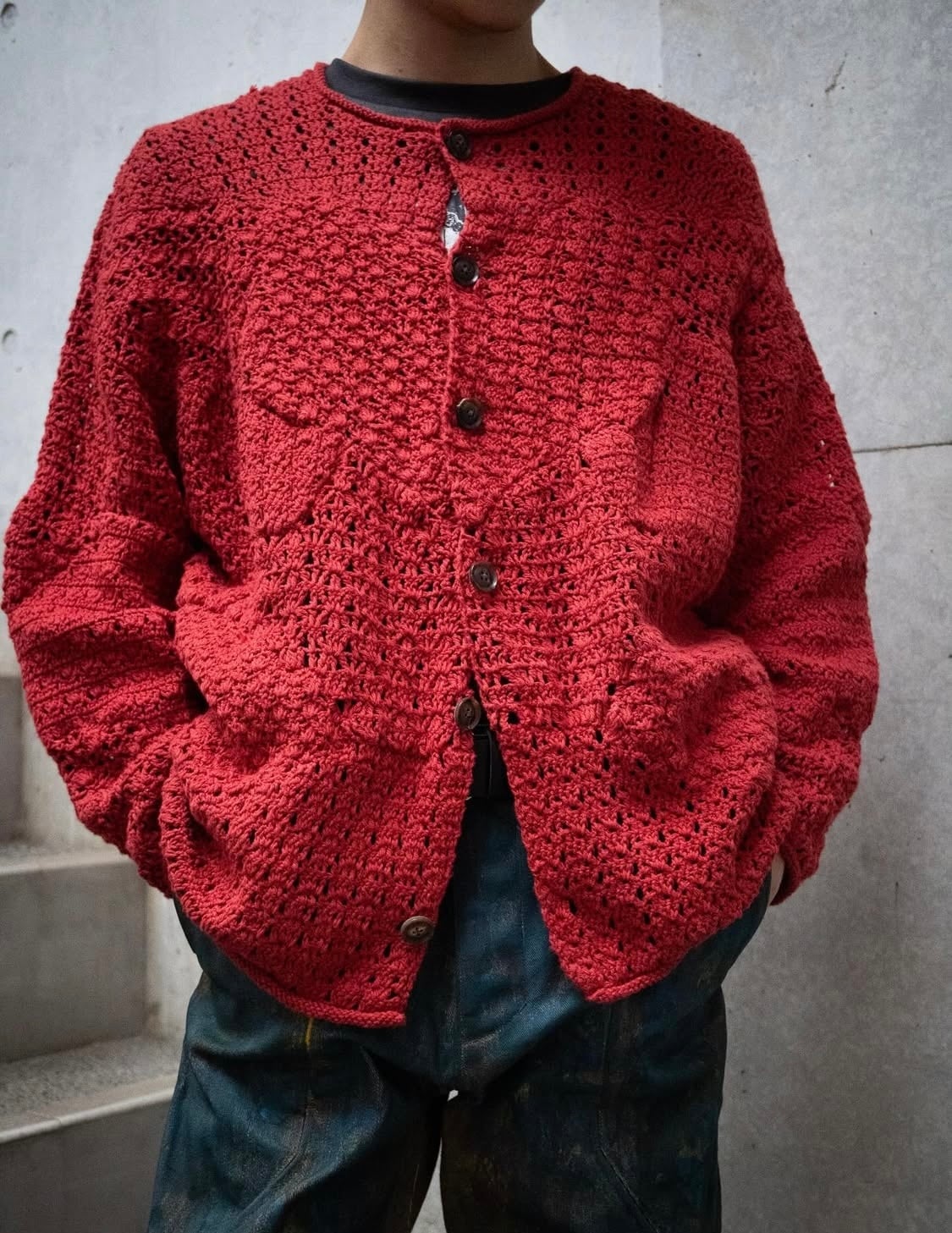 ハンドメイドニットアーティストのYUKINORIONO氏に依頼し作成したハンドメイドニットカーディガン。手染めと釜で2段階で染色した、鮮やかで深みのあるコットン 100%の糸は通年に適した滑らかな肌触りが特徴。STEAF オリジナルの編み地2種類の柄とオリジナルのメッシュの2種類の柄をランダムに組み合わせたパッチワークは正に職人の匠な技術が光る作品。ネック部分の編み終わりの処理もハンドでロールネックにしているのと、フロントのシックな天然の水牛も特徴的です。季節は関係なく気兼ねなく羽織っていただけるアイテムかと思います。