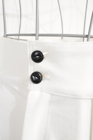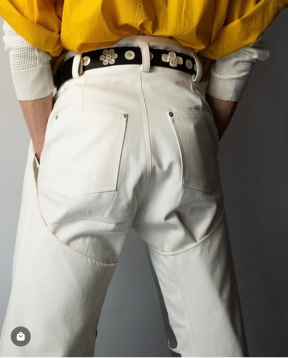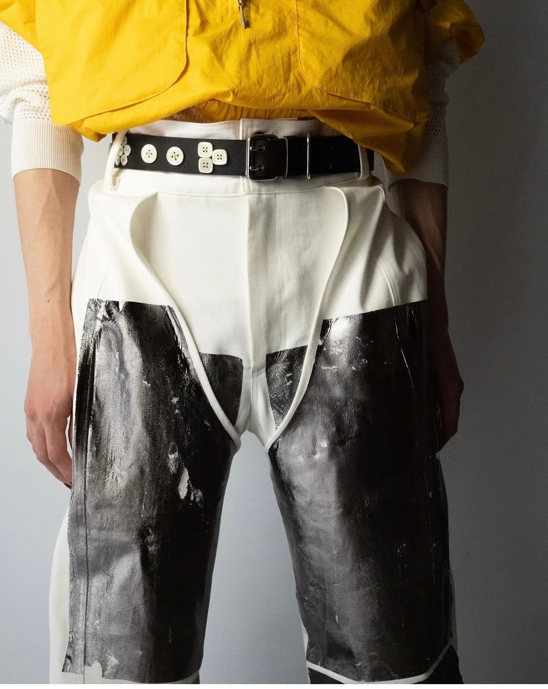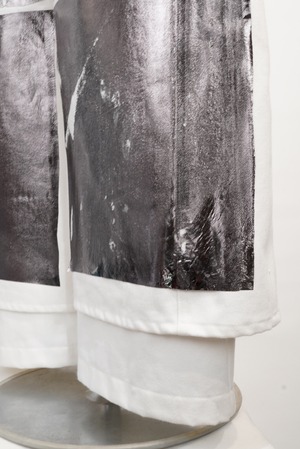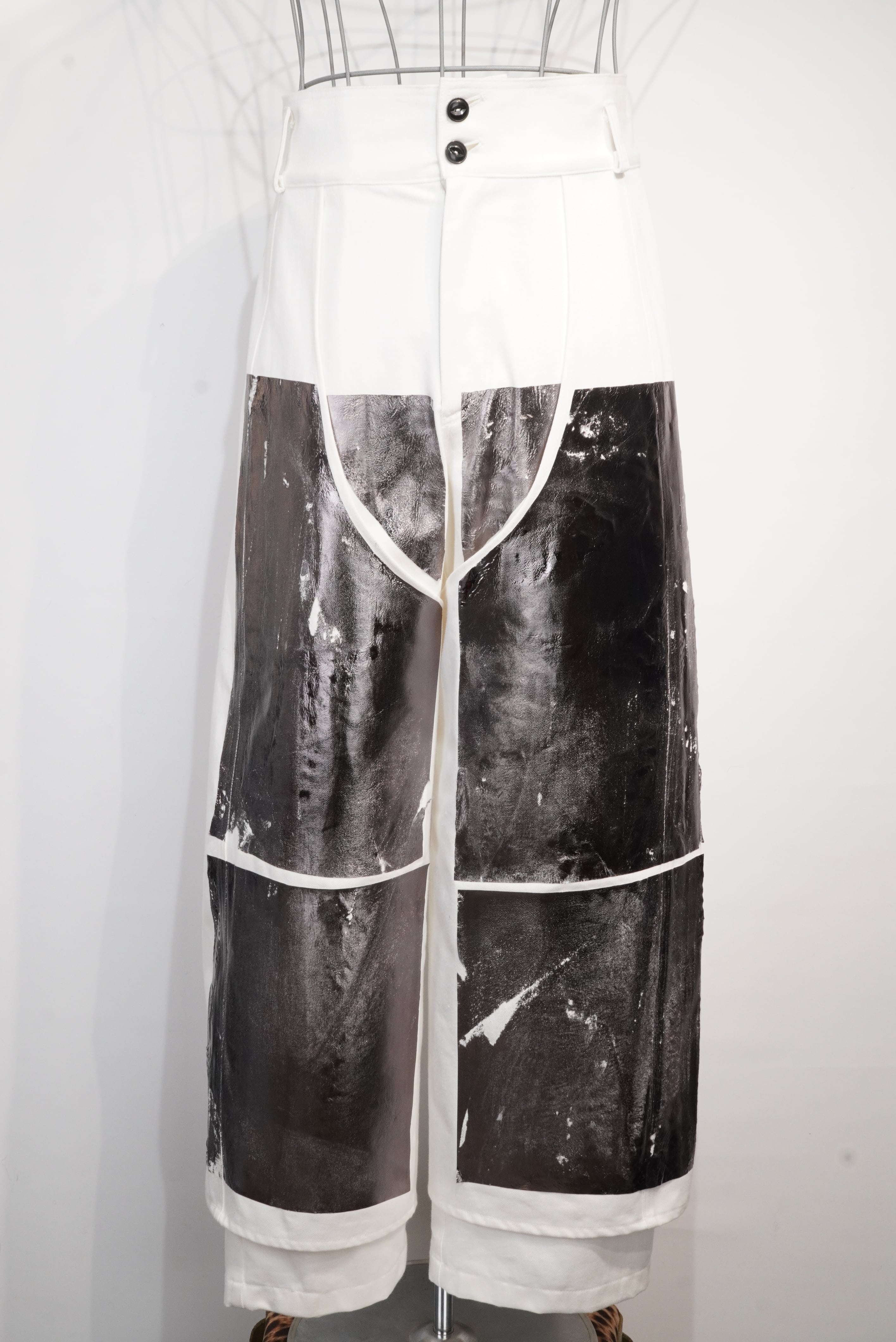 ホワイトのパンツにシルバーの箔をいれた特殊なパンツ。普通の白パンツにチャプス (chaps)と言うカウボーイがズボンの上から履く革製のズボンカバーをイメージしドッキングしたレイヤードパンツ。もともとは、灌木や棘から身を守るために使われていたチャプスですが、その独特なデザインはフアッション性の高さを感じます。経年変化で少しシルバーの箔が剥がれてきたりする事でまた独自の存在感へと昇華していきそうです。