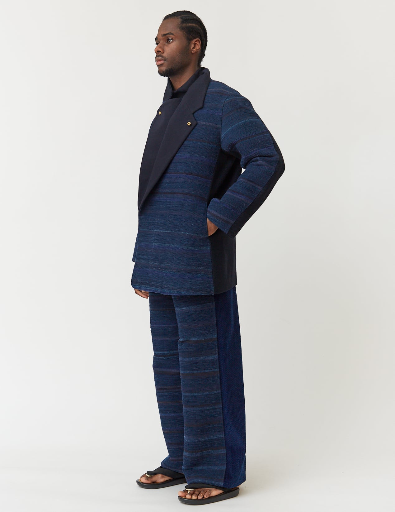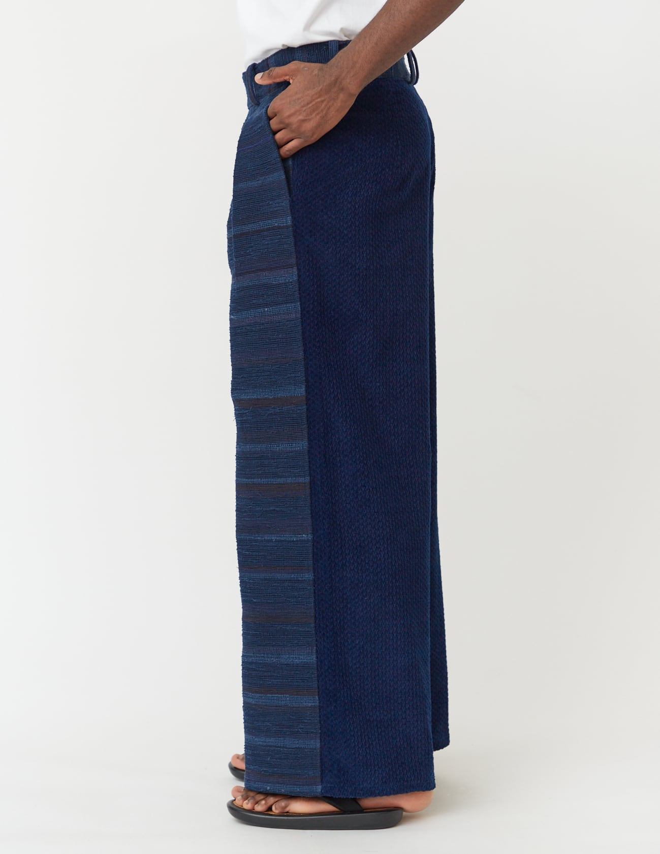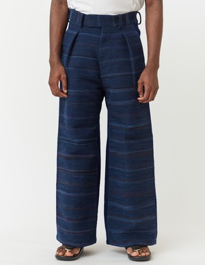 These baggy pants from NOBNAGA Paris feature deep inside tucks for a relaxed fit, flaring dramatically at the hem. The front is made of sakiori fabric, a traditional Japanese craft, while the back features Japanese indigo corduroy. This collection, inspired by Western armor and Japanese military uniforms, is based on the theme of "contrast." To recreate the seamless, structured design of armor, which conforms to the body, thick fabric is used for the front and front sleeves, while a contrasting, thinner fabric is used for the back and back sleeves to maintain functionality. While navy and khaki are the collection's primary colors, the front and back are unified in similar tones, rather than a color scheme. This emphasises the contrast in texture while keeping other contrasts subtle.