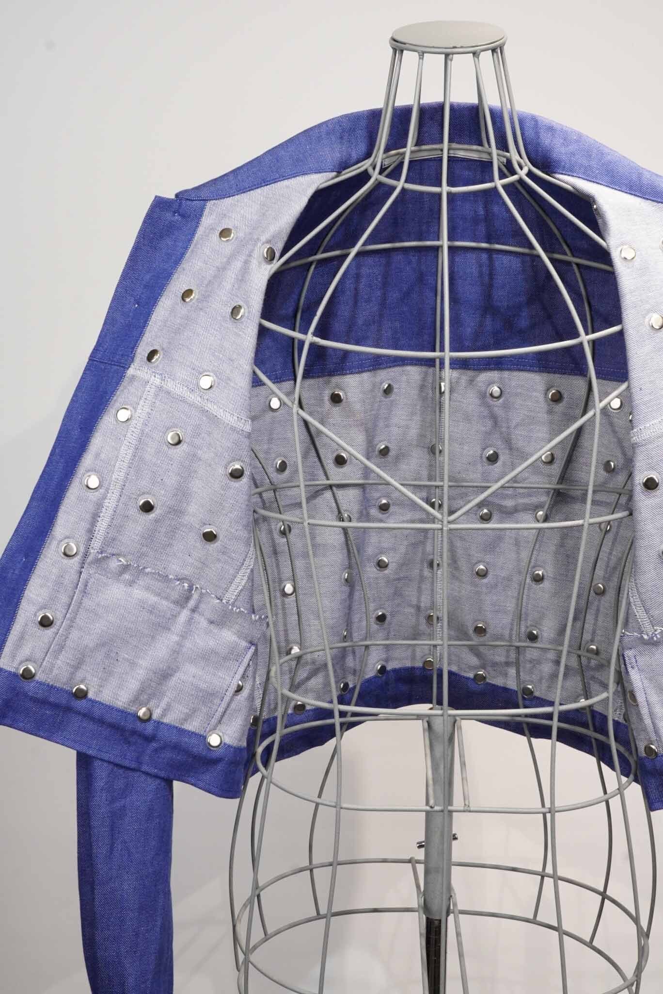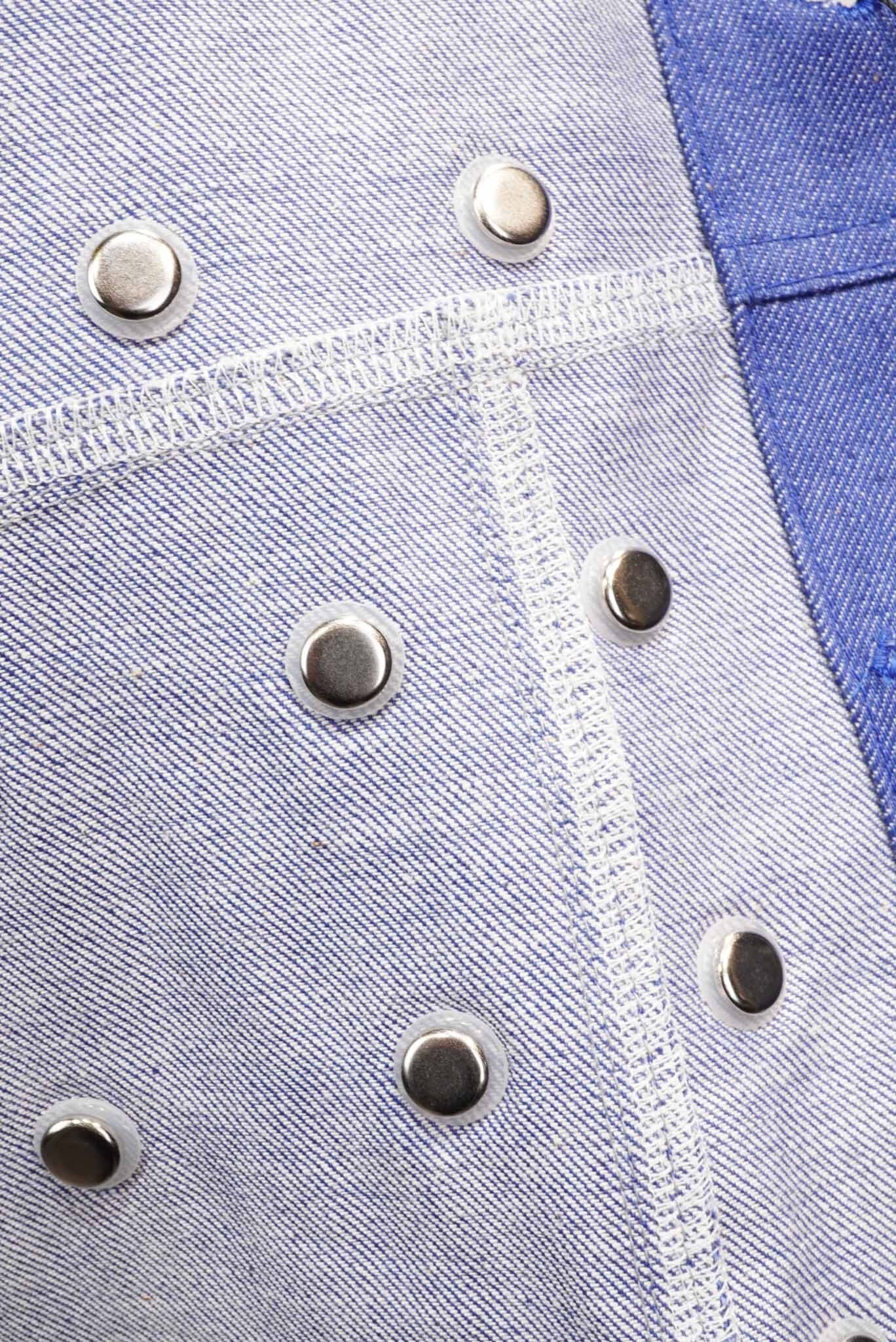 This denim jacket is studded with the largest studs we've seen on the Japanese market. It all started when I saw a jacket in a vintage shop covered in large, round, and faded African-inspired studs that were so large they could be mistaken for top-hole sequins. This inspired me to create a short jacket that ties in with this season's theme of immigration and the 70s. The denim color, the font of this season's theme, ImSTRANGER, and the concho buttons on the pockets all add to the vibe.