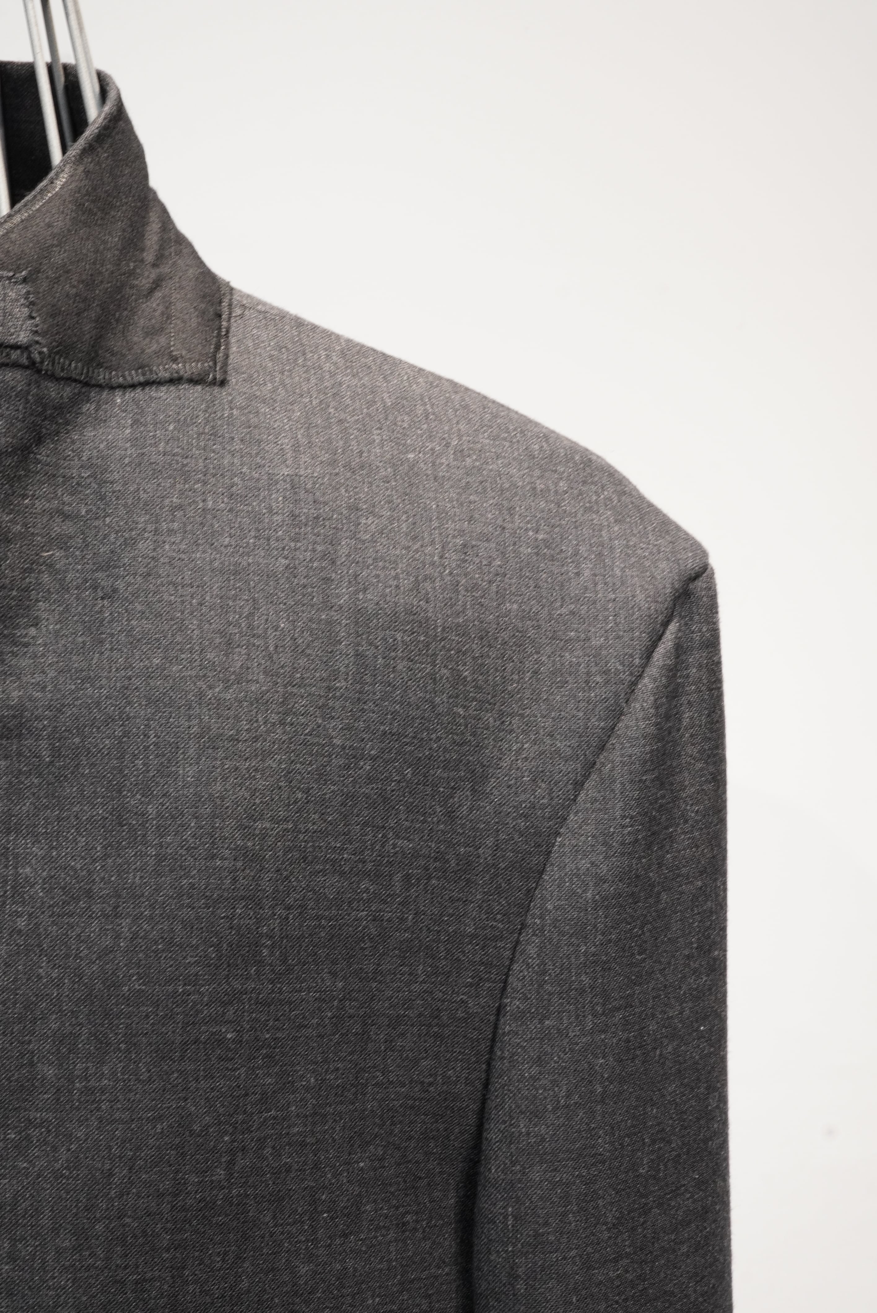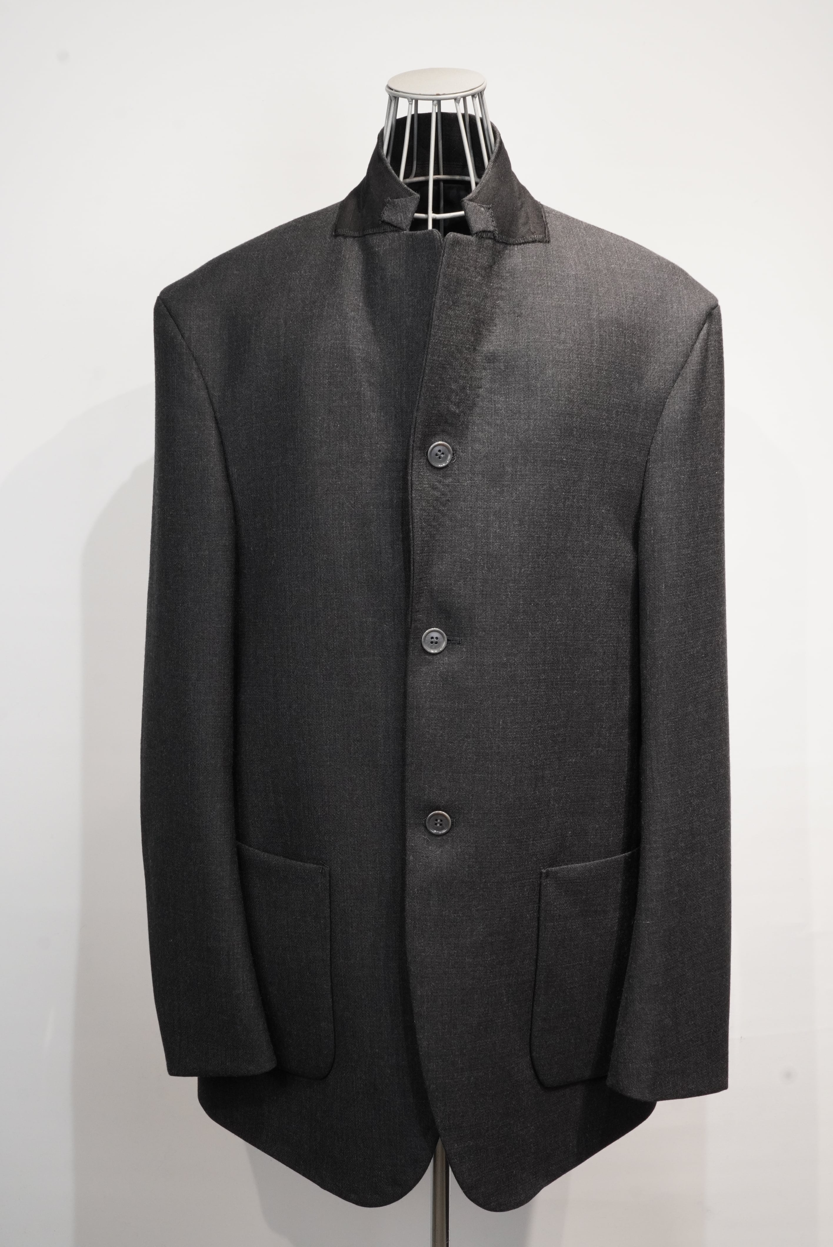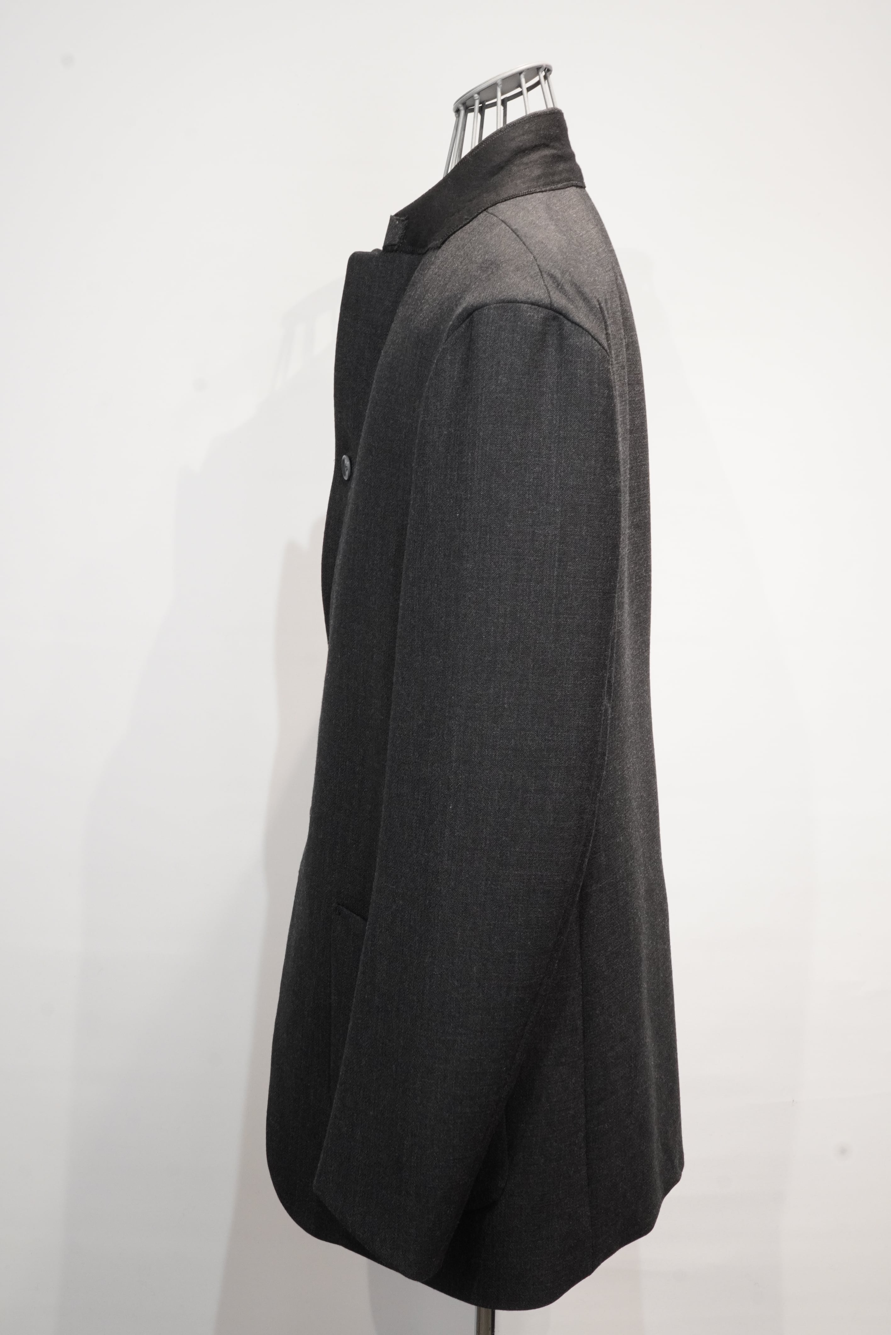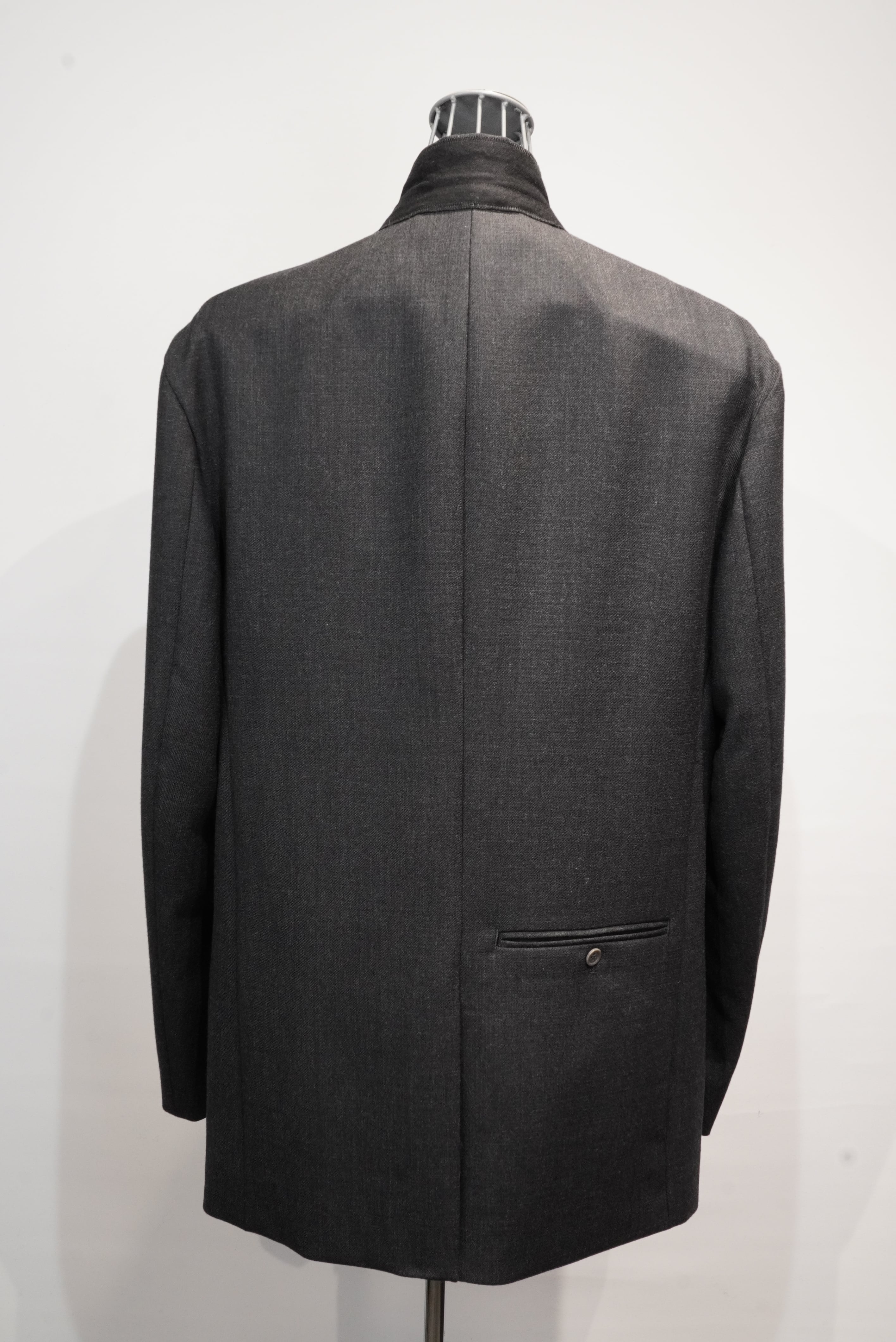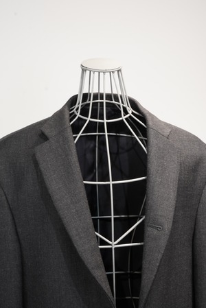 その為、独特の見頃高のショルダーを形成しております。アレンジとして、トラウザースを吐いてるように見えるパックポケットや、襟を立てて着用するとハーフコートのように見えるのも特徴の一つです。素材はドーメル社のトニックウールを二重織した、重量感とはりのある独特の素材を使用しております。