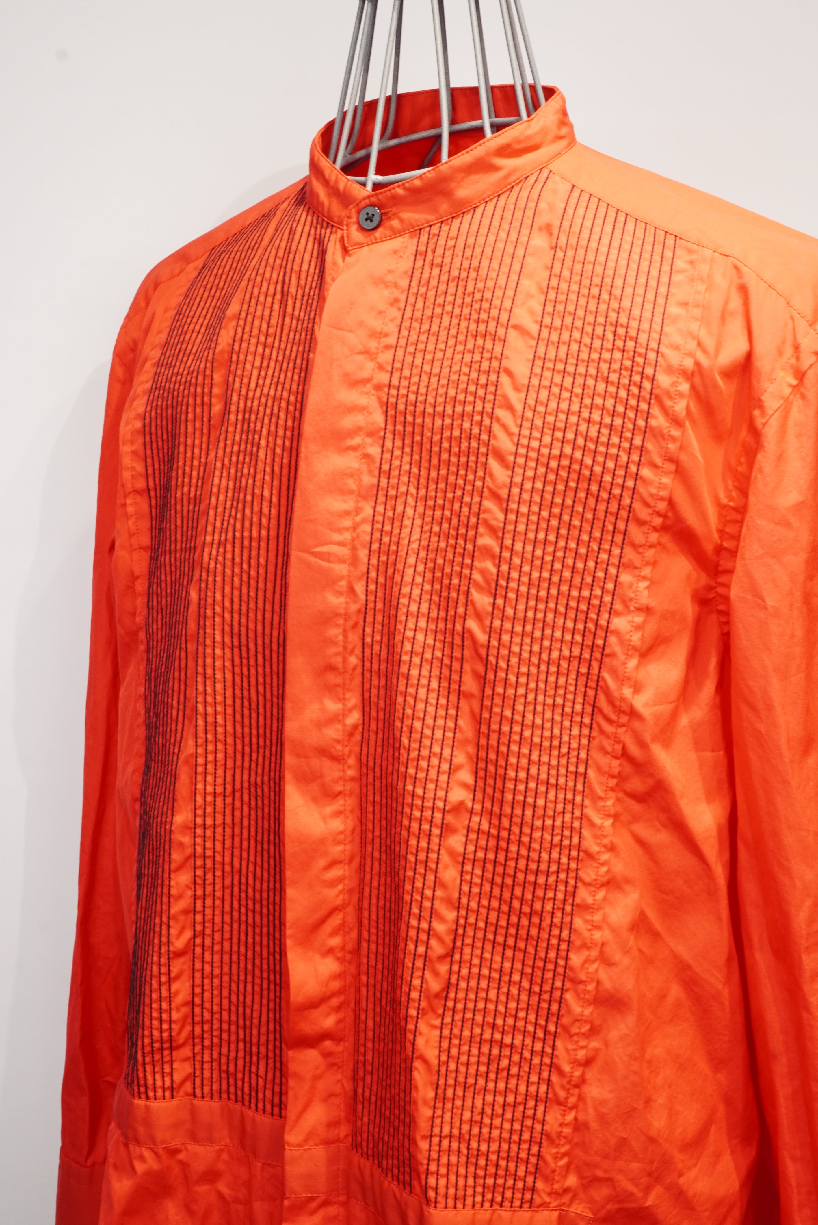 フロントの細かなチェーンステッチで、ピンタックのミシンがけがされており、しっかりと丈夫であることに加え、ステッチ部分が立体的に見え、表情が豊かになっています。着丈は程よく長めに設定し、昔ならではのクラシカルな雰囲気。ボタンは比翼仕様で、襟元はバンドカラー。後身頃に深いプリーツ、フロントサイドにプリーツを入れることによって、立体感を出しています。質のよい布地の選定と、高い職人技が合わさった素晴らしいシャツ。ピンタックが美しい陰影を作り品のある表情のシャツは、ドレスダウンにも使えますしインナーとしても程よいエレガントさを加えてくれ、インパクトを与えます。