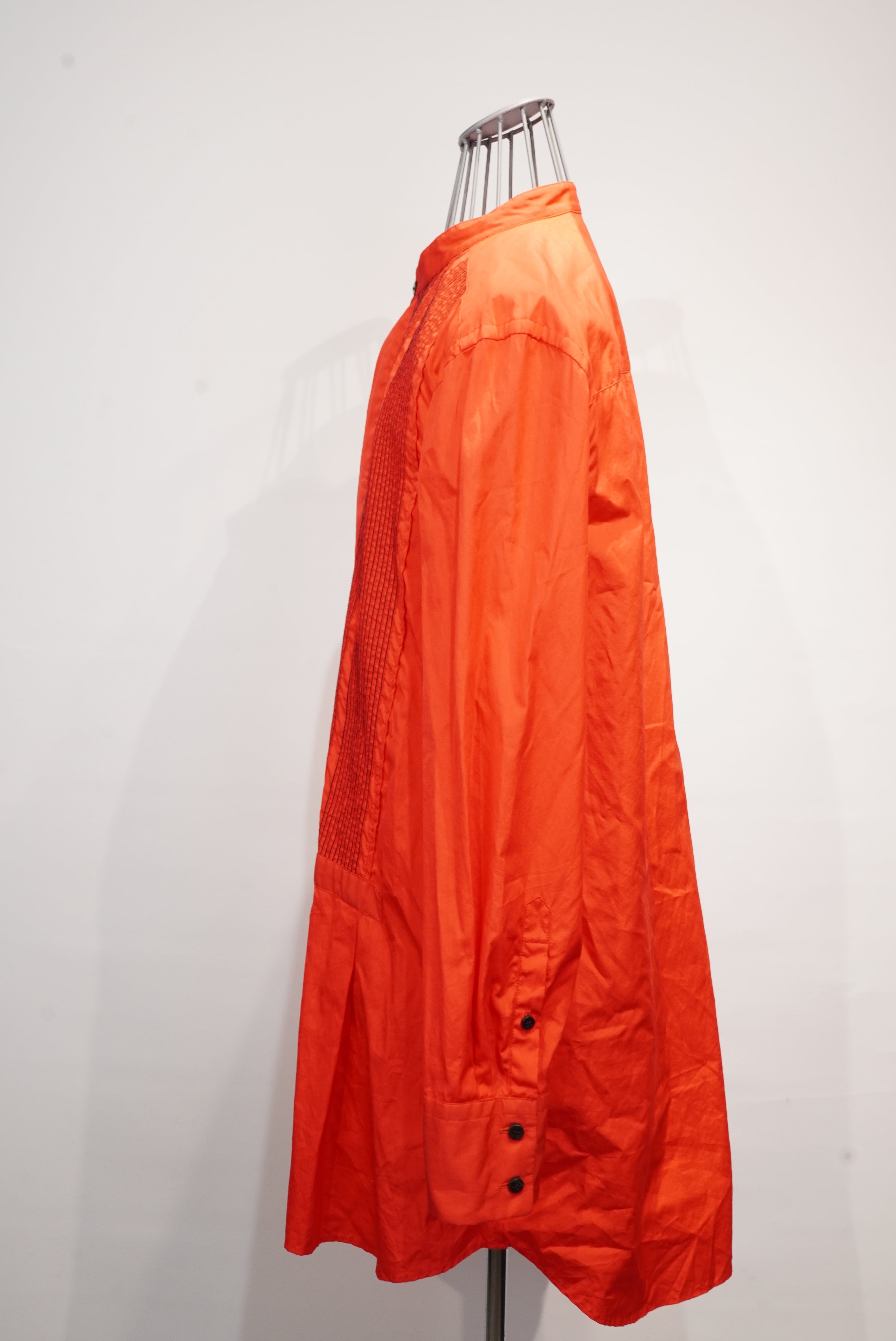 The fine chain stitching on the front, created by machine-sewn pintucks, not only makes the shirt sturdy and durable, but also adds a three-dimensional look to the stitching, adding a rich texture. The length is just long enough to create a classic, nostalgic feel. It features concealed buttons and a band collar. Deep pleats on the back and side pleats on the front create a three-dimensional effect. This exquisite shirt combines high-quality fabric selection with exceptional craftsmanship. The pin tucks create beautiful shadows and give the shirt a refined look, making it suitable for dressing down or as an inner layer, adding just the right amount of elegance and making an impact.