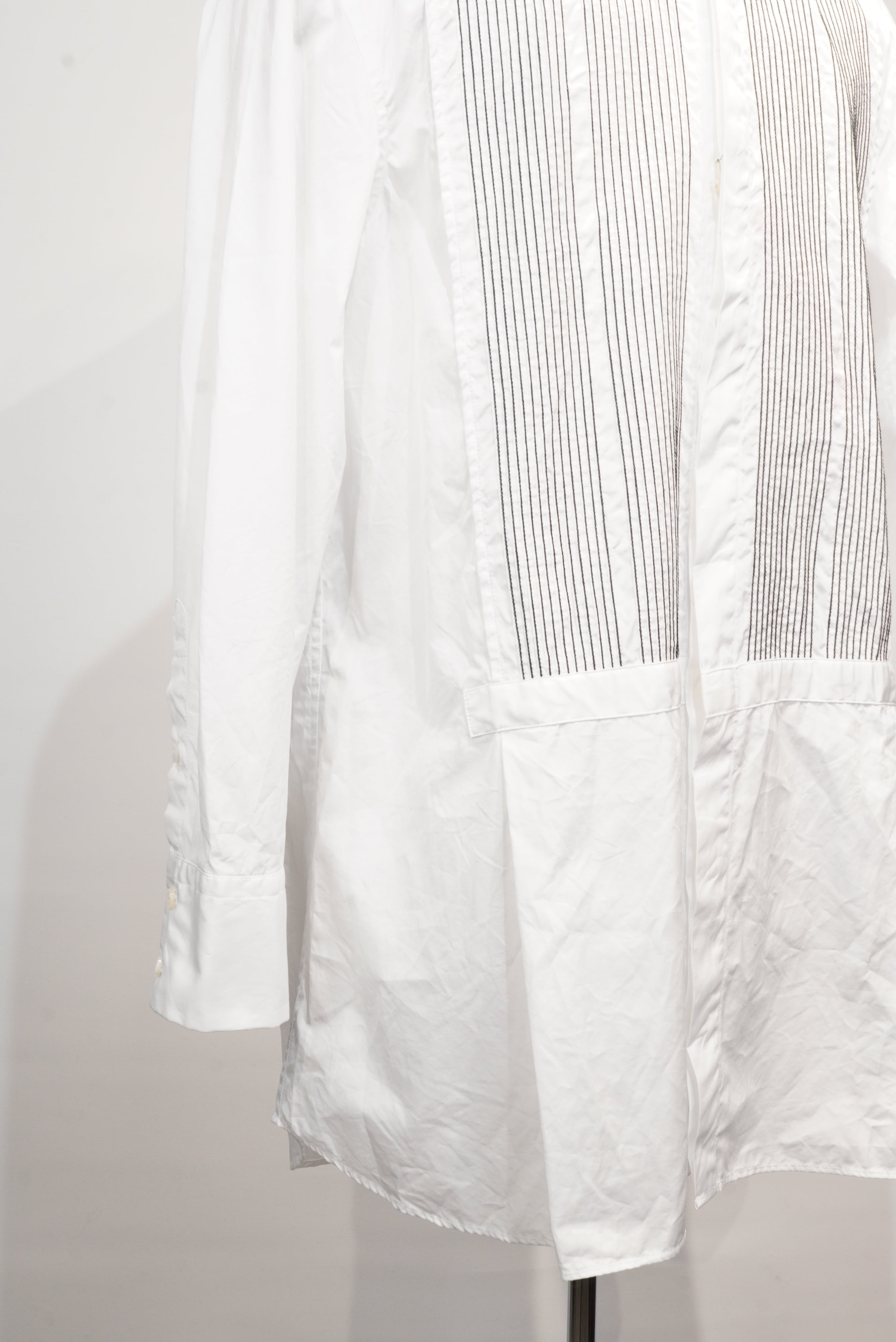 フロントの細かなチェーンステッチで、ピンタックのミシンがけがされており、しっかりと丈夫であることに加え、ステッチ部分が立体的に見え、表情が豊かになっています。着丈は程よく長めに設定し、昔ならではのクラシカルな雰囲気。ボタンは比翼仕様で、襟元はバンドカラー。後身頃に深いプリーツ、フロントサイドにプリーツを入れることによって、立体感を出しています。質のよい布地の選定と、高い職人技が合わさった素晴らしいシャツ。ピンタックが美しい陰影を作り品のある表情のシャツは、ドレスダウンにも使えますしインナーとしても程よいエレガントさを加えてくれ、インパクトを与えます。