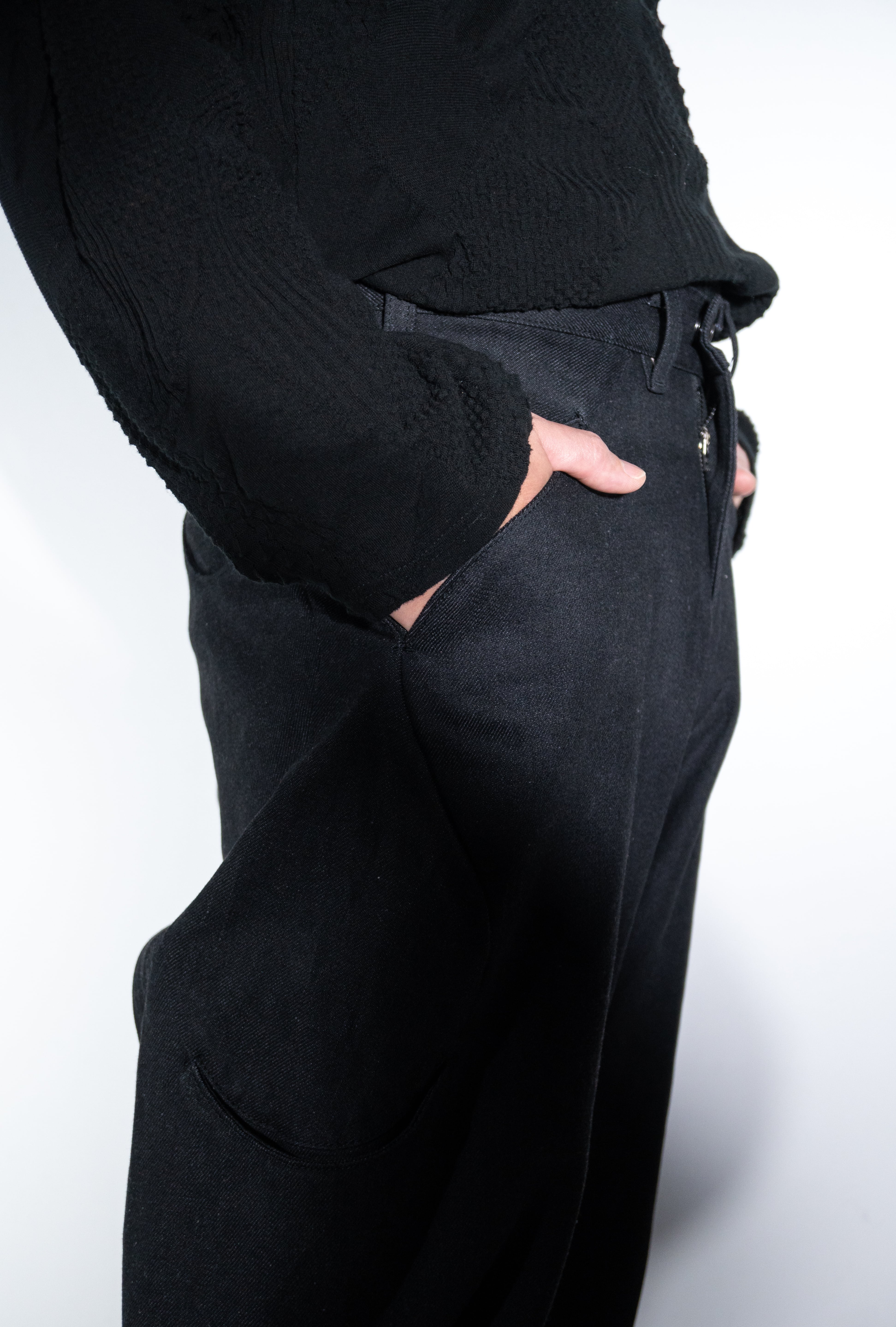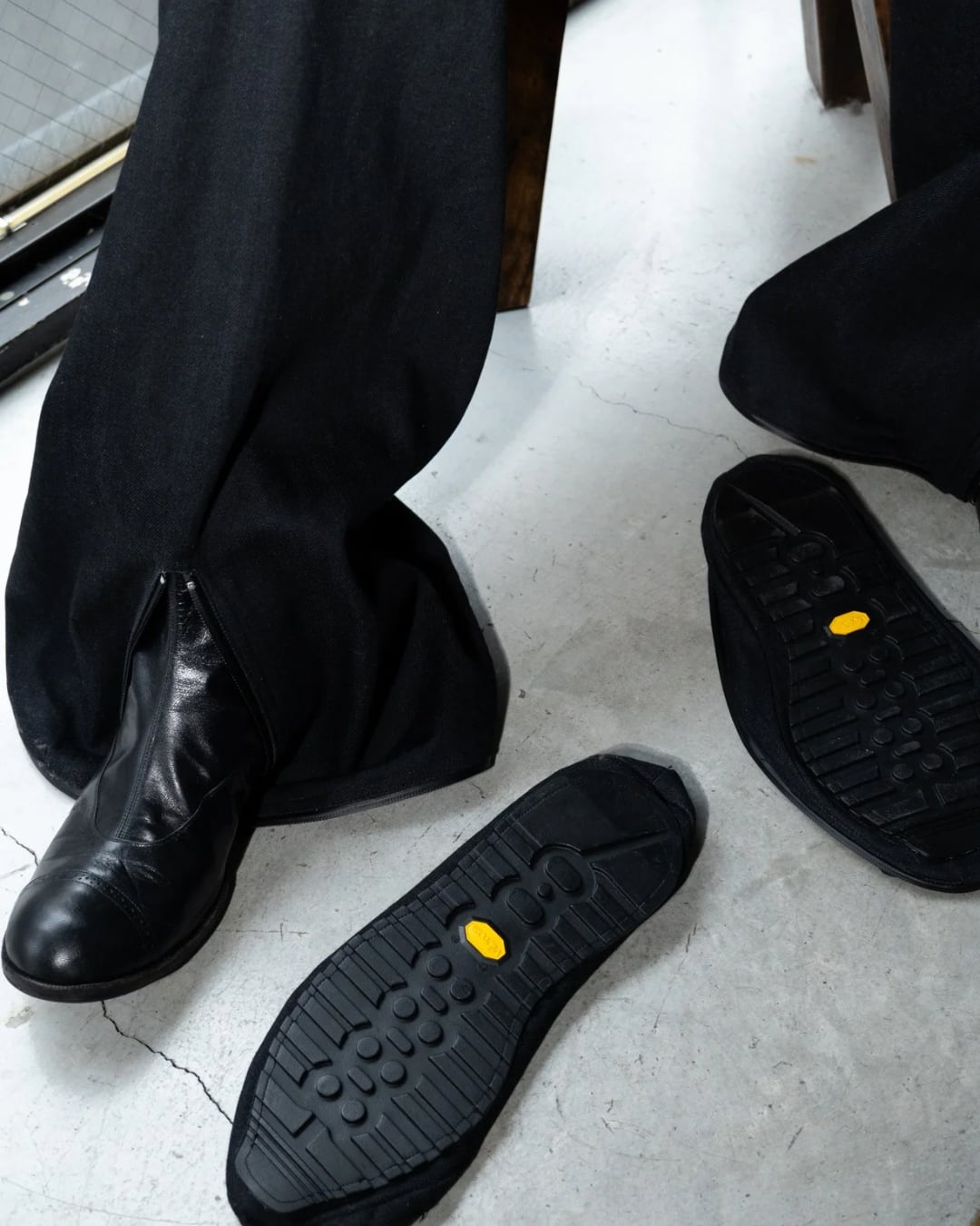 2025AWシーズンはAliens(異星人)より着想を得て製作。Vibramソールをドッキングした、岡山産デニムを使用したパンツ。1960年代のワークウェア Frisko Jeensより着想を得て作成。大きく3面構成されており一筆書きの様に曲線を描きながら、後ろヨークから前へポケットの機能を加えながら繋がっています。また脇線をなくすことにより着月時のストレスを軽減する仕様で、表面が平面になるようにデザインし、平面の中に機能を加えています。Vibramソールは着脱が可能。