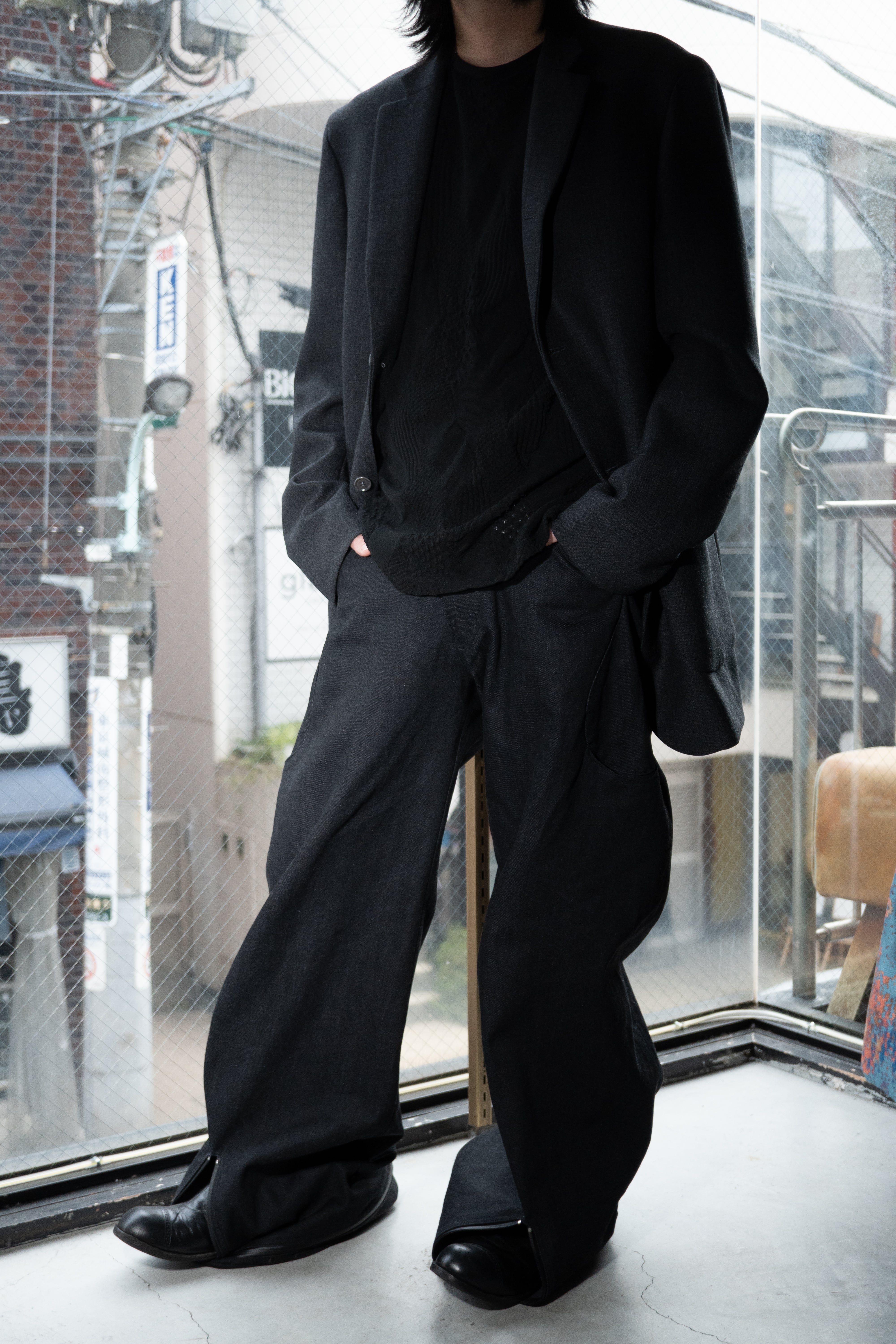 The 2025 Autumn/Winter collection is inspired by Aliens. These pants are made from Okayama-produced denim and feature a Vibram sole. They were inspired by 1960s workwear, the Frisko Jeans. They are made up of three large sides, with a curved silhouette that resembles a single stroke, and connect from the back yoke to the front, adding the functionality of a pocket. The elimination of side seams reduces stress when landing on the ground, and the design allows the surface to be flat, adding functionality to the flat surface. The Vibram sole is removable. The toes of the shoes can be exposed through the zipper, allowing them to be seen from inside the pants.