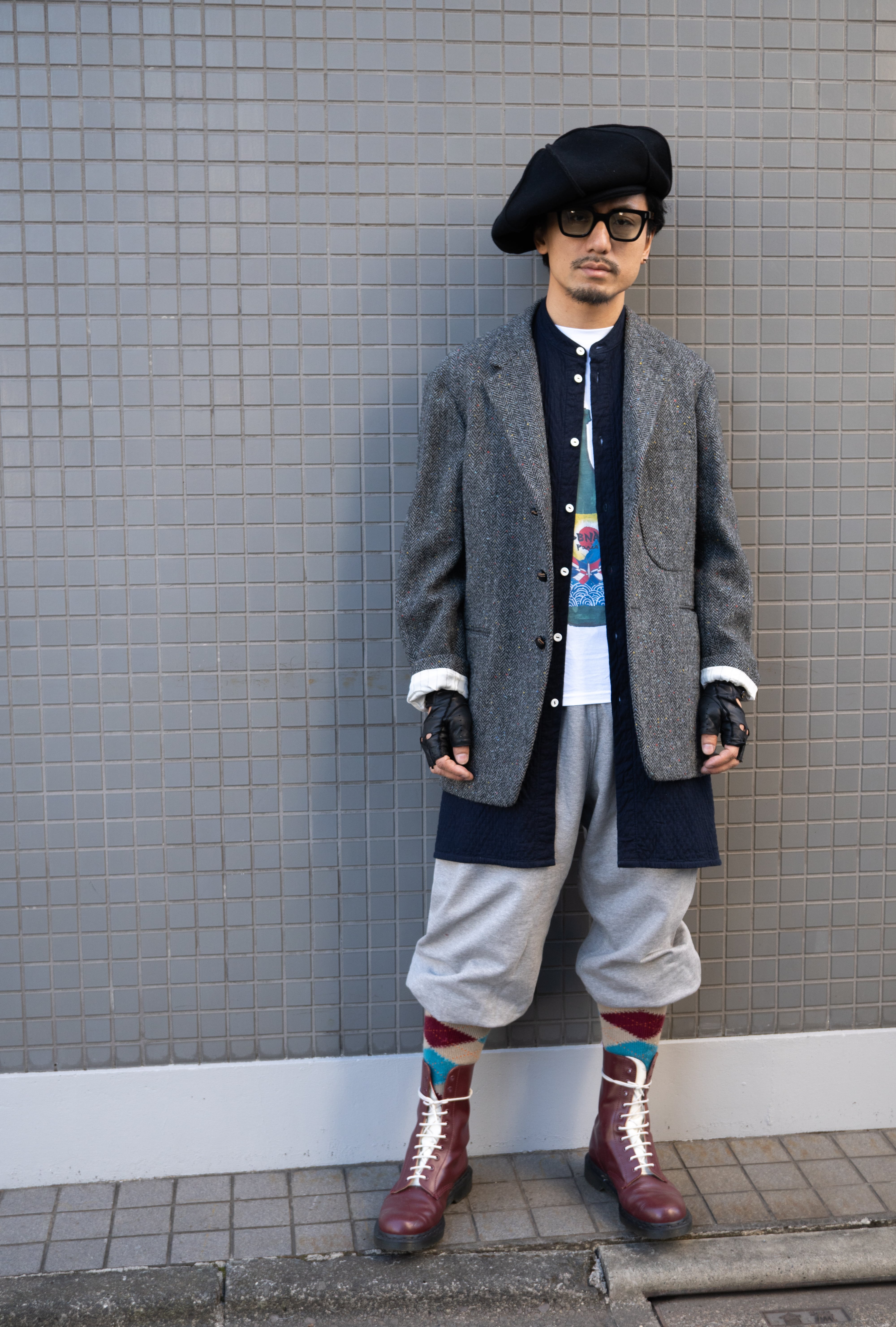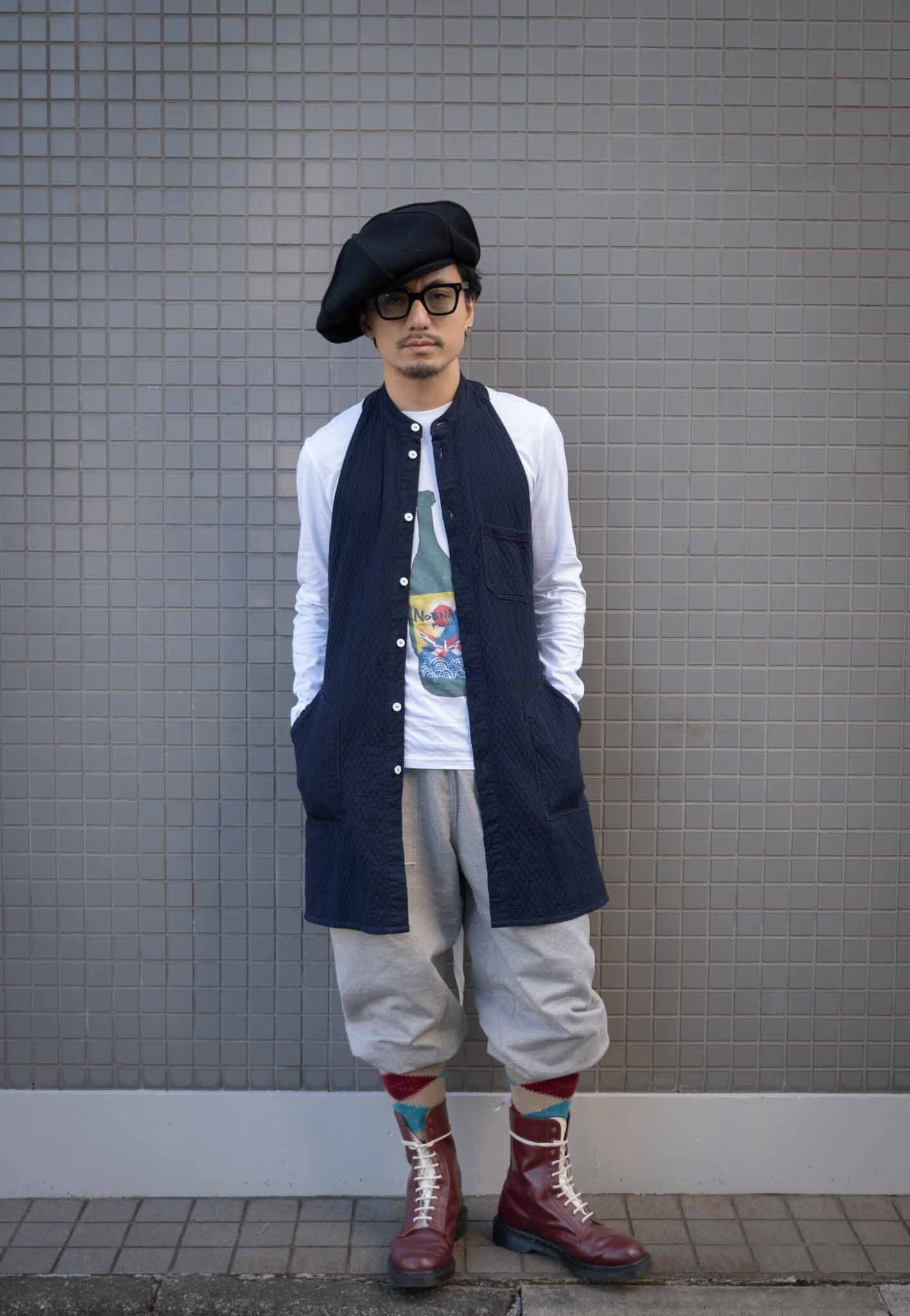 シャツみたいな形状と、レディースのスリーブレスのトップスみたいな形?(なんて言ったら良いんだ?)をミックスしたのようなデザイン。前を開けたらベストの様に使用することもできる。後から見たらちょっと「おぼっちゃまくん」スタイル。その感じも何か変態ぽくて良い。インナーとして使って、レイヤードを楽しむのはもちろんトップスも何でも合いそうです。