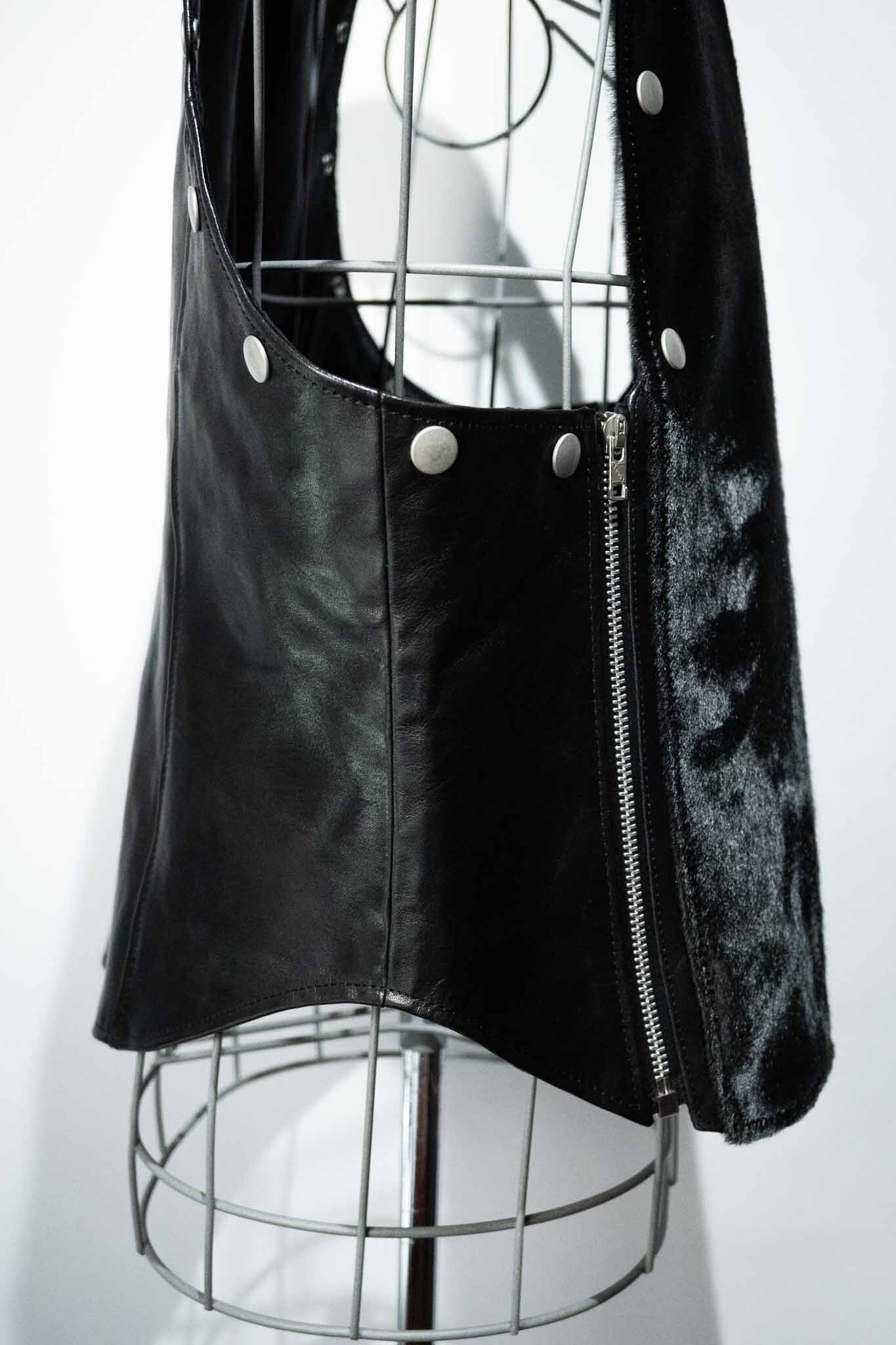 Separate the leather body to create a leather vest. It's inspired by the open-arm fur vests worn in Eastern Europe, including Hungary. While the fur is typically tucked inside for added warmth in traditional folk costumes, this design features the fur facing outward, showcasing the beautiful luster of the calfskin. The rest of the vest is made of Polish horse leather, a premium leather that combines refined fineness with a rough, rugged feel, developing a unique character with wear. It fastens with dot buttons on the side and can be opened and closed with a side zipper. The hem is beautifully curved. It can be worn over a T-shirt, shirt, sweater, or sweatshirt, layered under a coat, or worn as an inner layer for a striking look.