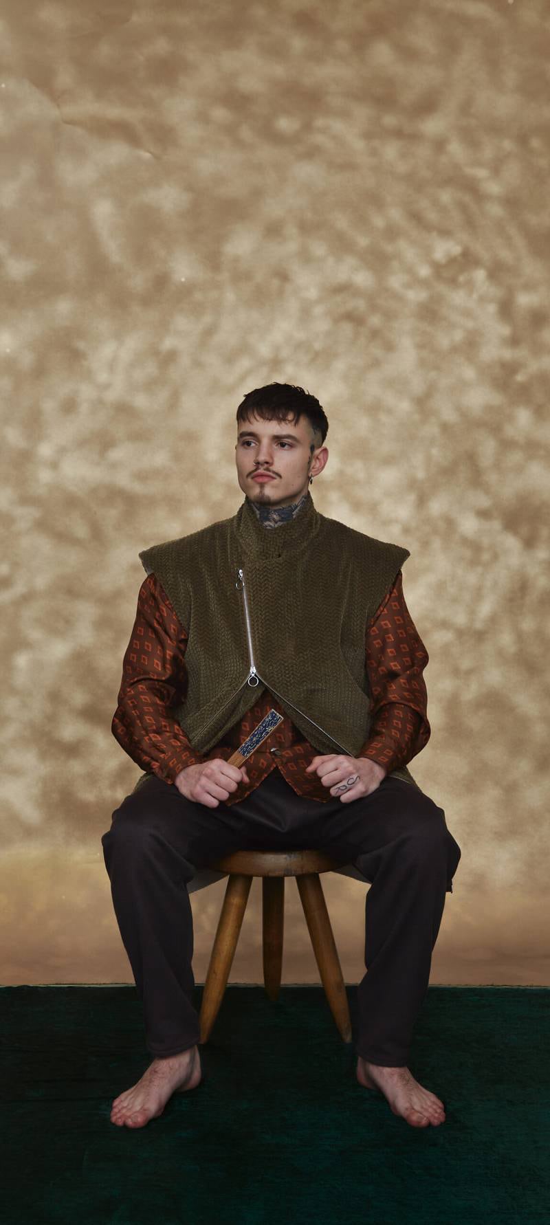 This open-collar shirt is made from vintage silk fabric originally used for French neckties in the 1960s. The slightly loose silhouette allows you to wear a turtleneck underneath. The buttons are shiny mother-of-pearl.
