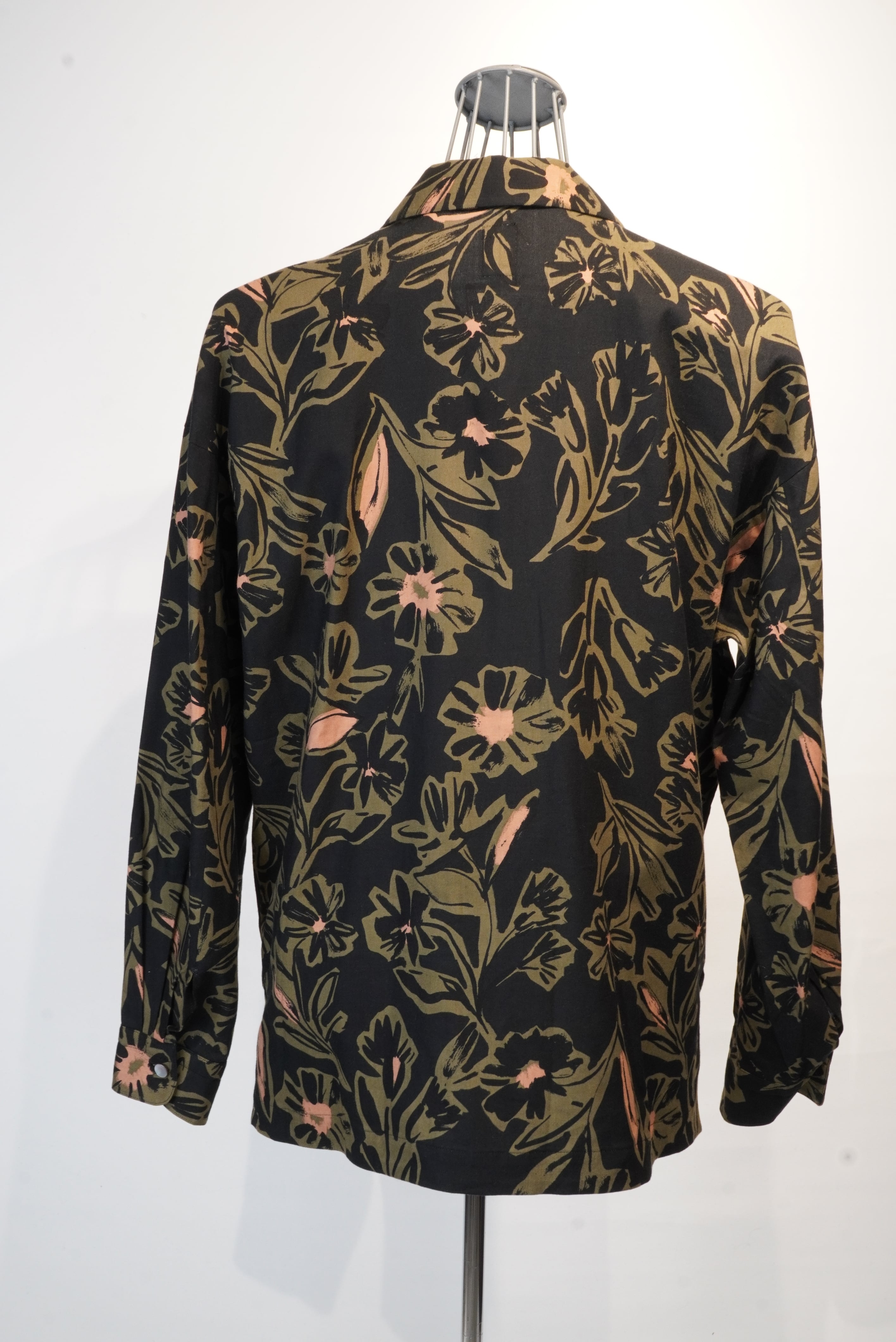 日本製の花柄プリントの生地を使用した、オープンカラーシャツ。ややゆとりのあるシルエットですので、インナーにタートルなどを入れて楽しむことも可能です。ボタンは光沢のある足付貝ボタンを使用。