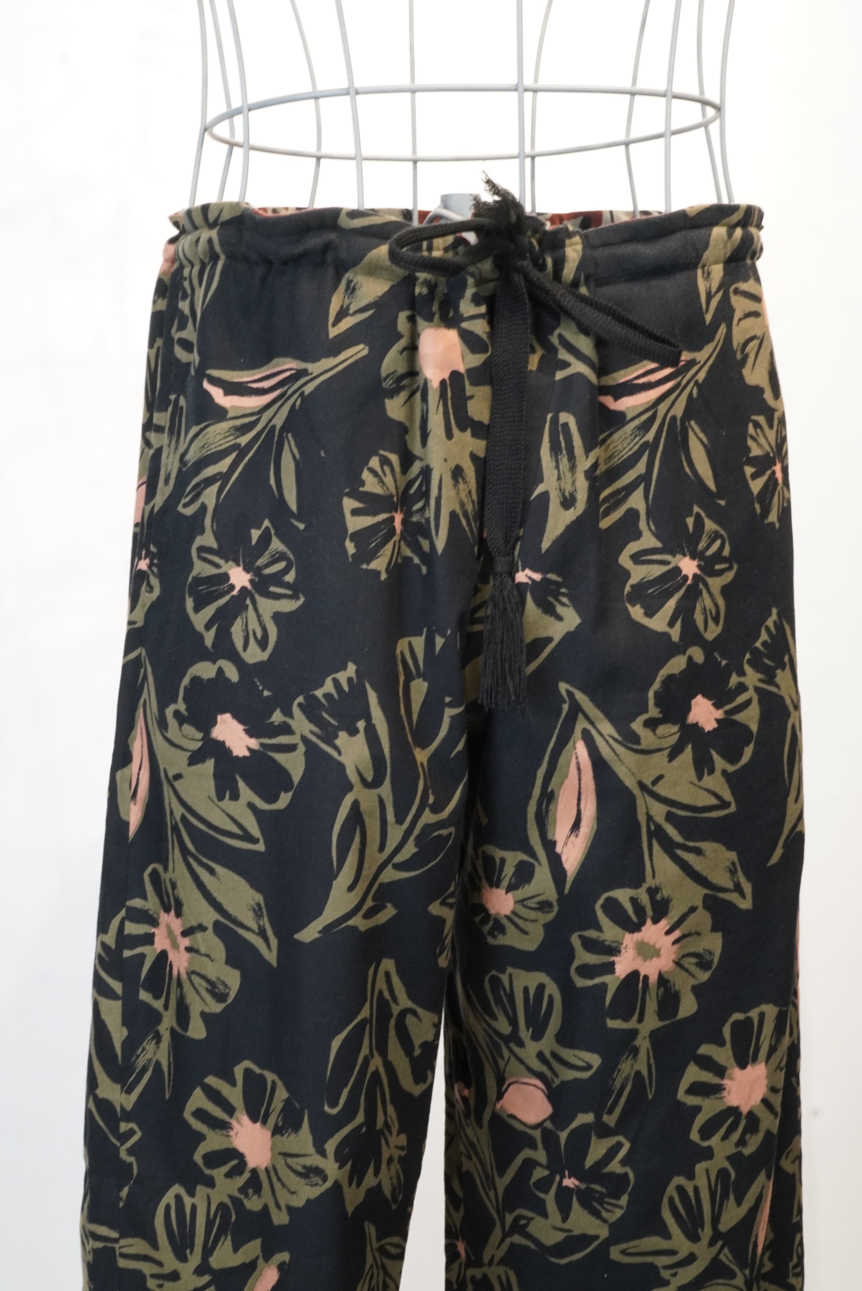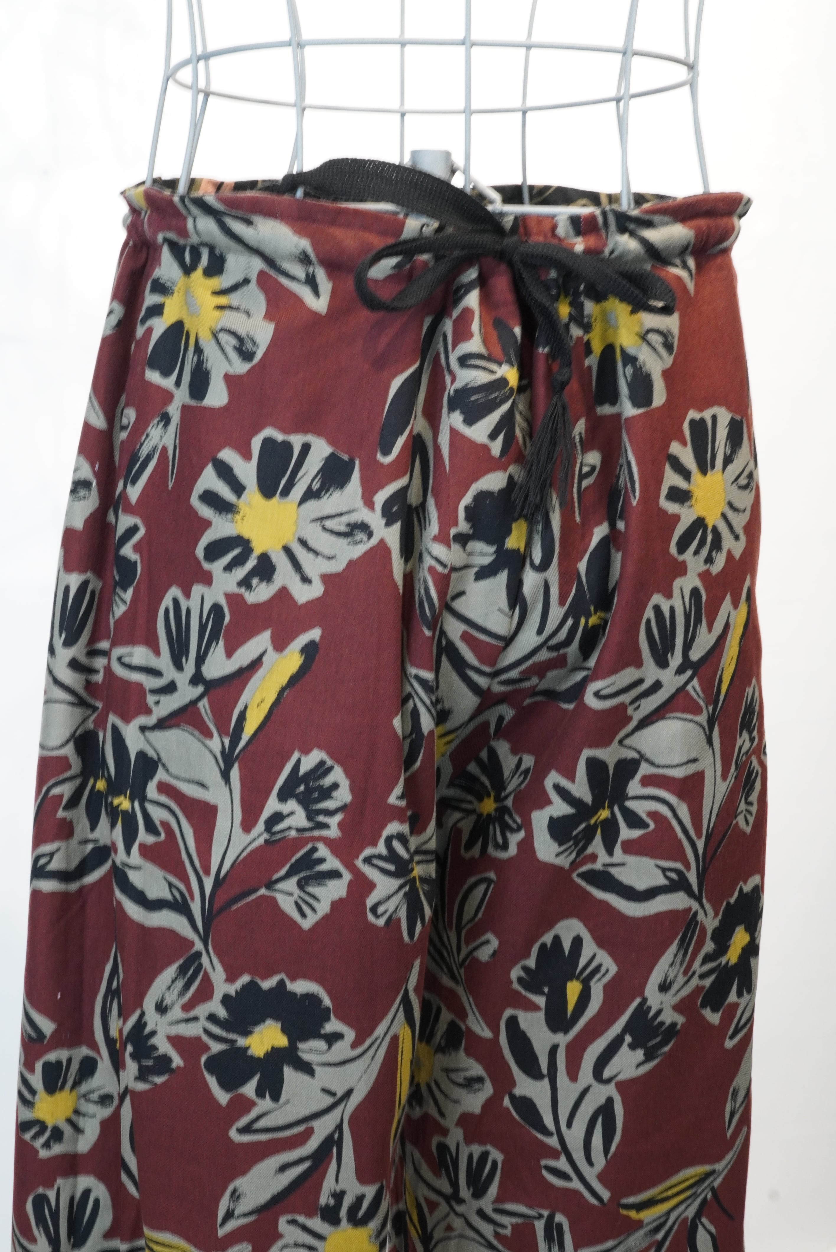 These reversible sarouel baggy pants are made from Japanese-made Viyella fabric with a floral print. The waist drawstring allows for an adjustable fit. The bold floral print is complemented by a subdued color scheme, making them easy to coordinate with other items.