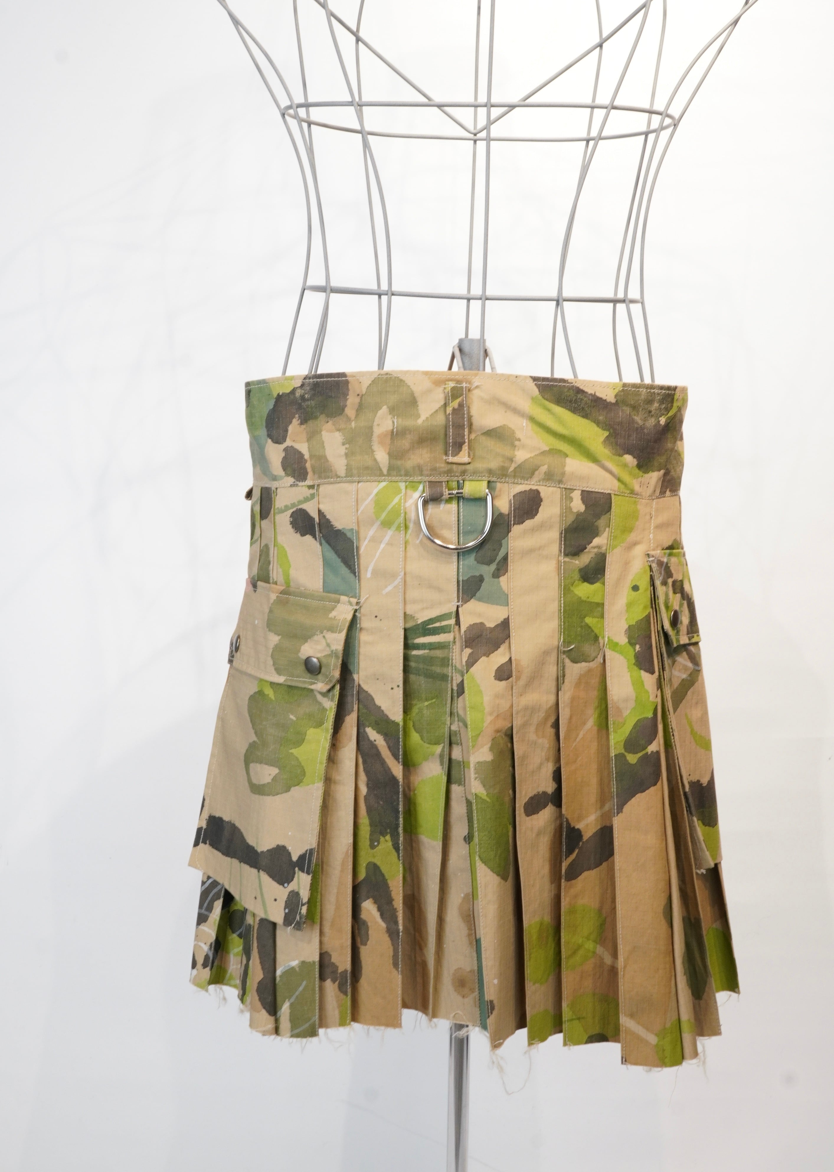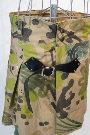 tokioのオリジナルで作成したカモフラージュプリント。ミリタリーテイストでありながら、パンクスの要素を感じるtokioらしいスカートになりました。3段階に調整できるドットボタンとベルト付き。