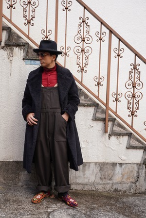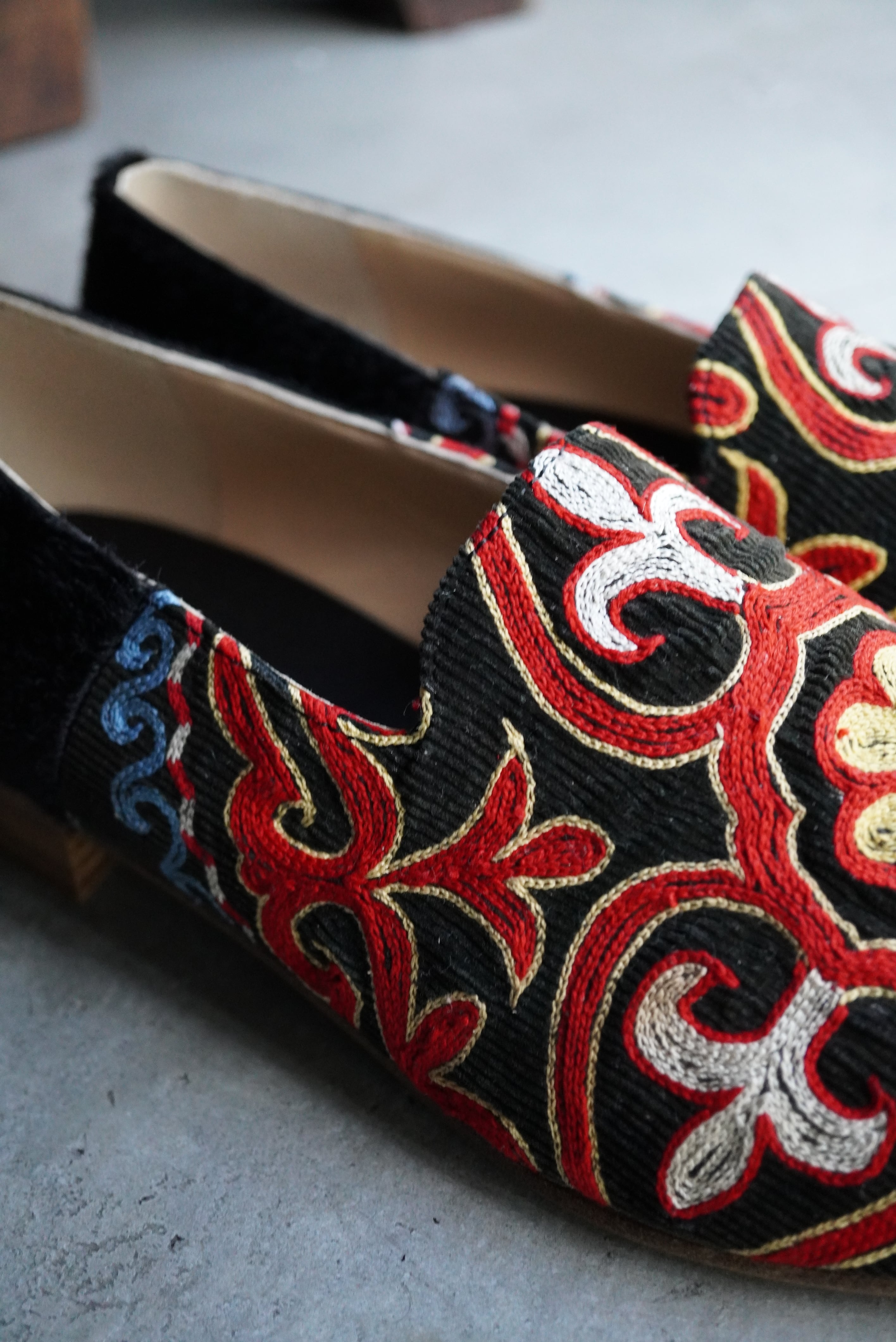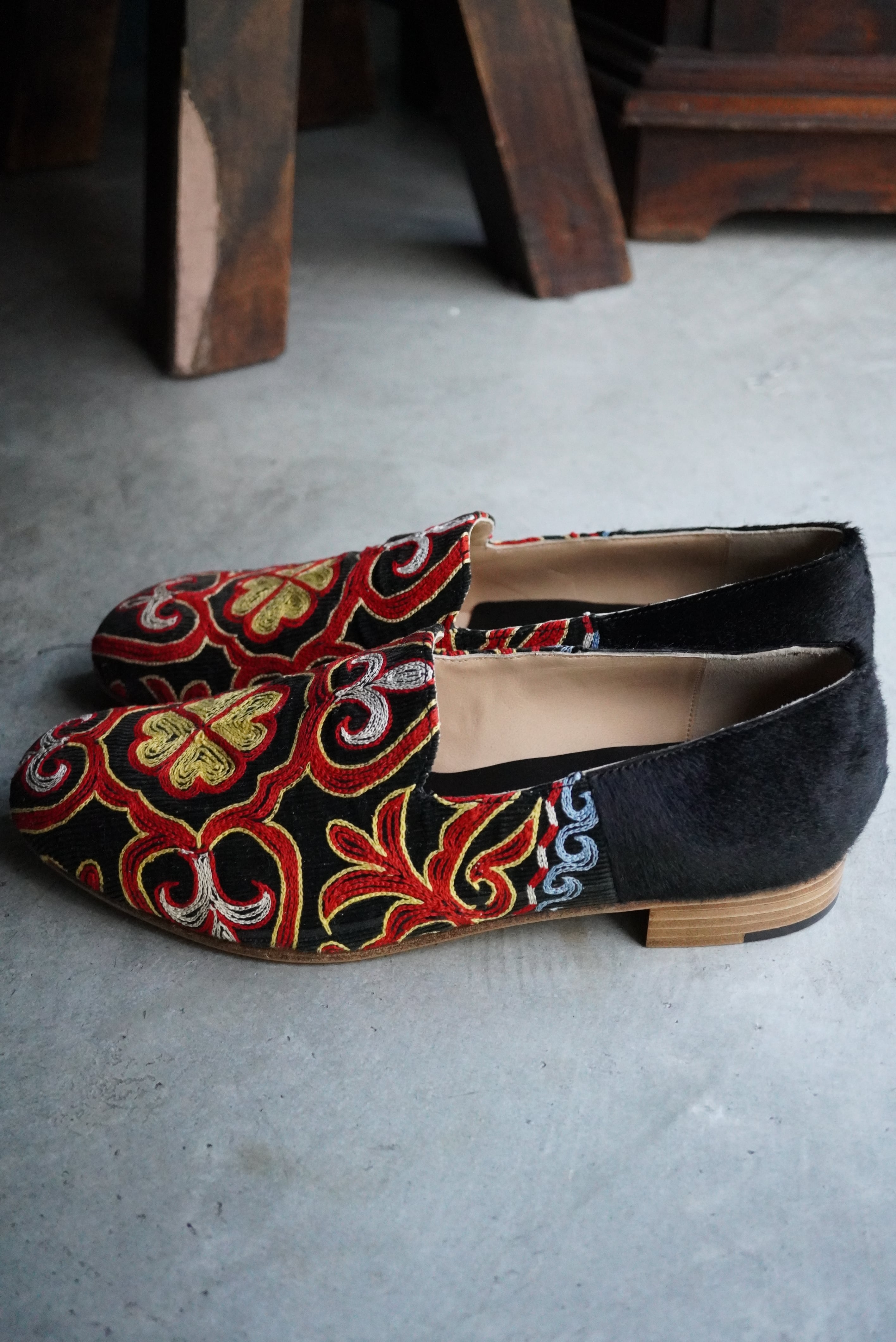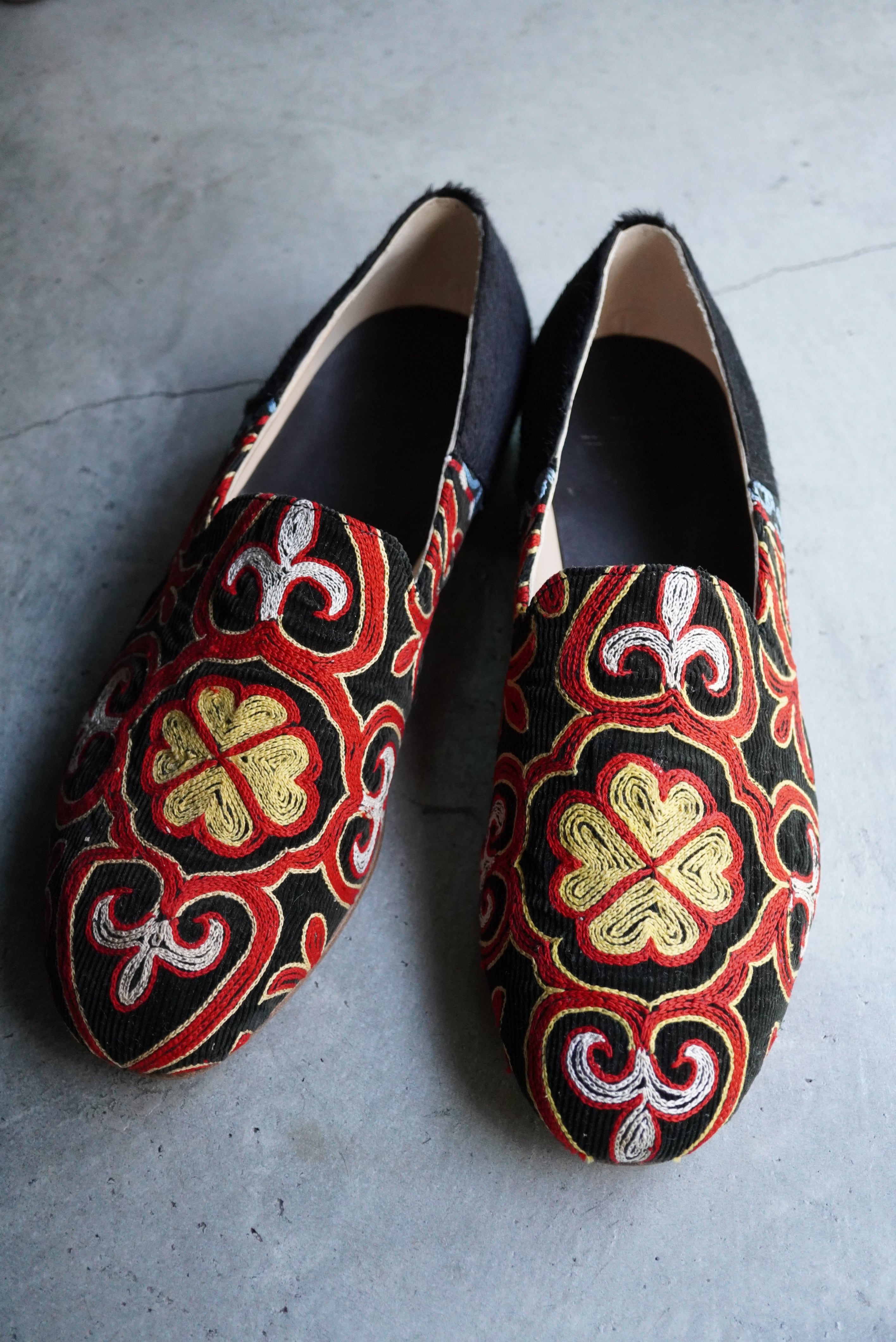 eofmのトゥスキーズスリッポン。トゥスキーズはカザフスタンで作られる大きなタペストリー。かぎ針の手刺繍が全面に施され、母から娘へ結婚の際に贈られるものだそうです。その緻密さと独特の文様は素晴らしく、世界に一枚しかないタペストリー。今回はクレイジーパターンに生地を配置し、唯一無二な仕上がりになりました。全部1点物になっています。やや細身に仕上げておりますので、いつもの靴のハーフアップサイズをオススメします。
