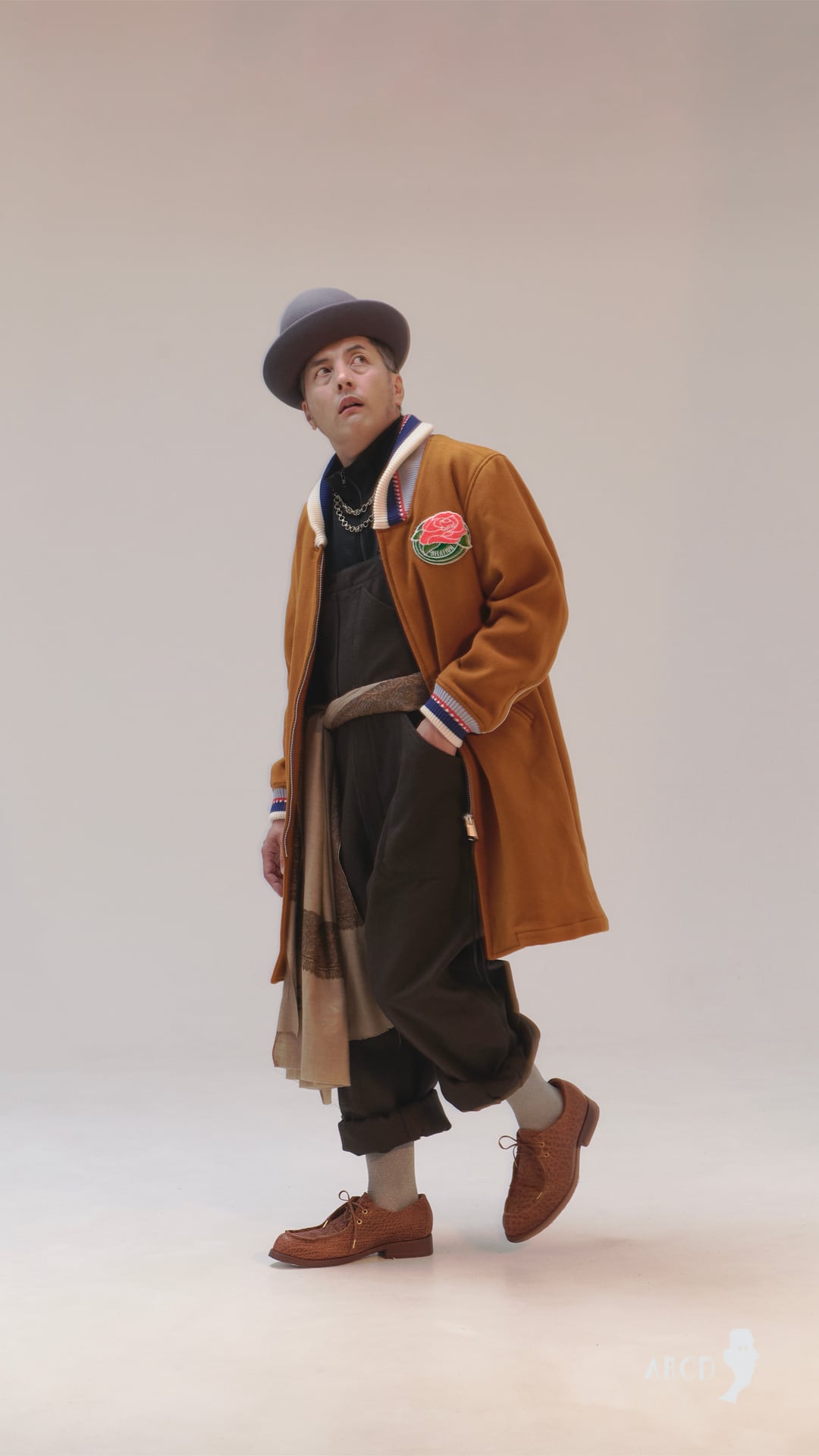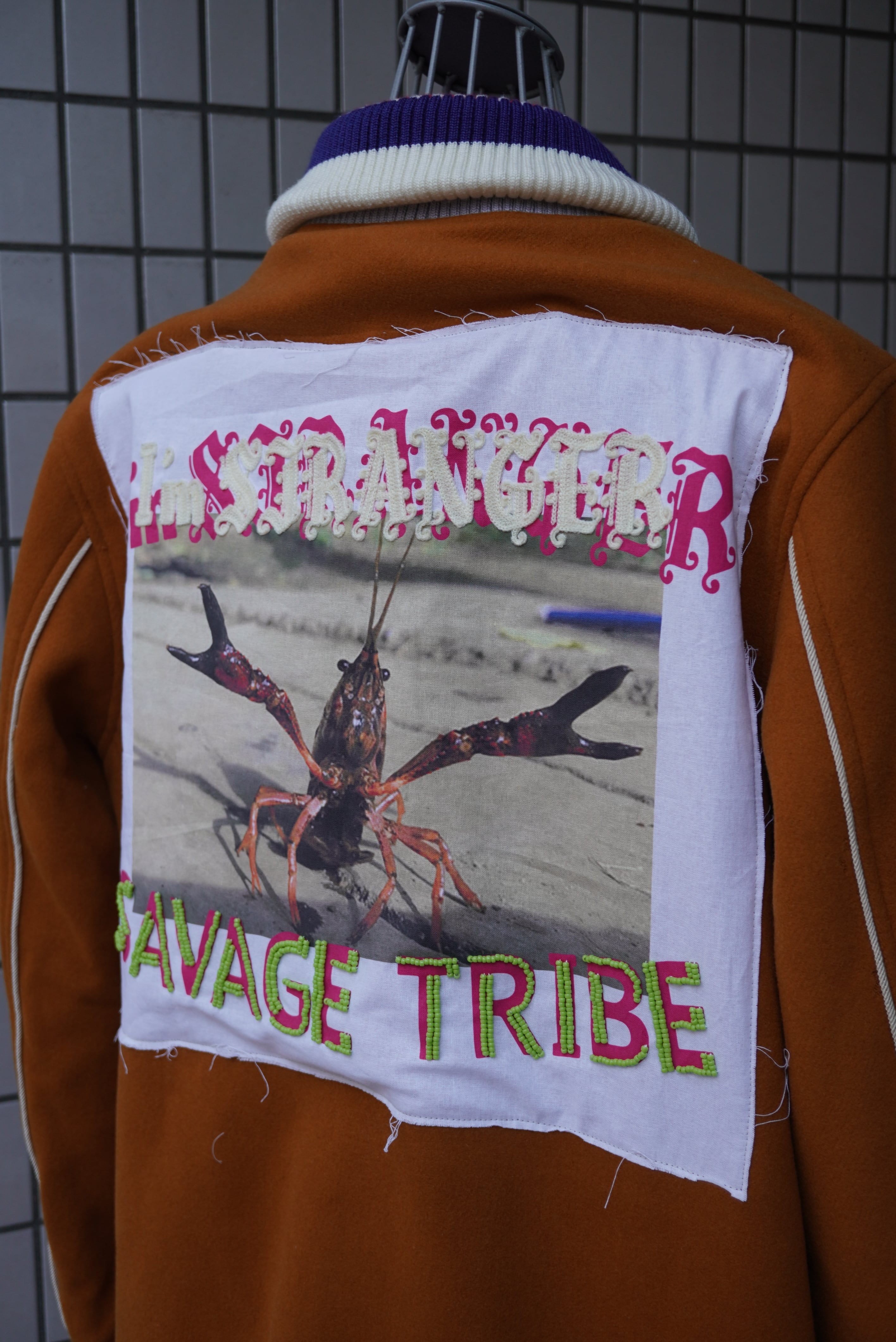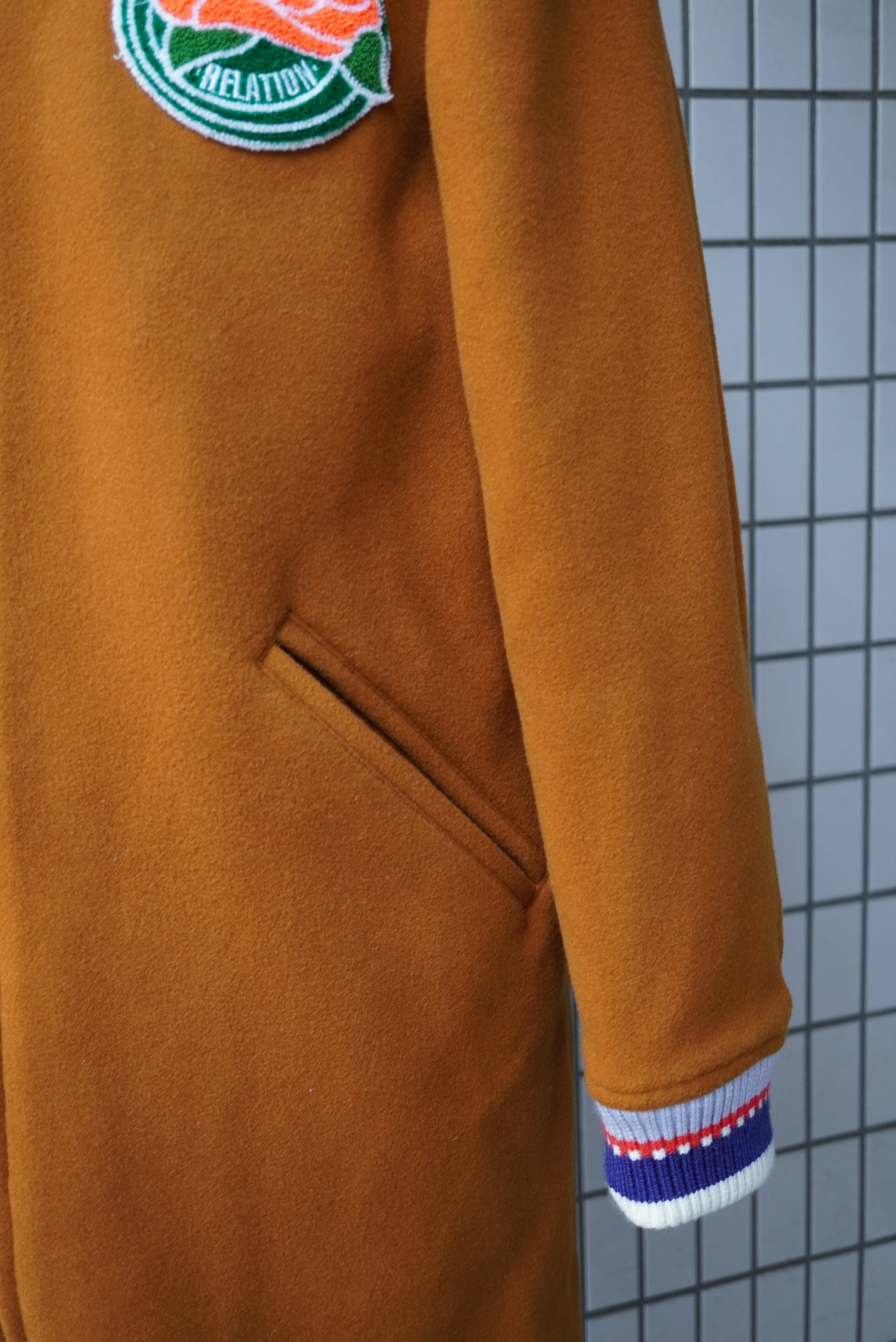 tokioのファラオコート。ファラオとは、映画『アメリカン・グラフィティ』に登場する不良グループの「ファラオ団」が着ていたことから日本で名付けられ、50~60年代のアメリカ発祥のカークラブ(自動車クラブ)の防寒着。トキオ氏はロックシーン、ロカビリーのカルチャーや50sが好きで、気になっていたファラオコートを今コレクションでポップに仕立てました。特徴的なリブはオリジナルで編み立て、ヴィンテージで見た事のある柄にオリジナル配色を載せ、バラのサガラワッペンは2023あたりからずっと使っている友愛の意味のワッペン(ローズボウル球場のマークが好きでインスパイア)と今季のザリガニパッチを背中に貼っています。カーコートのヘビーデューティーさと、ポップな可愛らしさを持ち合せた、tokioらしい1着になっています。