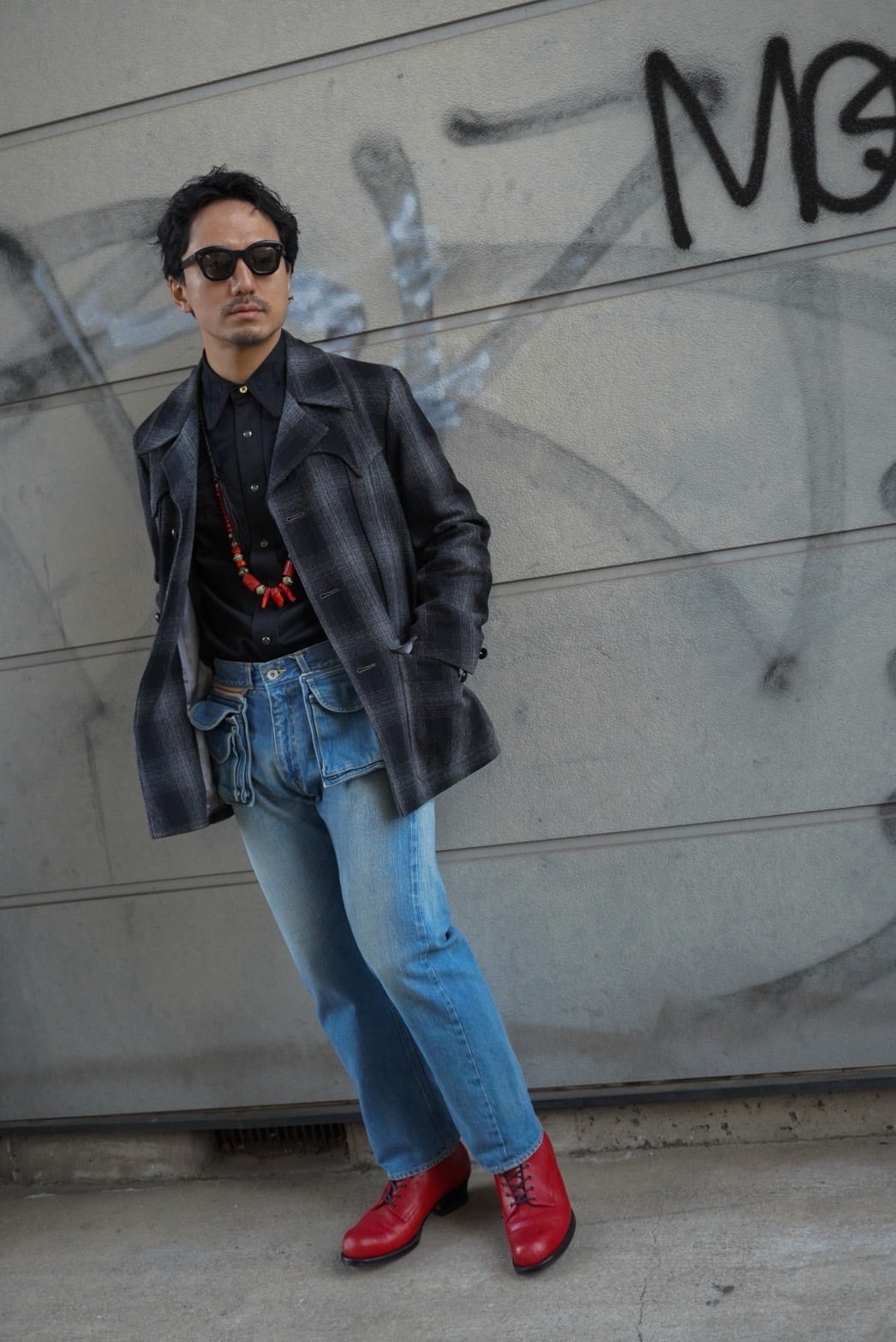 ウエスタンヨーク(肩から背中にかけてV字やカーブを描くように切り替えられた装飾)や背ベルト、バスケットボタンがその雰囲気を物語っています。いつもの格好に、自然とウエスタンジャケットを羽織る感じをおすすめしています。
