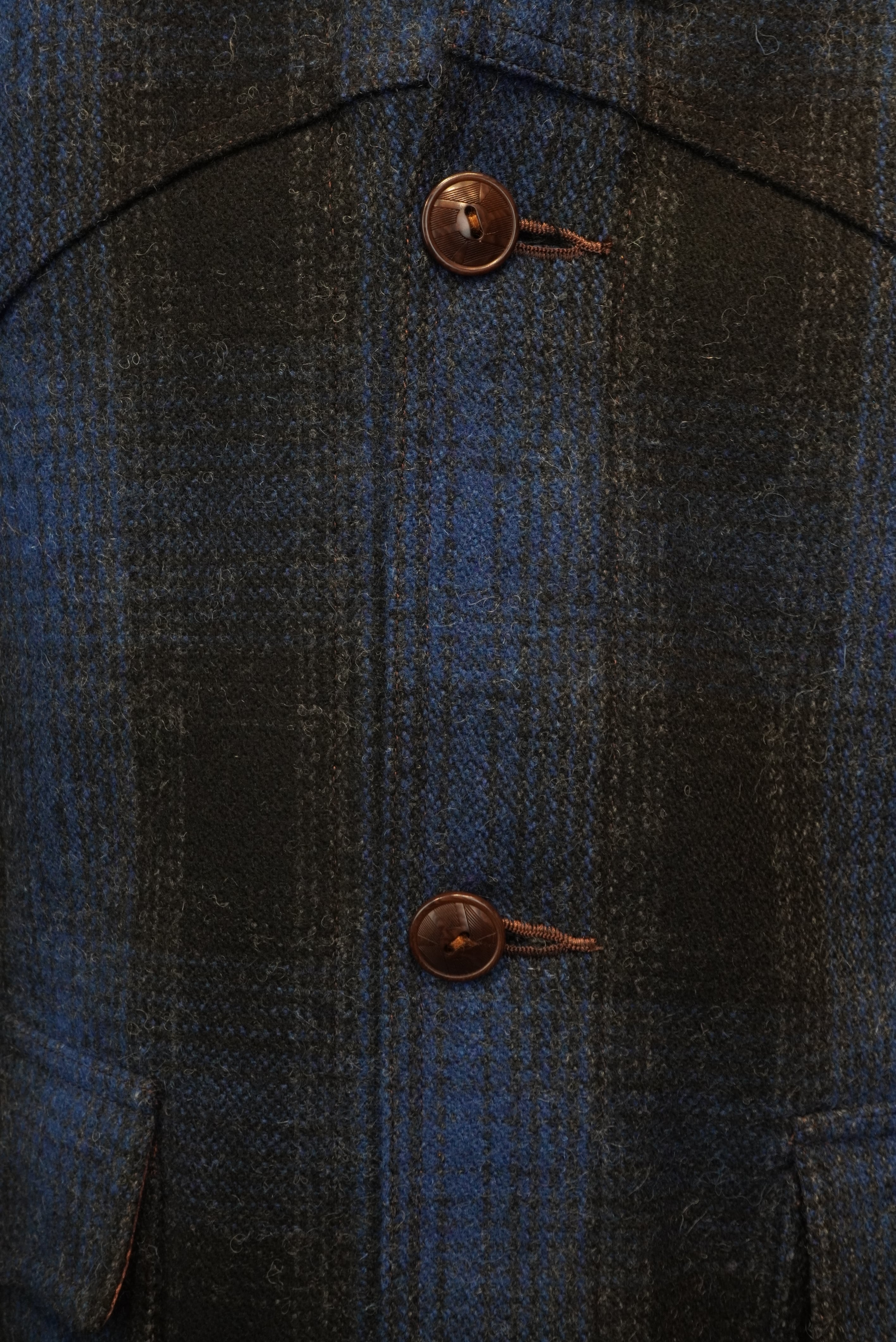 This is a short Western jacket. It recreates the fine details, such as the Western yoke design, buckle on the back, and side adjuster buttons. The decorative flap pockets, shaped in a Western style, are also an effective design element.