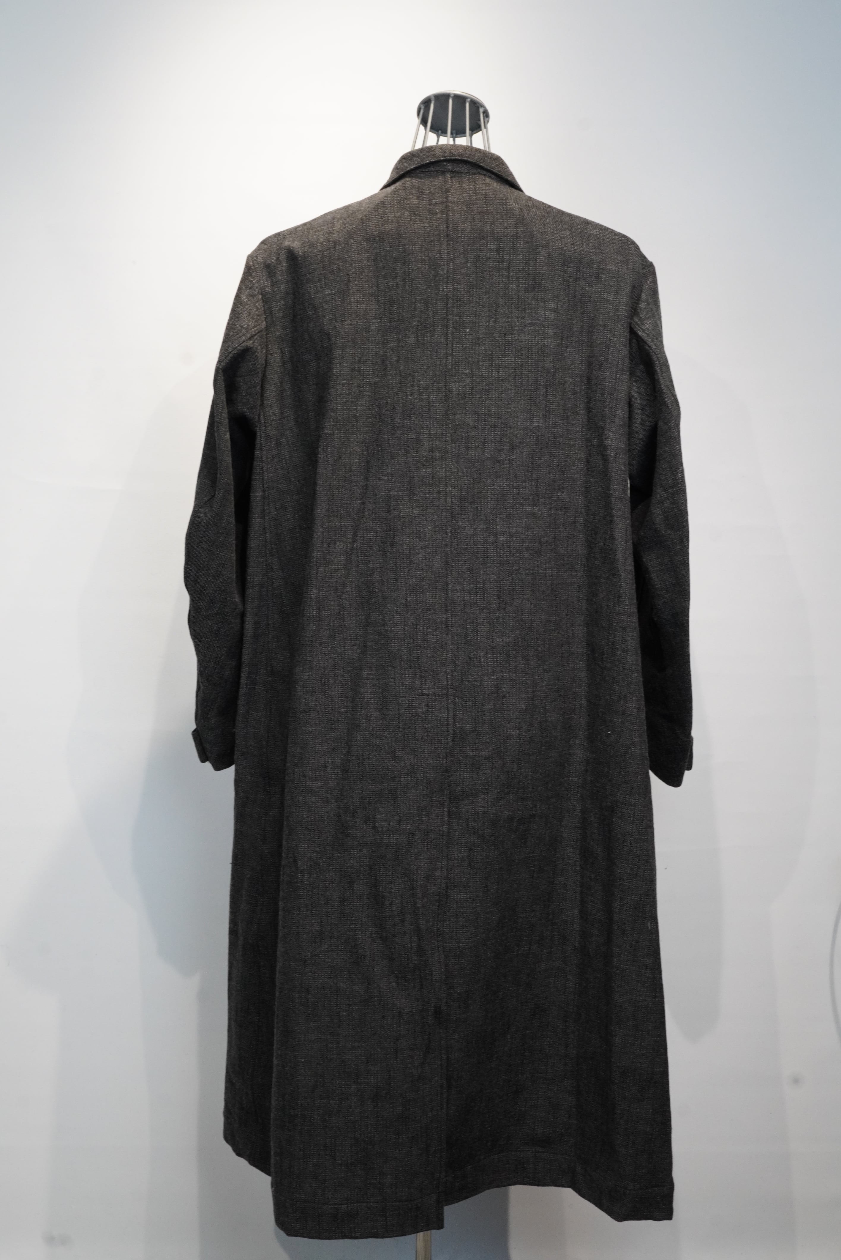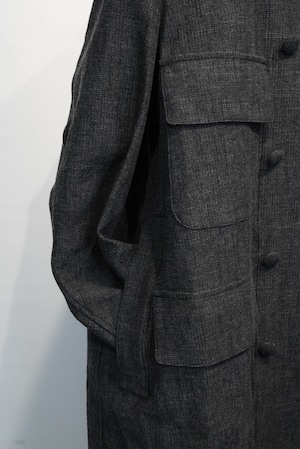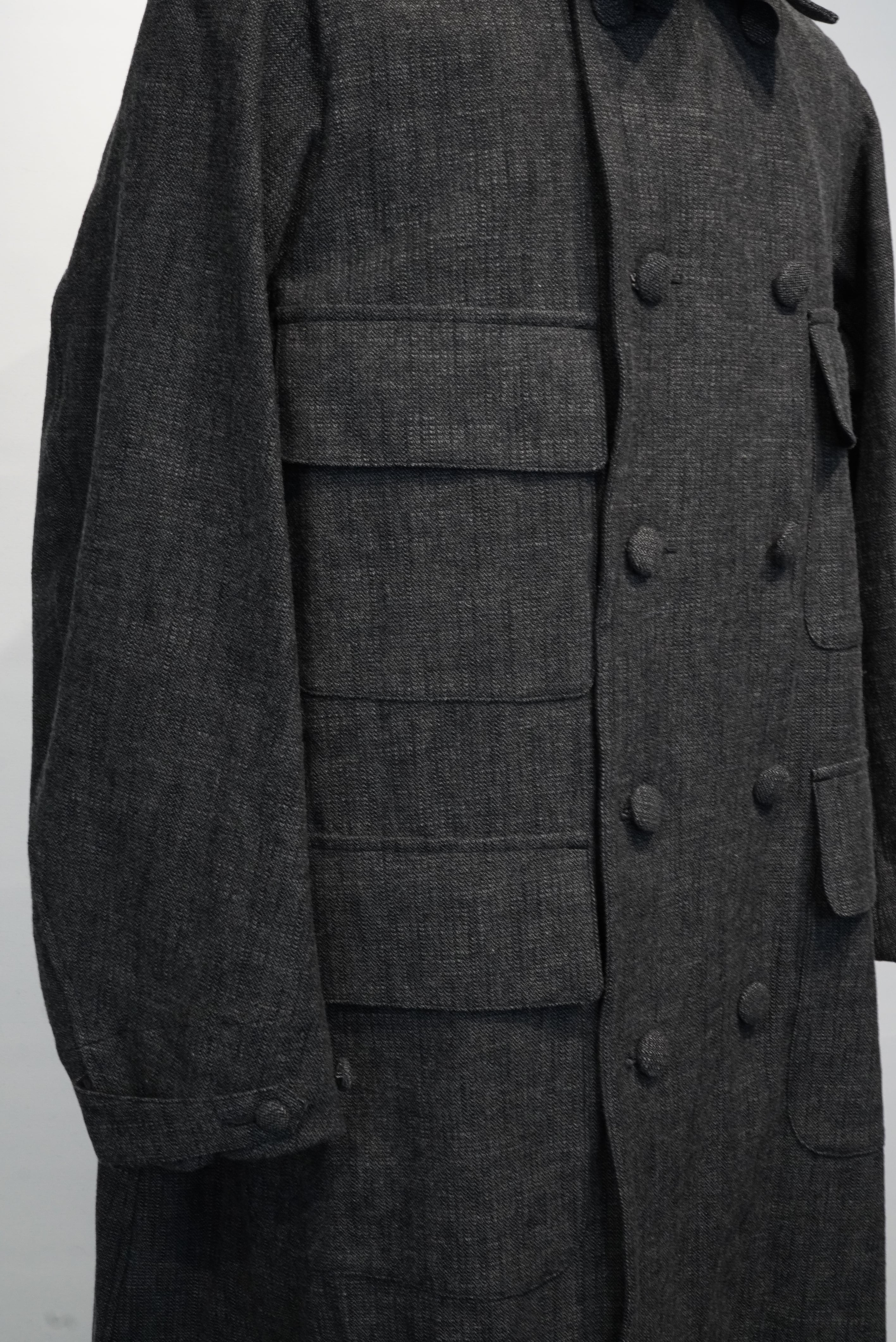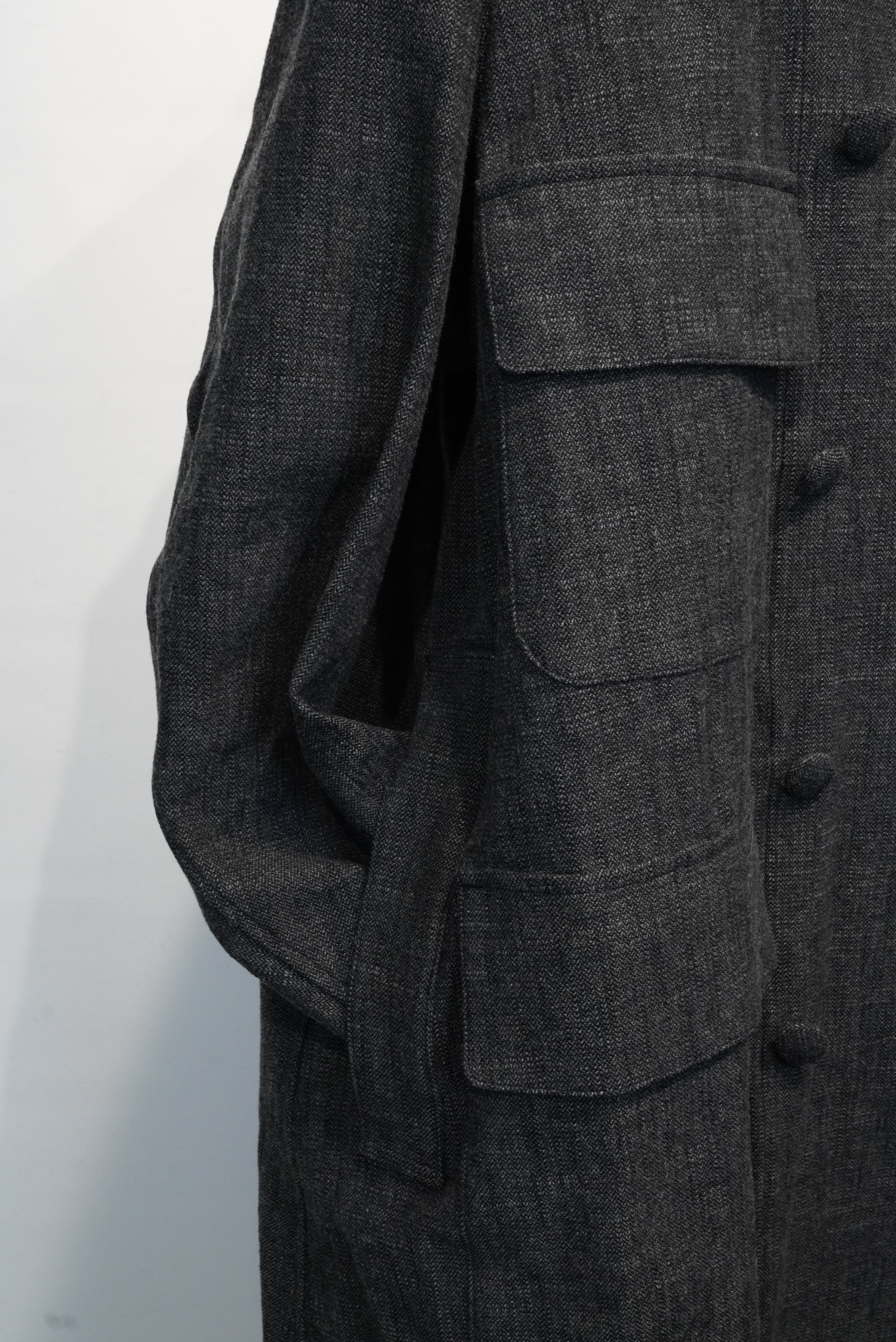 This atelier coat features a generous silhouette and is made with luxurious fabrics, and incorporates classic details such as four patch and flap pockets, through pockets, and curved sleeves with a vintage feel. The material is an unevenly yarned cotton wool herringbone from BIANCO TESSUT of Italy, giving it a vintage feel.
