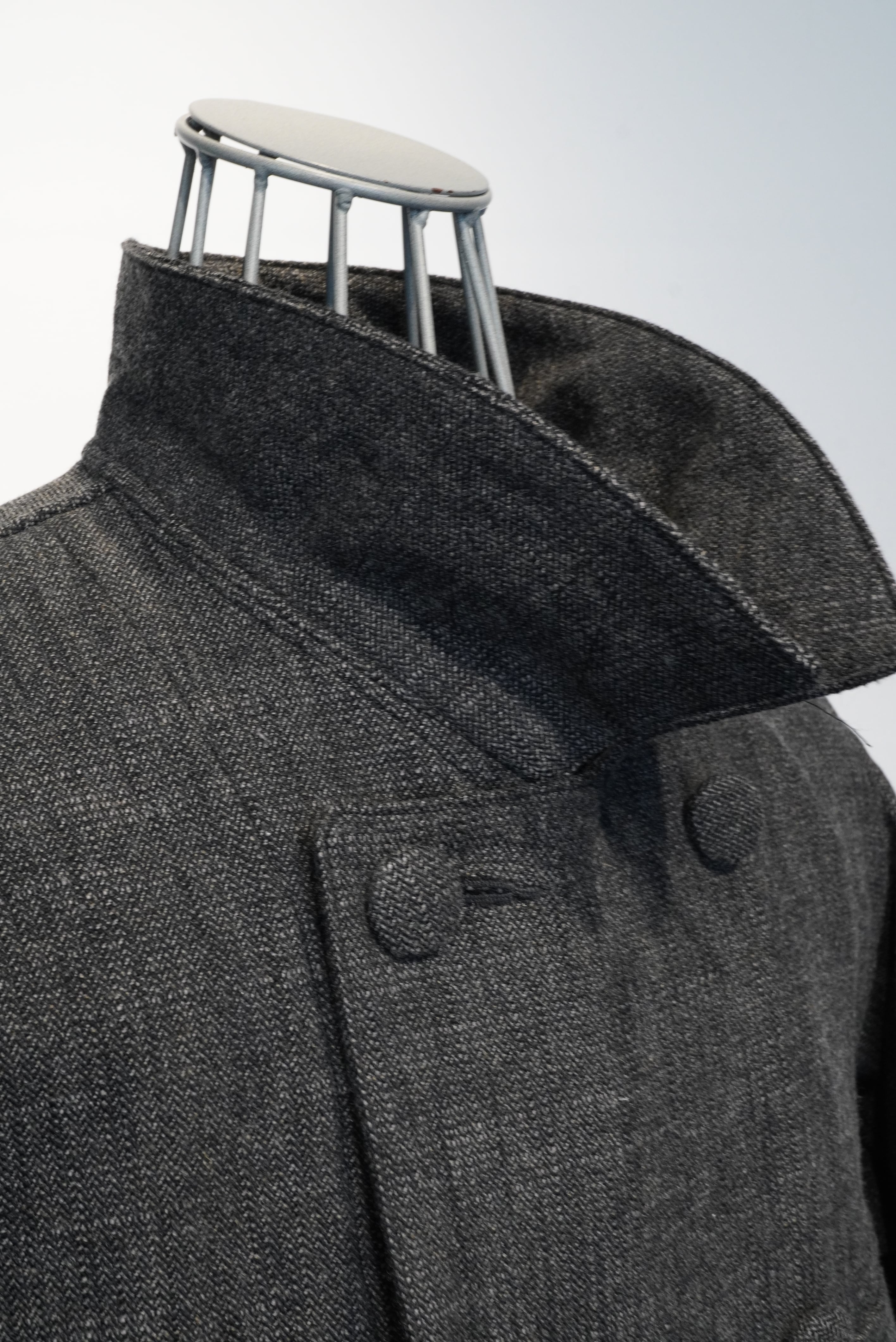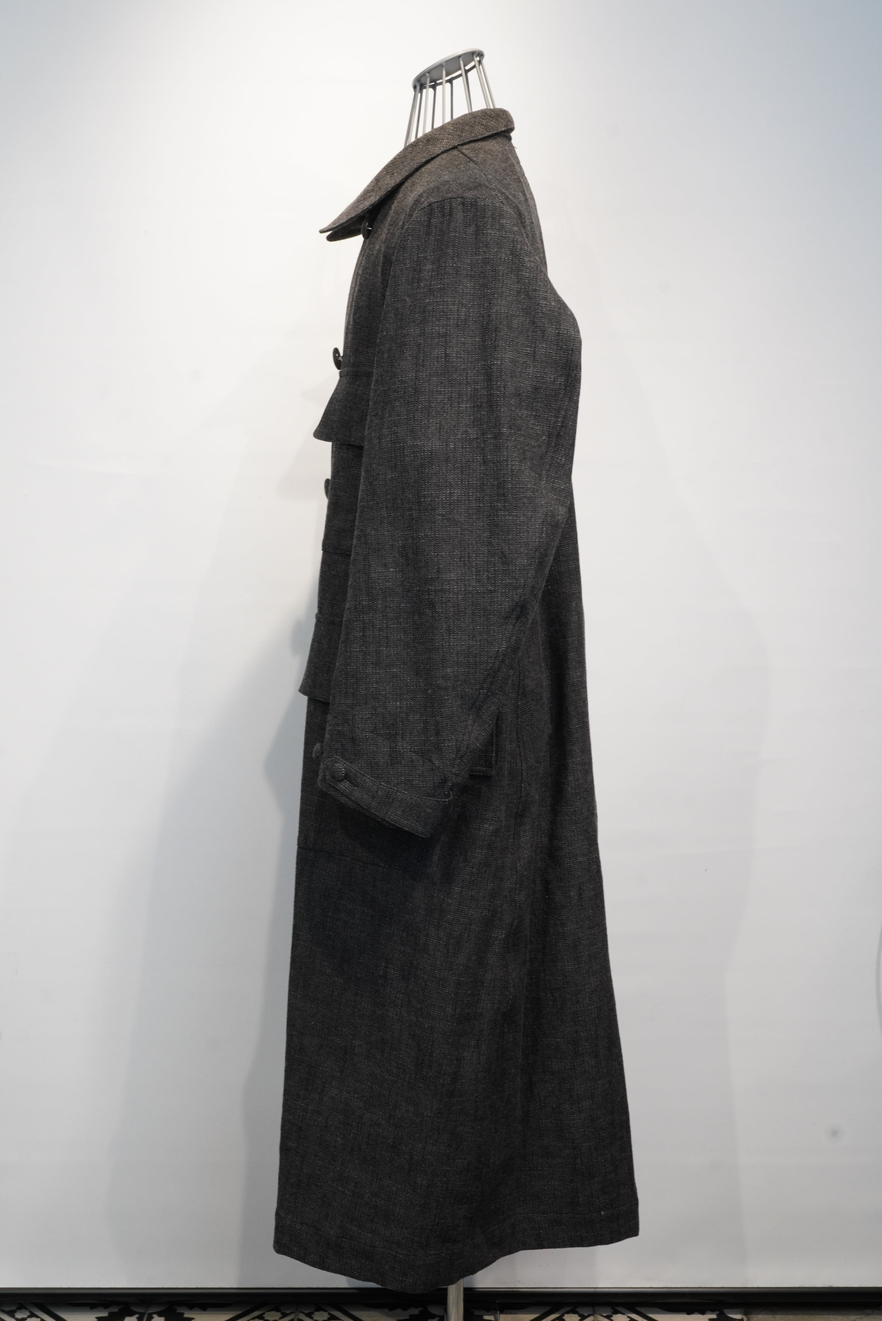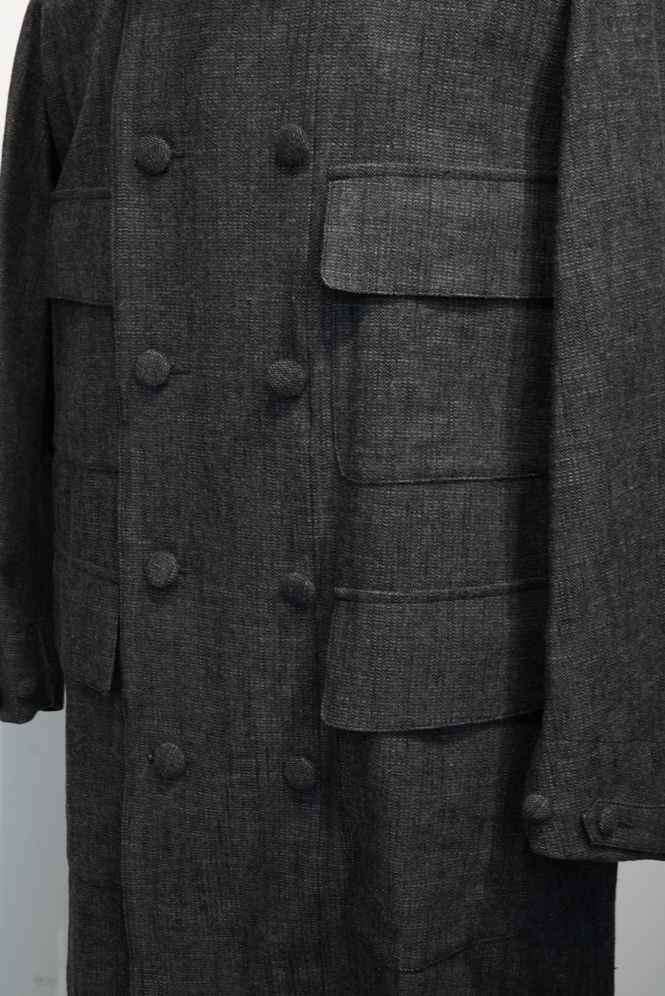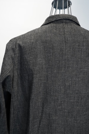This atelier coat features a generous silhouette and is made with luxurious fabrics, and incorporates classic details such as four patch and flap pockets, through pockets, and curved sleeves with a vintage feel. The material is an unevenly yarned cotton wool herringbone from BIANCO TESSUT of Italy, giving it a vintage feel.