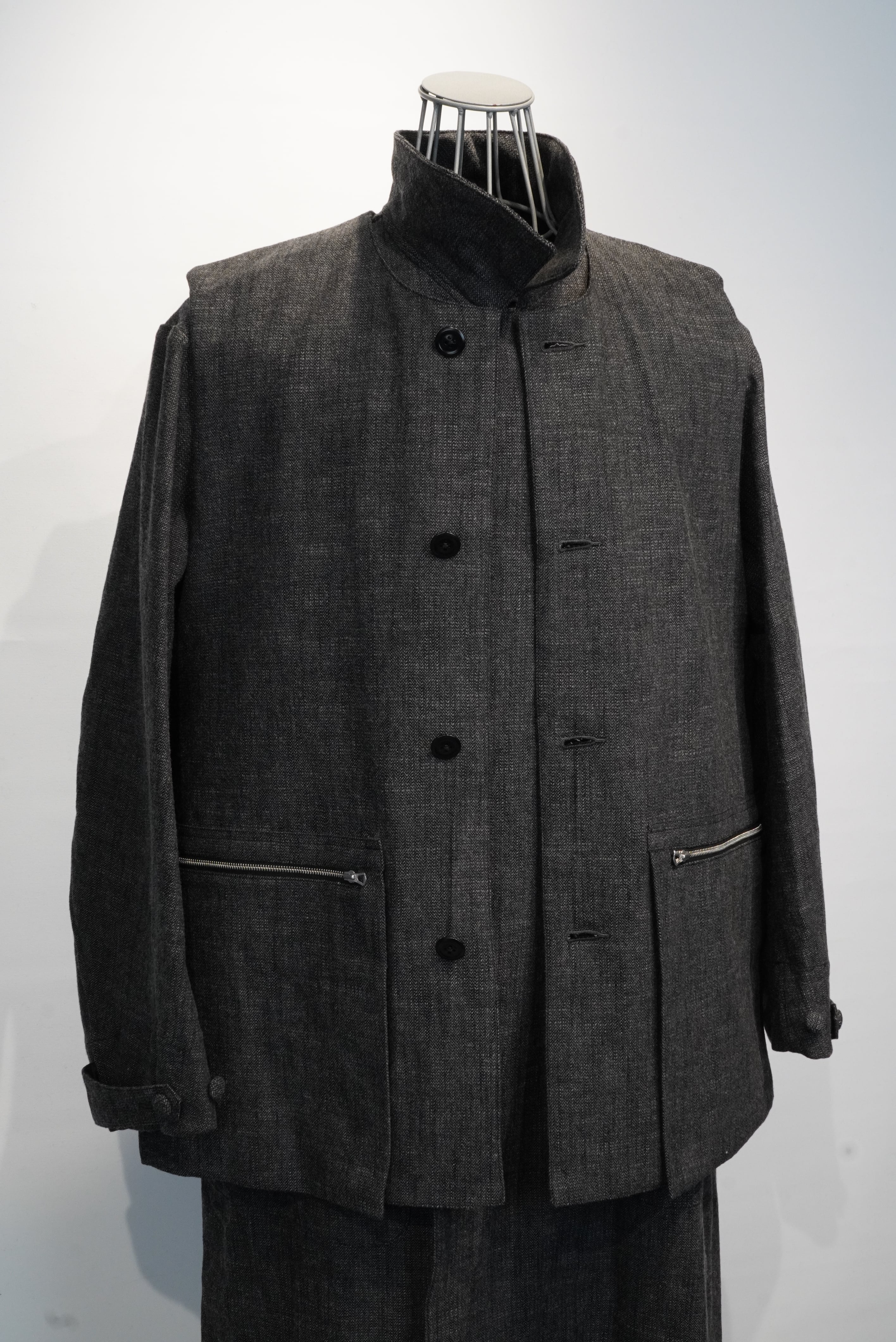 贅沢に生地を使用した、分量感のあるシルエットが特徴のアトリエコートは、4パッチ&フラップポケットや貫通ポケット、前振りの強いカーブスリーブ等、クラシカルなディテールを取り入れた、ヴィンテージ感のある仕上がりになっています。素材はイタリアのBIANCO TESSUT社の、ムラ糸使いのコットンウールヘリンボーンを使用し、古着の様な風合いに仕上げています。共地のジャーキンベストもあるので、レイヤードでお使い頂くのをオススメしています。
