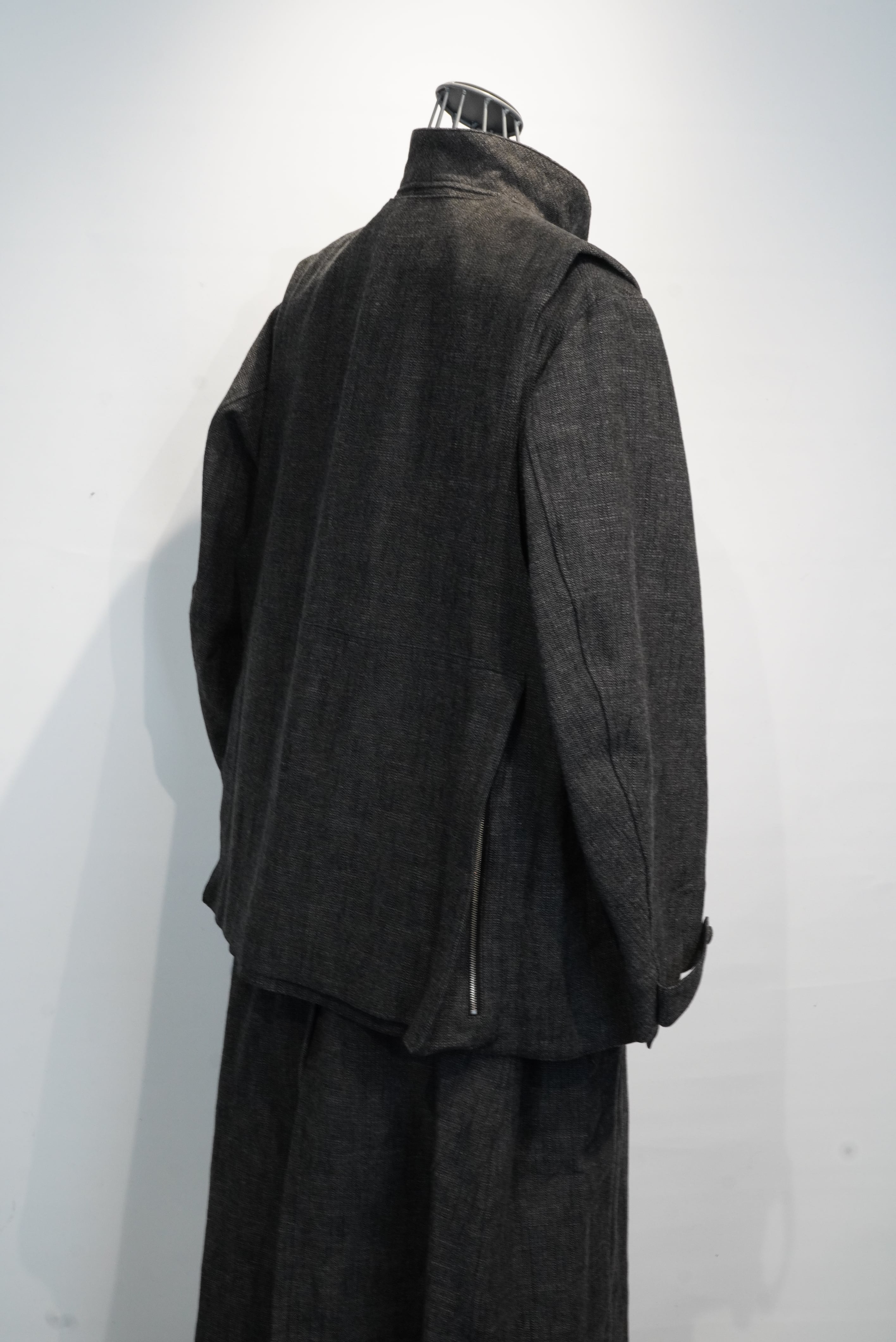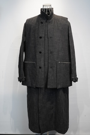 贅沢に生地を使用した、分量感のあるシルエットが特徴のアトリエコート。4パッチ&フラップポケットや貫通ポケット、前振りの強いカーブスリーブ等、クラシカルなディテールを取り入れた、ヴィンテージ感のある仕上がりになっています。素材はイタリアのBIANCO TESSUT社の、ムラ糸使いのコットンウールヘリンボーンを使用し、古着の様な風合いに仕上げています。共地のアトリエコートもご用意があります。こちらとレイヤードしてお使いいただくのをお勧めしています。