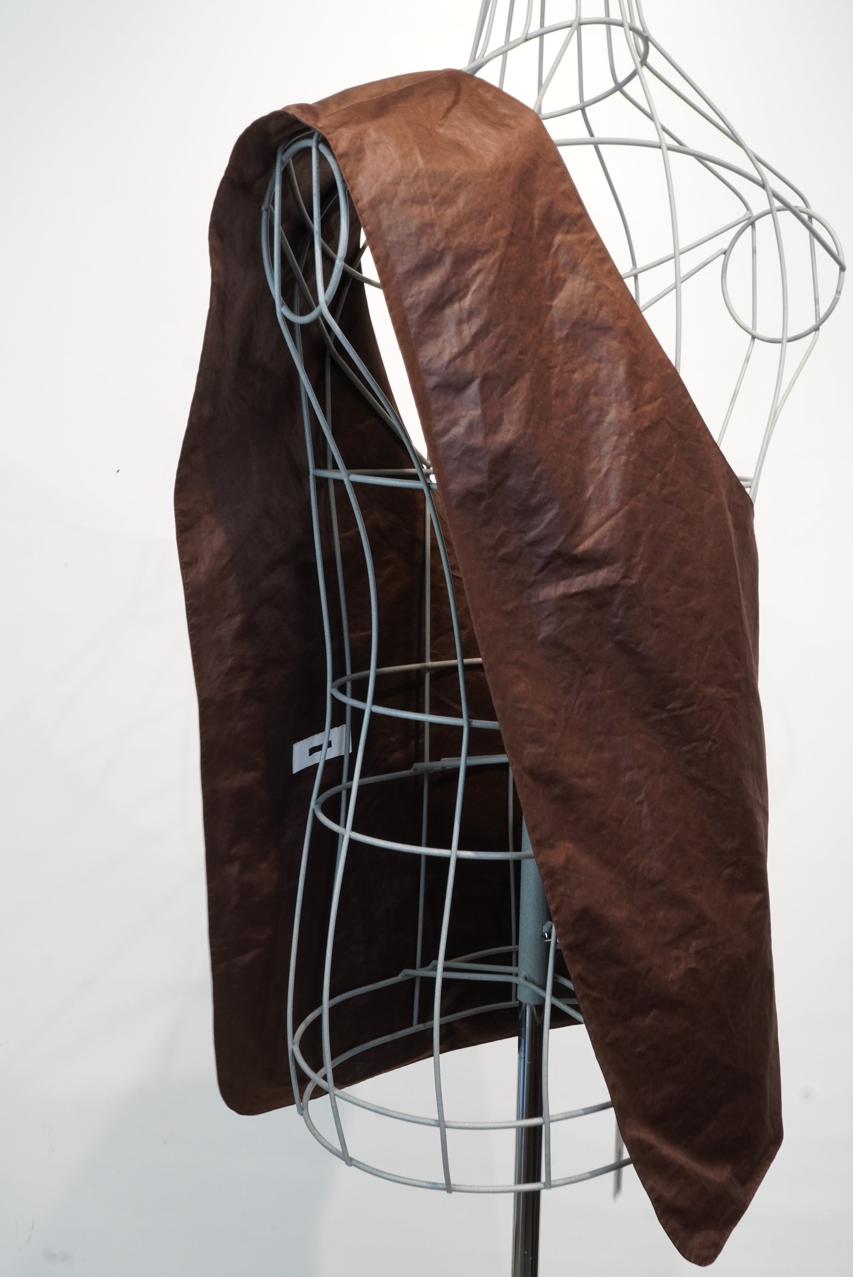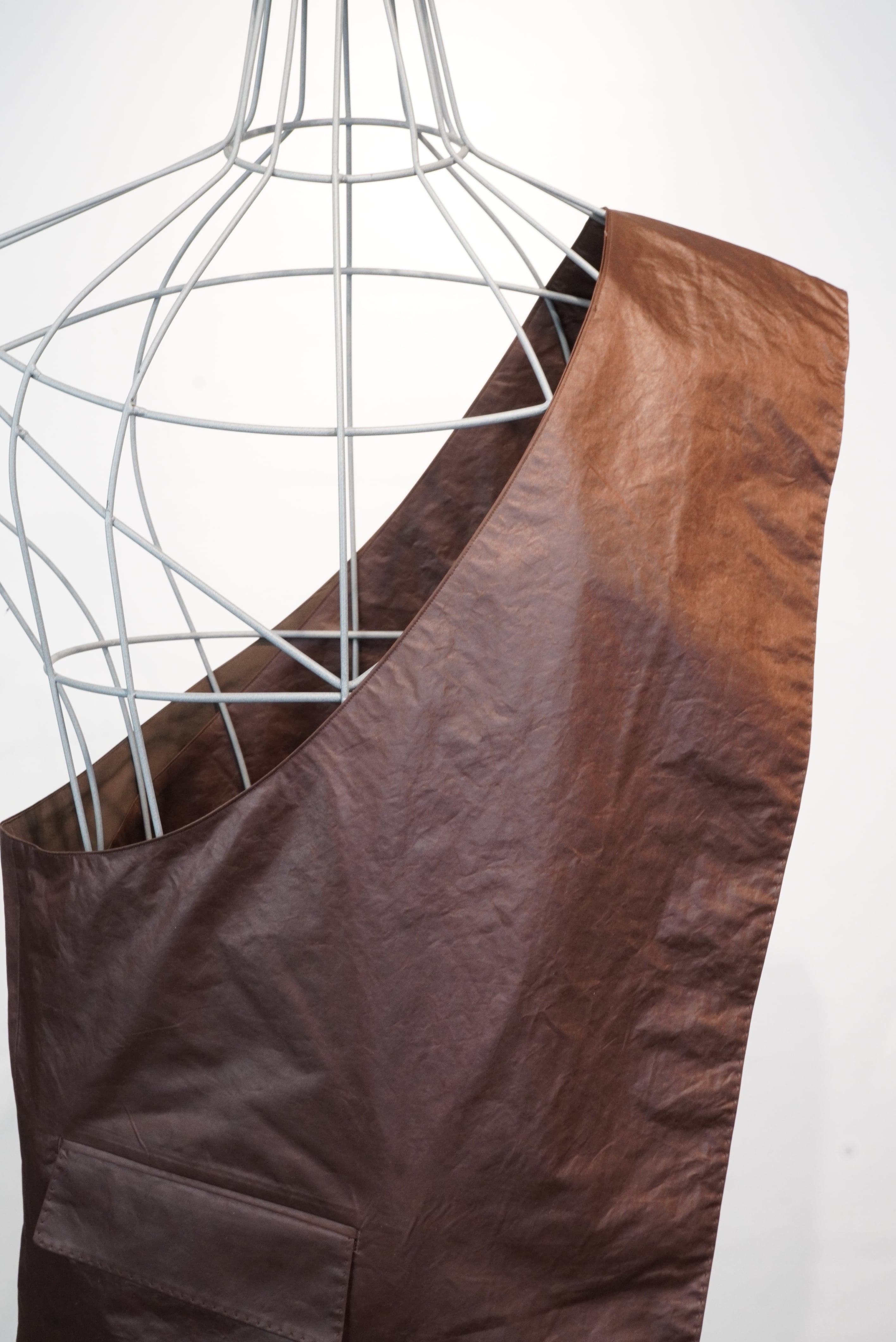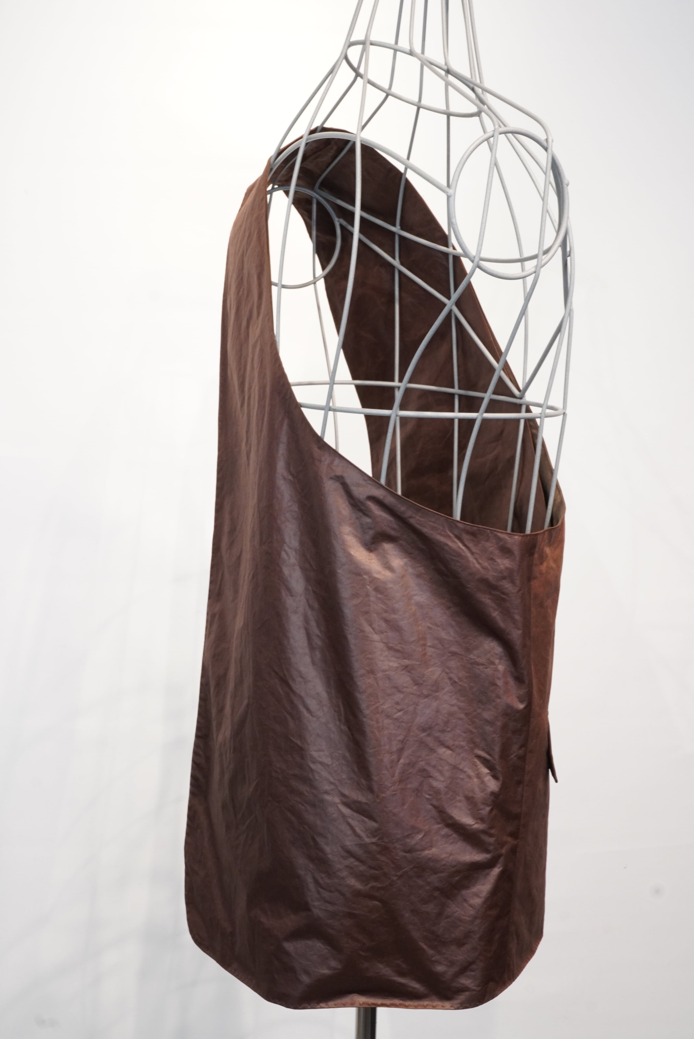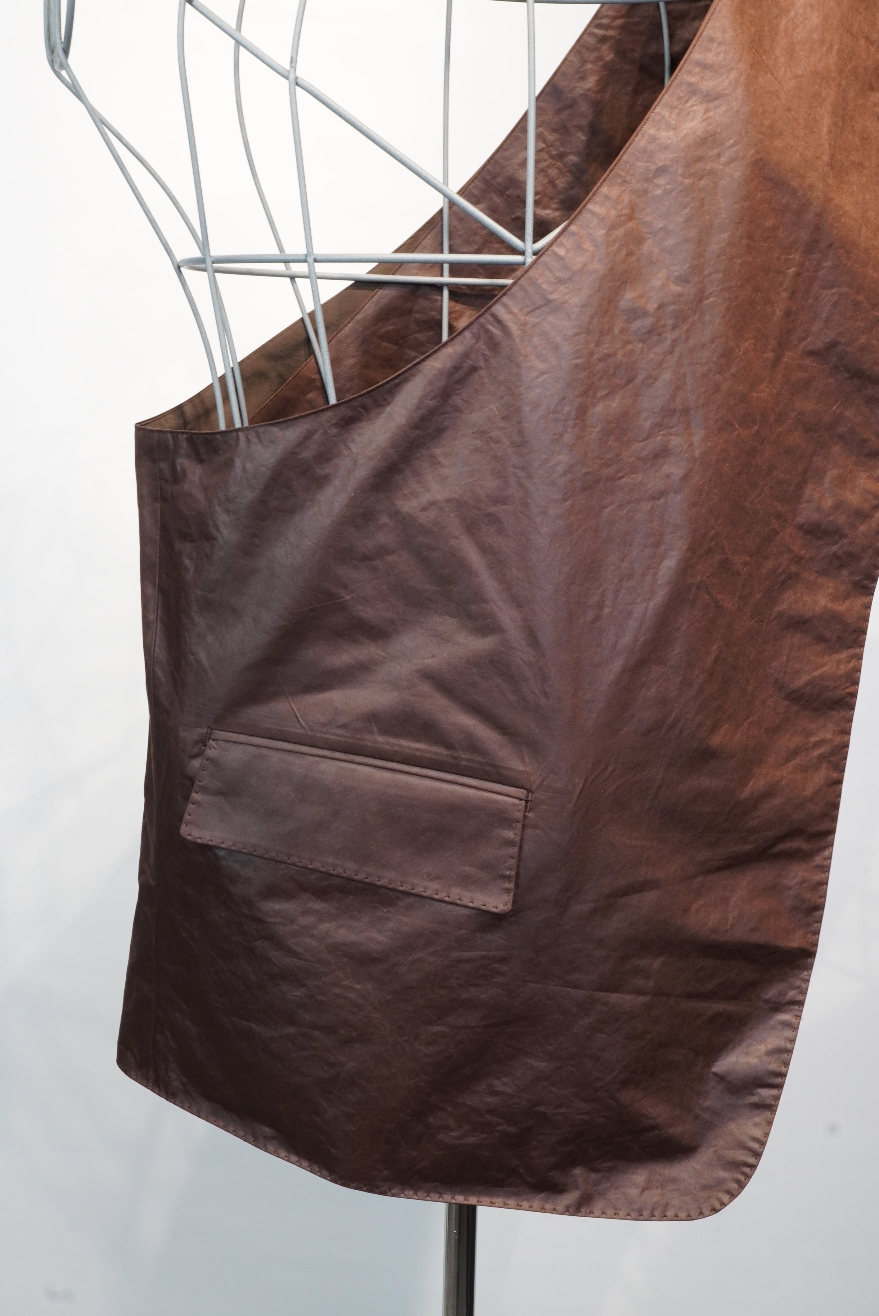 名前の通り、バックとベストの中間に位置するアイテム。脇下の部分が全て開いている構造で、全体がバックとしての機能を持つ、斜めがけのベストになります。生地には撥水樹脂コーティングをしたポリエステル素材を使用しており、少しレザーみたいに見えます。チャコール、ブラウン、ブラックの3色のご用意がございます。アウターからシャツ、Tシャツまで季節を問わずに使用することができる、ユニークなアイテムです。