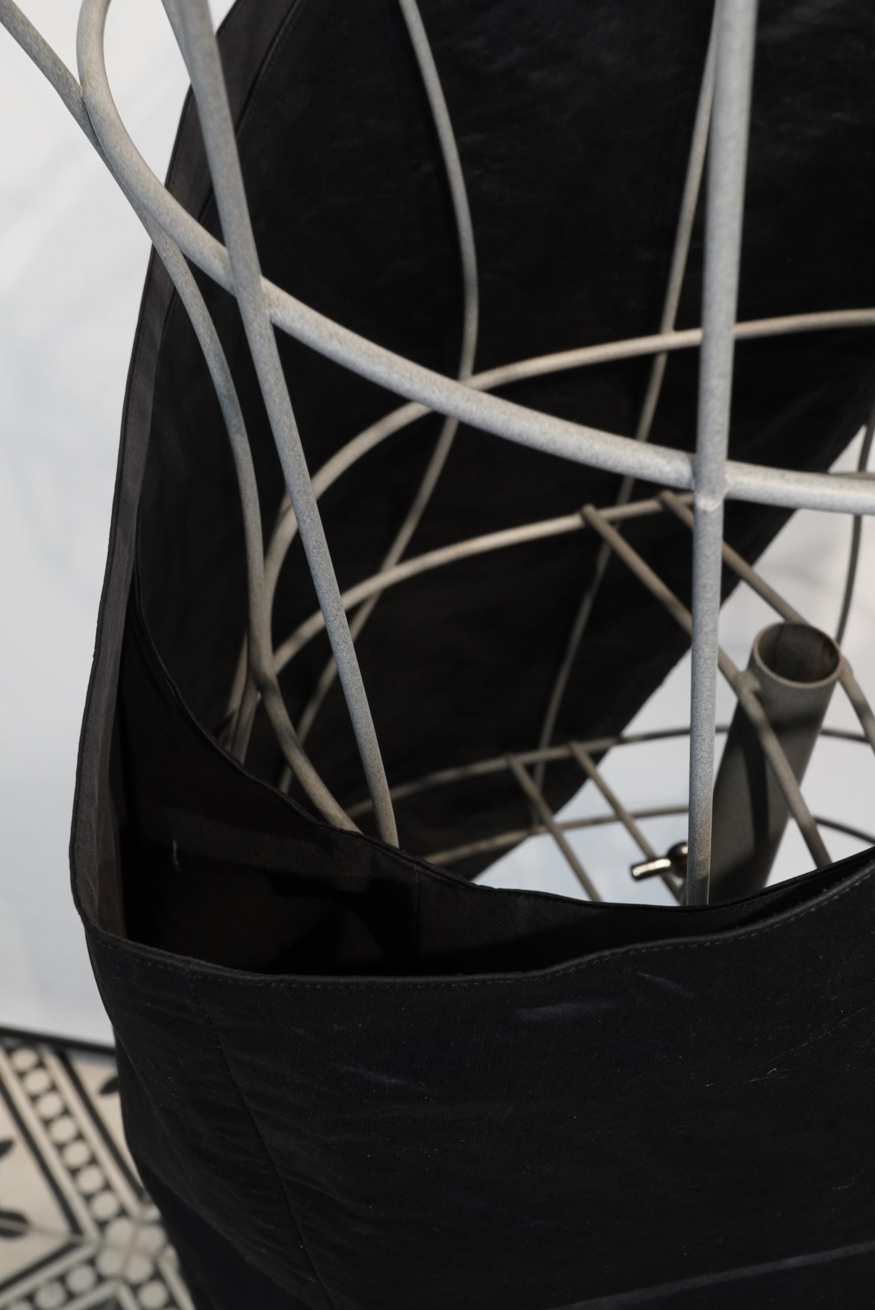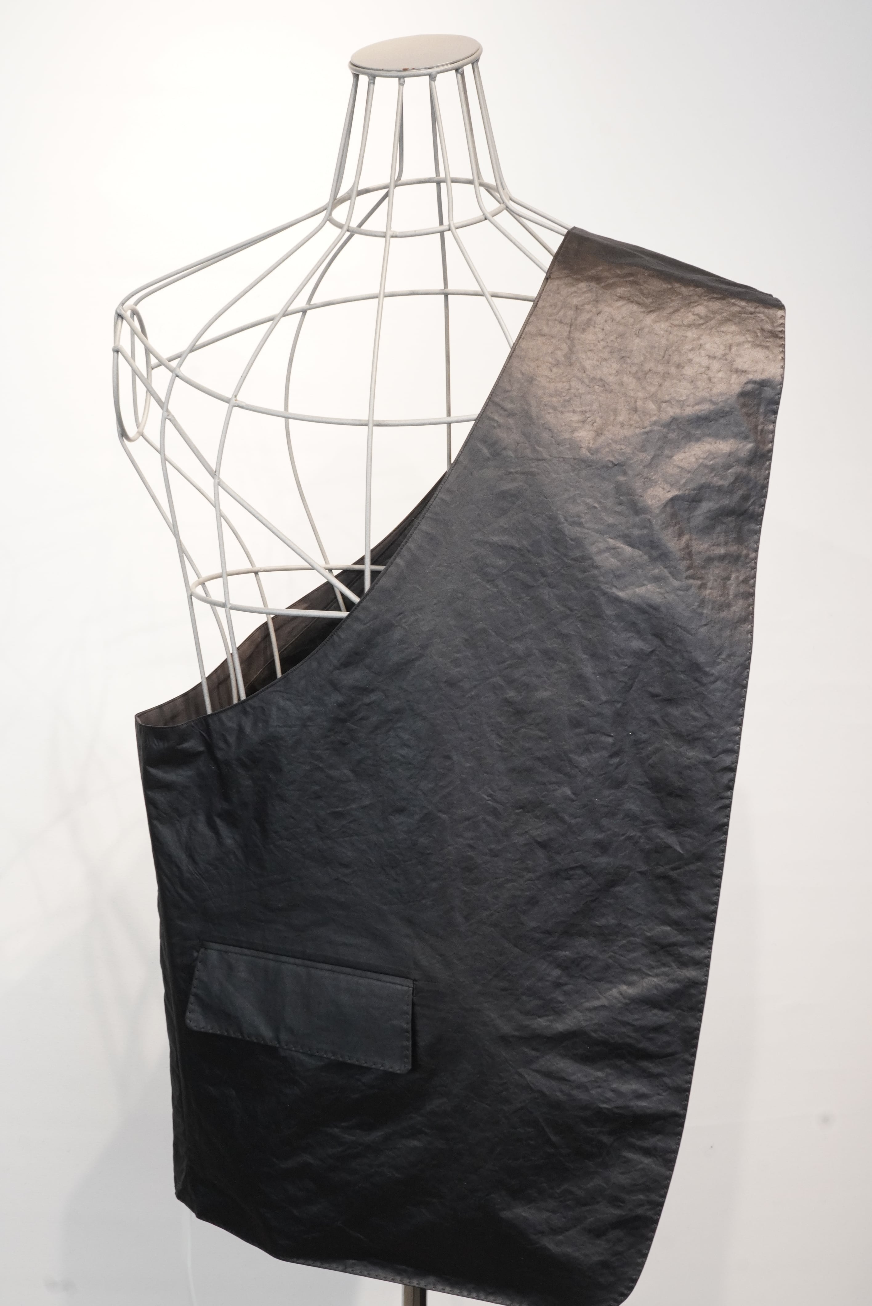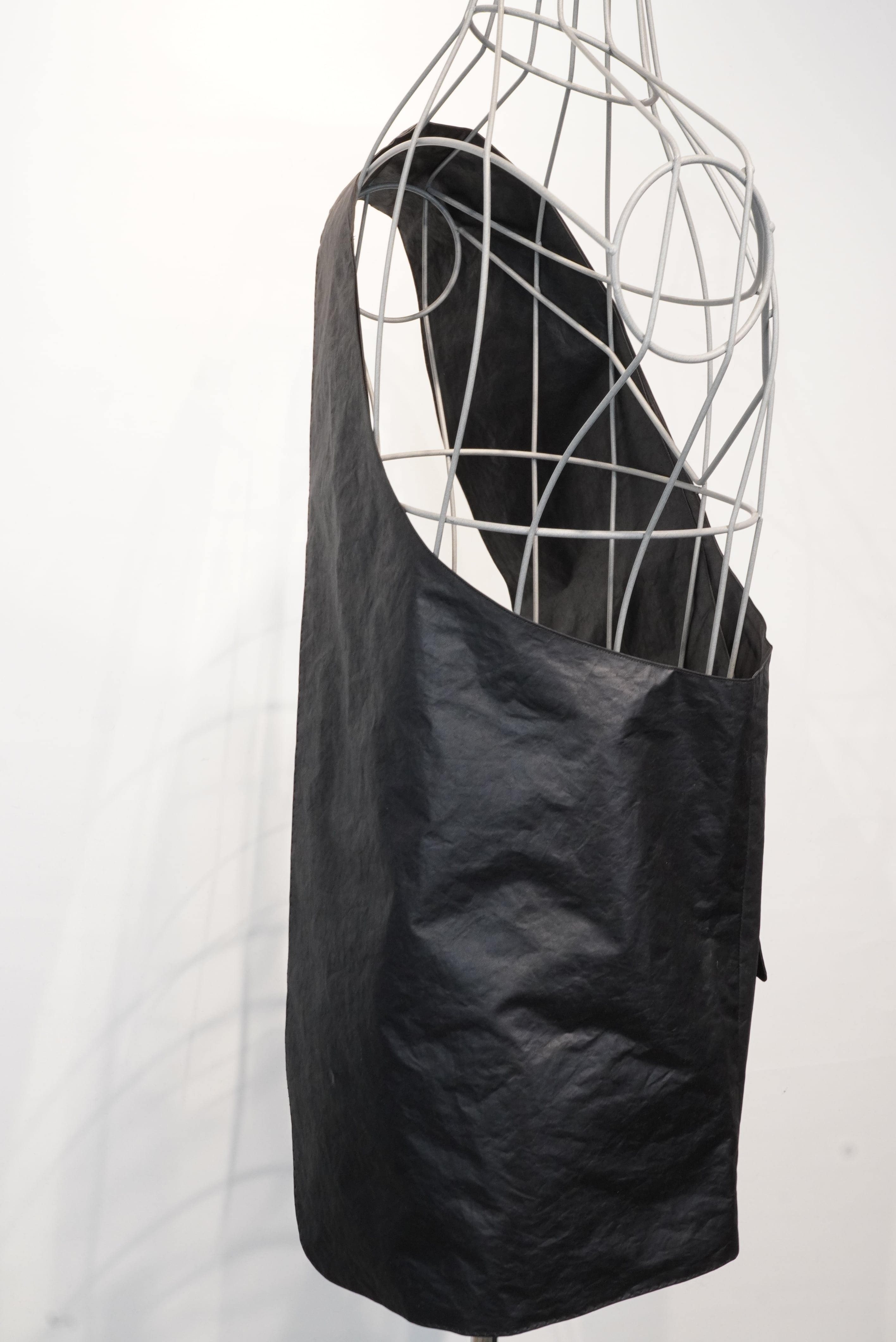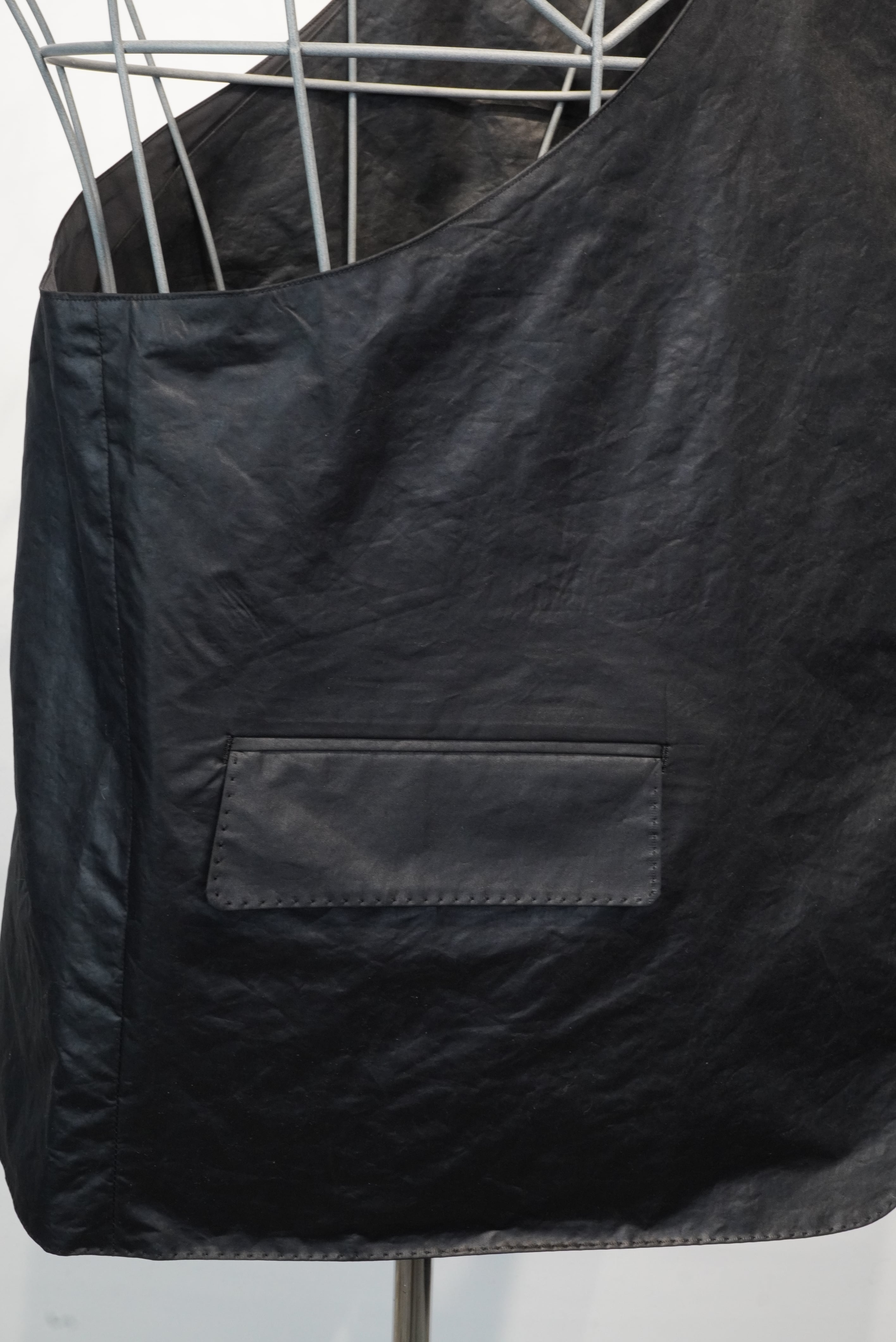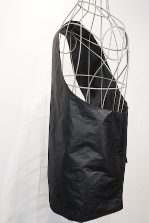 名前の通り、バックとベストの中間に位置するアイテム。脇下の部分が全て開いている構造で、全体がバックとしての機能を持つ、斜めがけのベストになります。生地には撥水樹脂コーティングをしたポリエステル素材を使用しており、少しレザーみたいに見えます。チャコール、ブラウン、ブラックの3色のご用意がございます。アウターからシャツ、Tシャツまで季節を問わずに使用することができる、ユニークなアイテムです。