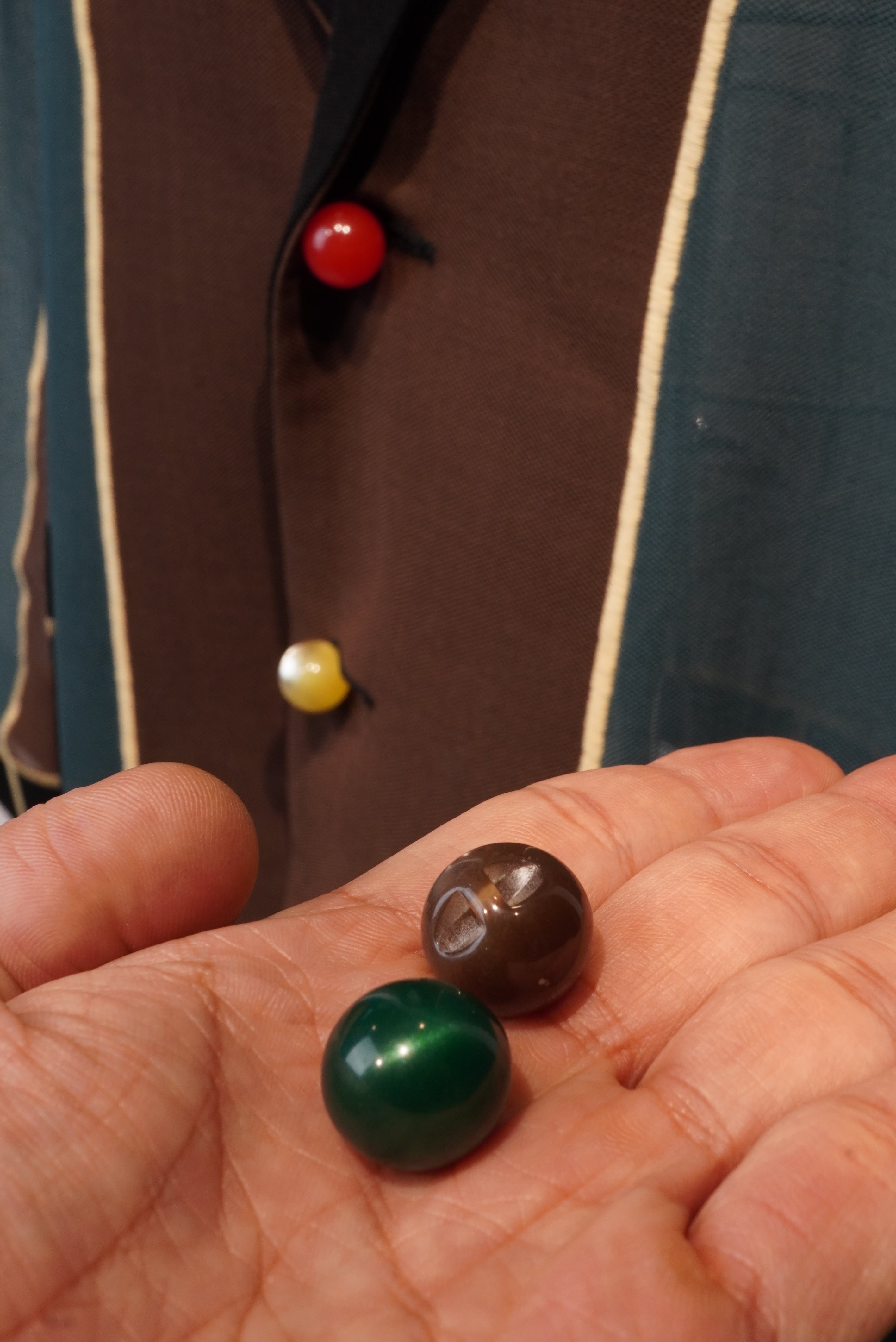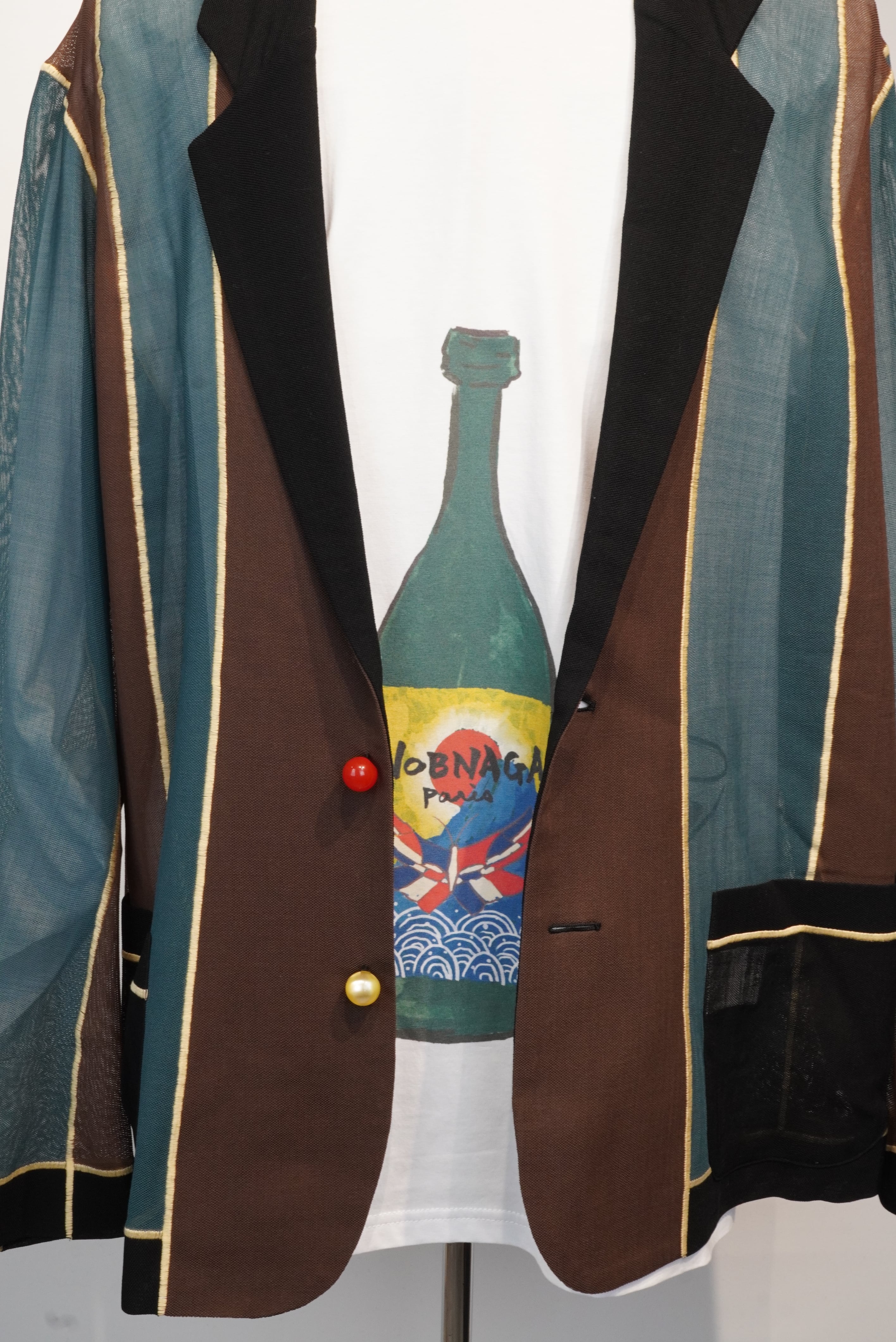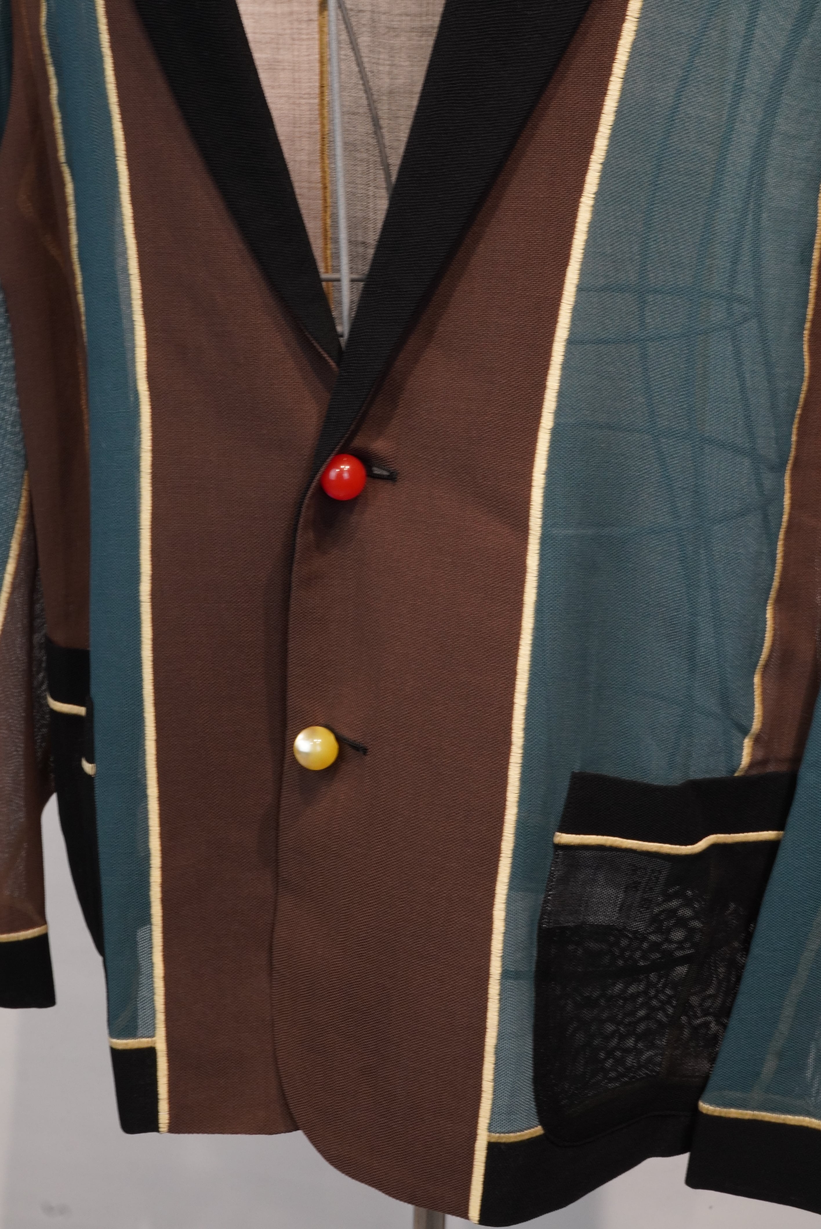 This unconstructed jacket is sewn using a special "soft seam" sewing machine developed in Japan that joins the fabric by knitting it together. It features a single-breasted, two-button design with no seam allowances. The sheer, twill fabric offers a refreshing feel that makes it suitable for wear from early spring through the hotter months. The color scheme is inspired by the formal curtains of kabuki theater. The round buttons are made of vintage French Naclélac resin from the 1960s. Two spare buttons in different colors are included (green and brown). Yellow soft seam sewing thread is used.