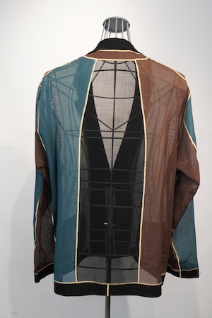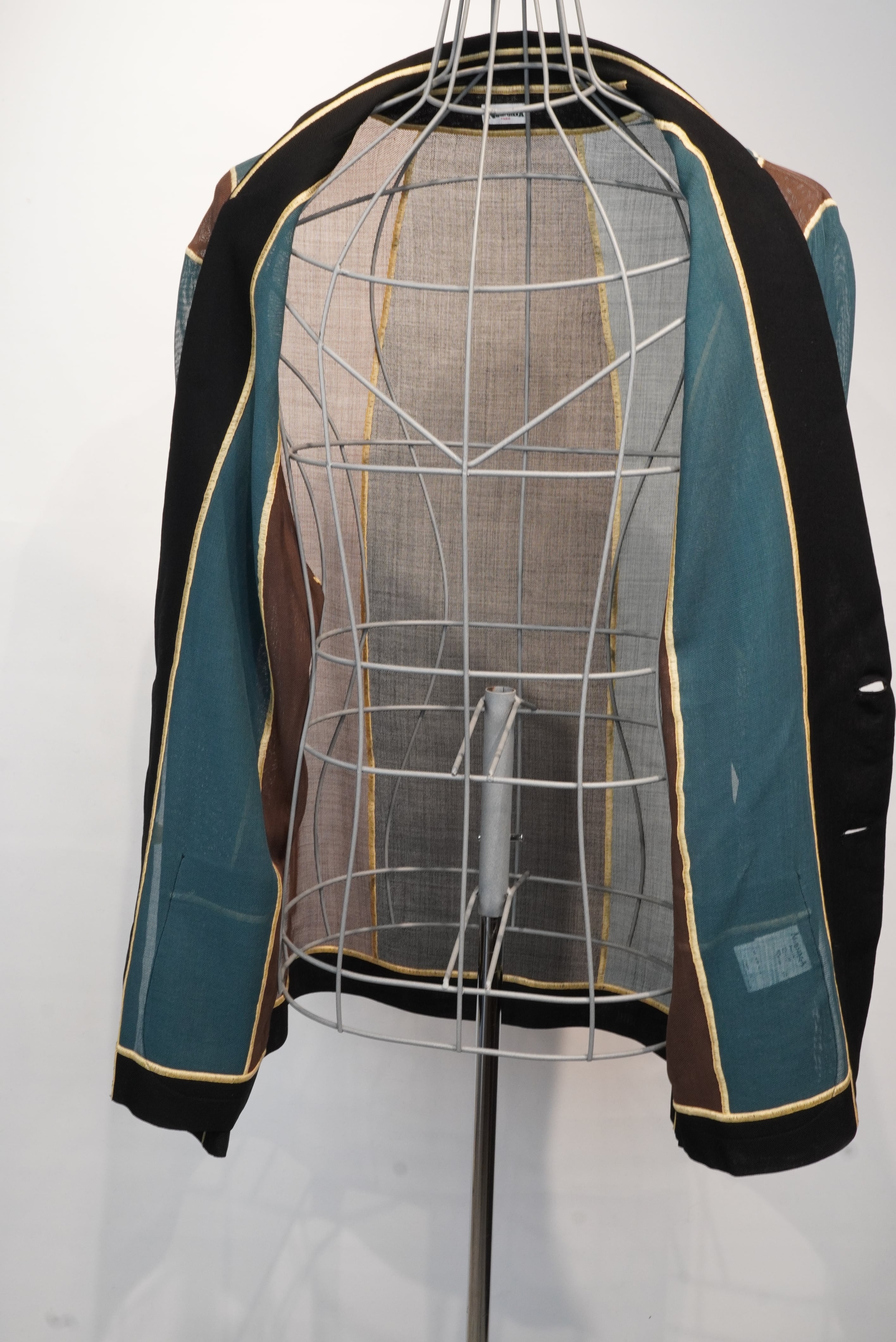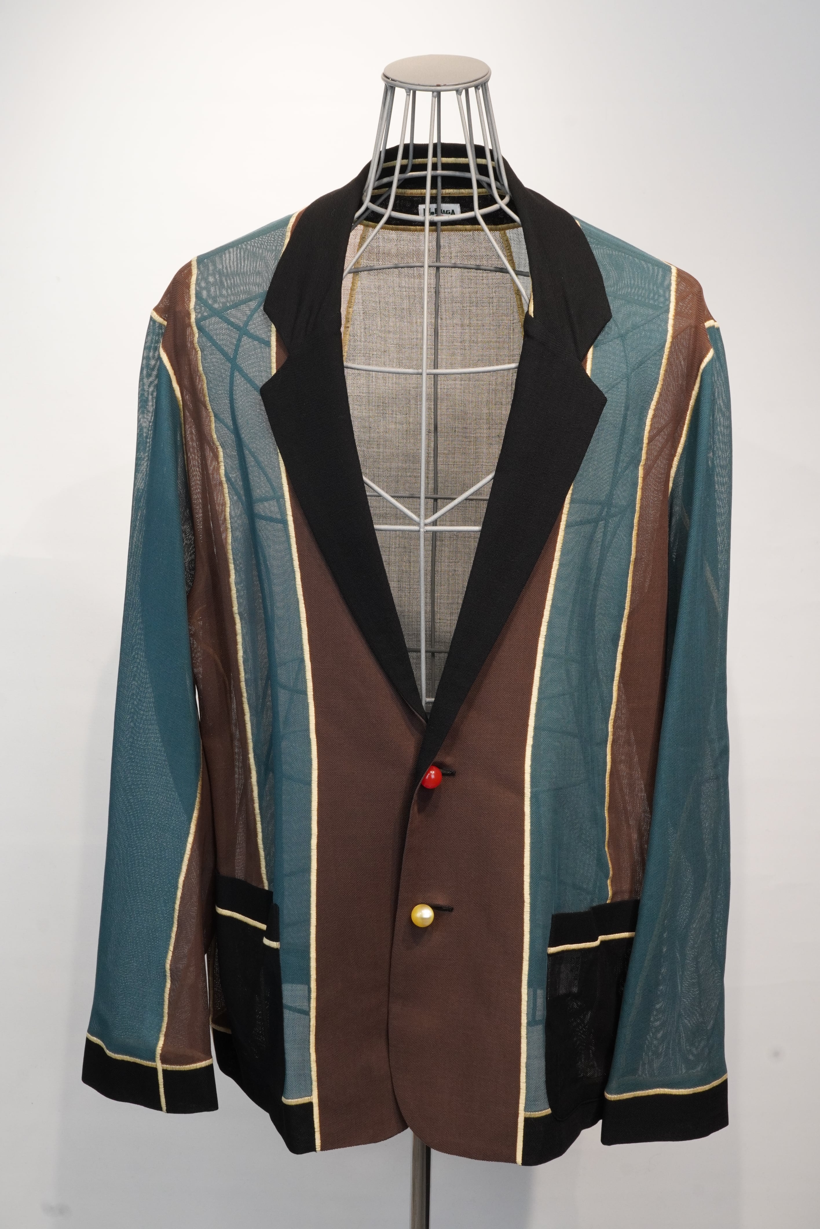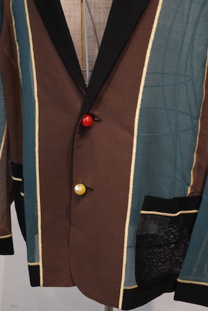 ”ソフトシーム”という日本で開発された、生地を編むことで繋げる特殊なミシンで縫製をしているアンコンジャケット。縫代が一切無いのが特徴のシングル2釦。透け感のあるカラミ素材の生地は、春先から暑い季節でも着用のできる清涼感が特徴です。歌舞伎の定式幕をイメージした配色。60年代フレンチヴィンテージのナクレラック樹脂素材の丸釦を使用。色違いのスペア釦x2個がつきます。(緑・茶)。ソフトシームミシン糸は黄を使用しています。