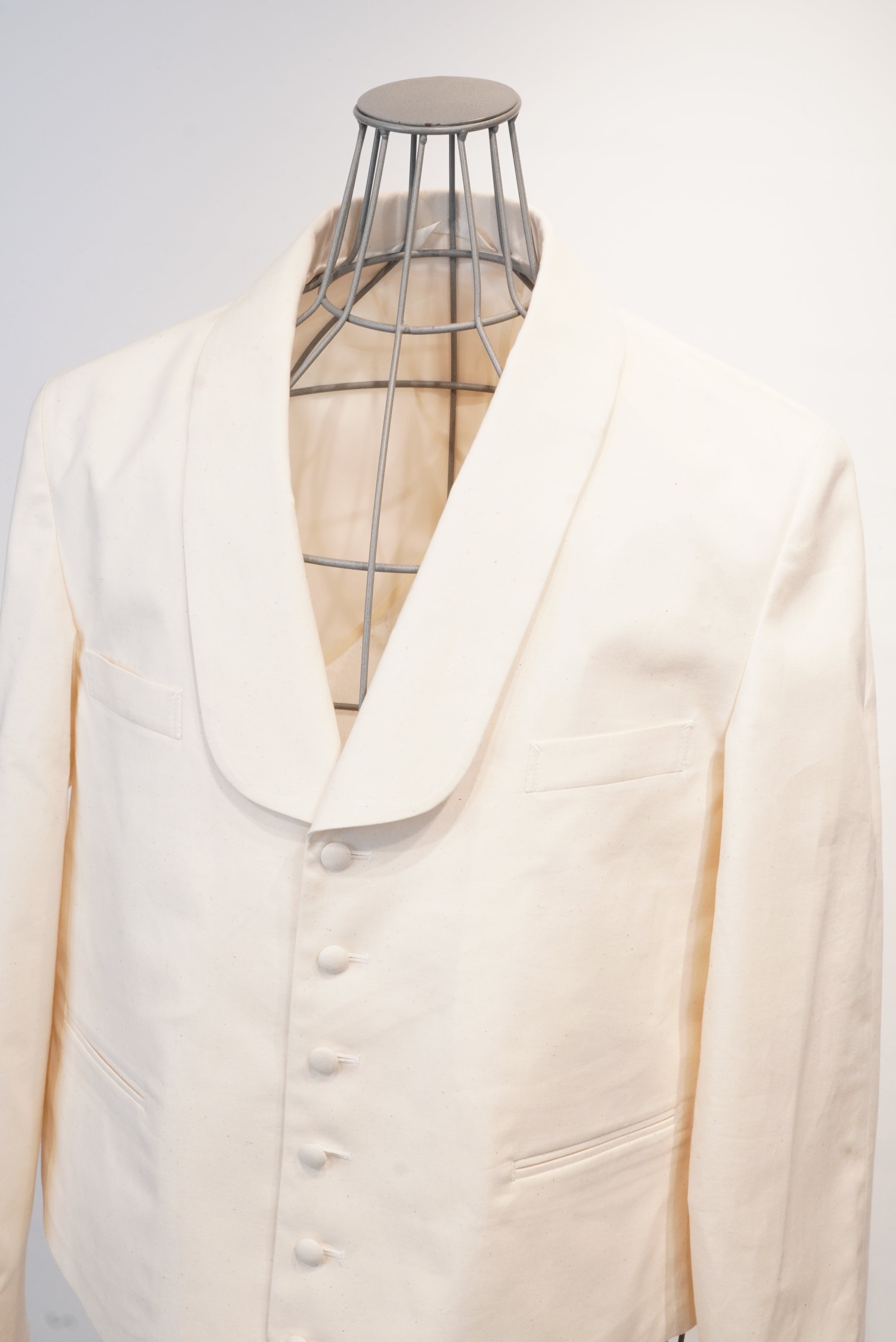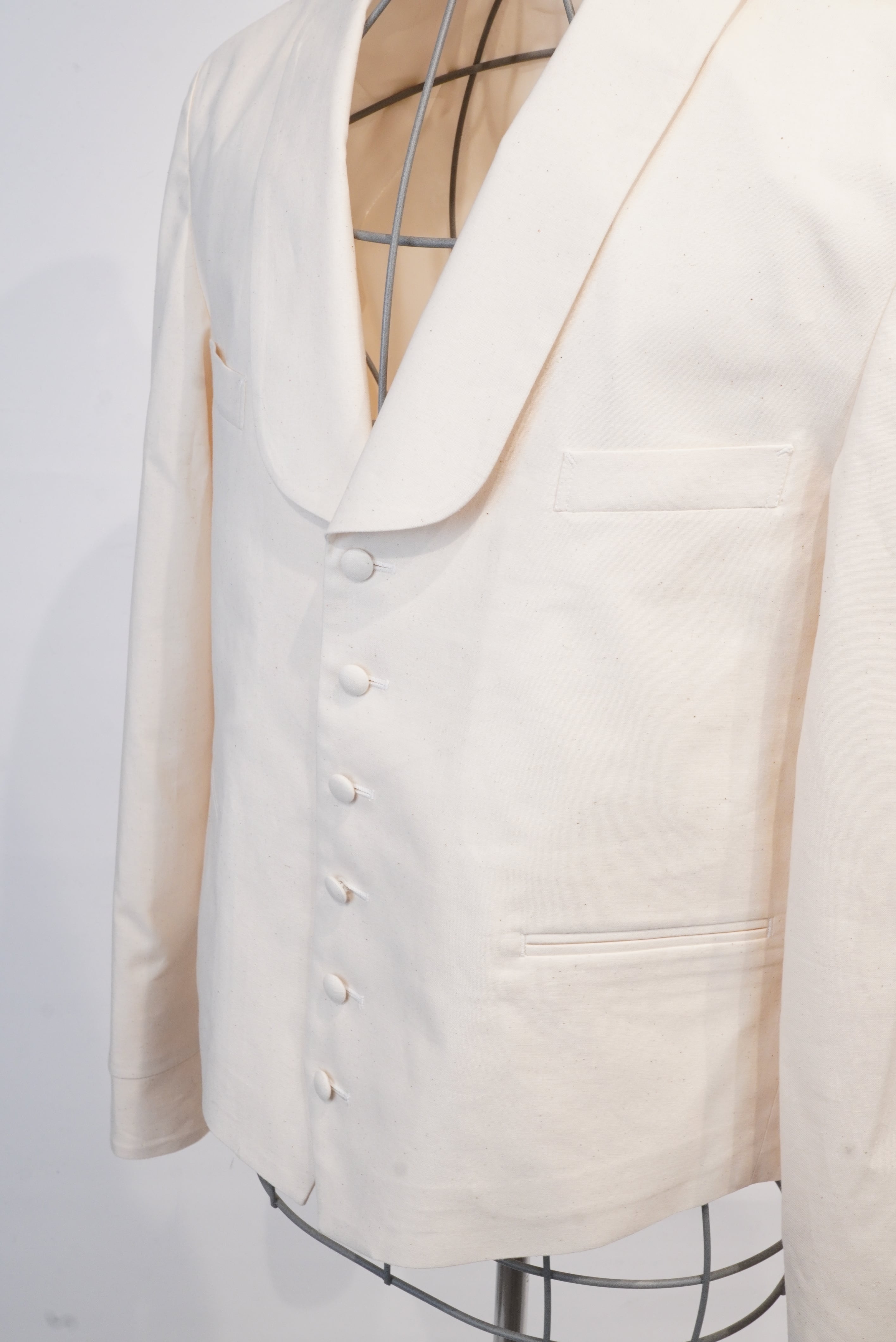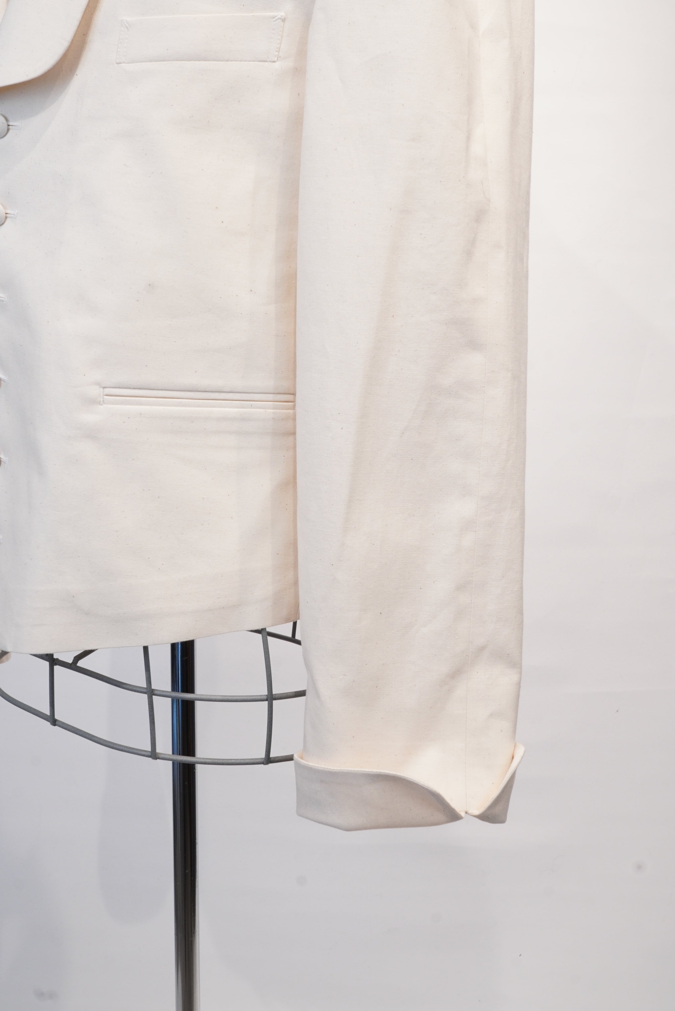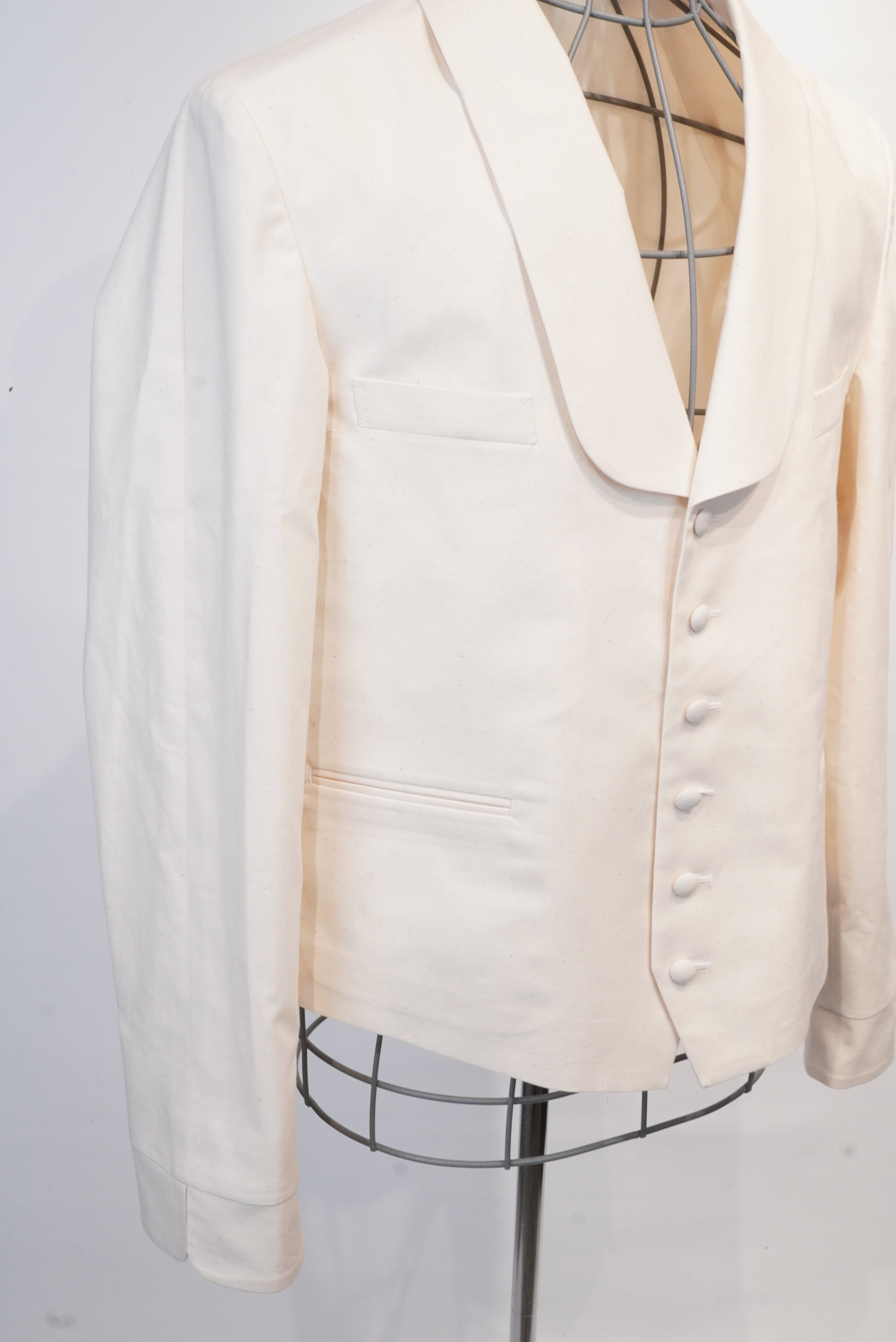 ヴィンテージのサーベントジャケットからインスパイア。1920年代〜40年代辺りのヴィンテージ好きの方は見かけた事があるかもしれません。当時、召し使いの方が着用していたジャケットが、サーベントジャケット。ベストに袖が付いたようなデザインが特徴的で、着丈が短く作業をする際に邪魔にならないなどの機能がデザインに反映されています。A BLUE CONCERTの洋服をデザインする際に、"どんな人がどんな場所でどんなシチュエーションで着ている洋服か"をイメージして作ります。今回は逆のパターンで、当時の人がその場所でそのシチュエーションで着ていたジャケットを、A BLUE CONCERTのシグネイチャーでもある、6.5ozのデニムで、A BLUE CONCERTのアイコンでもあるスプリットラグランを落とし込み作りました。ほとんどのヴィンテージのサーベントジャケットは身頃と袖部分で生地を切り替えているので、普段着には使いにくいという問題がありましたが、A BLUE CONCERTは1色で仕上げる事で、より普段着として使いやすいようにしています。当時、無意識のうちに機能重視でデザインされたであろうジャケットを、A BLUE CONCERTで "ベルボーイジャケット" とネーミングを付けて表現しました。