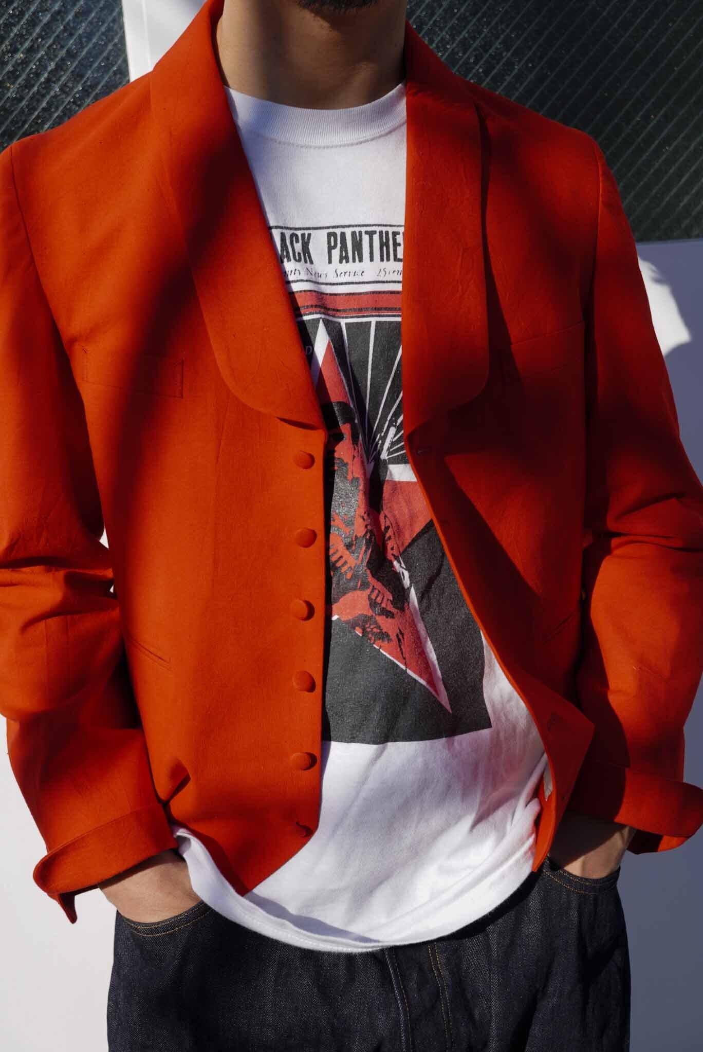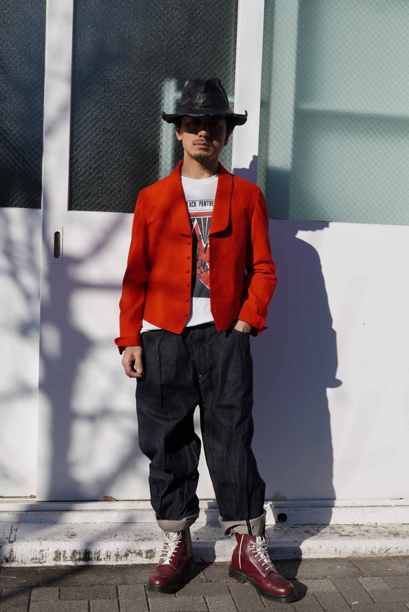 ヴィンテージのサーベントジャケットからインスパイア。1920年代〜40年代辺りのヴィンテージ好きの方は見かけた事があるかもしれません。当時、召し使いの方が着用していたジャケットが、サーベントジャケット。ベストに袖が付いたようなデザインが特徴的で、着丈が短く作業をする際に邪魔にならないなどの機能がデザインに反映されています。A BLUE CONCERTの洋服をデザインする際に、"どんな人がどんな場所でどんなシチュエーションで着ている洋服か"をイメージして作ります。今回は逆のパターンで、当時の人がその場所でそのシチュエーションで着ていたジャケットを、A BLUE CONCERTのシグネイチャーでもある、6.5ozのデニムで、A BLUE CONCERTのアイコンでもあるスプリットラグランを落とし込み作りました。ほとんどのヴィンテージのサーベントジャケットは身頃と袖部分で生地を切り替えているので、普段着には使いにくいという問題がありましたが、A BLUE CONCERTは1色で仕上げる事で、より普段着として使いやすいようにしています。当時、無意識のうちに機能重視でデザインされたであろうジャケットを、A BLUE CONCERTで "ベルボーイジャケット" とネーミングを付けて表現しました。レッドはARCD別注カラーとなります。