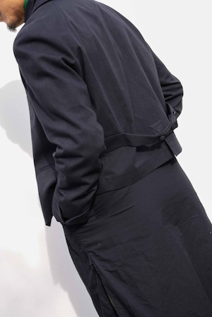ヴィンテージのサーベントジャケットからインスパイア。1920年代〜40年代辺りのヴィンテージ好きの方は見かけた事があるかもしれません。当時、召し使いの方が着用していたジャケットが、サーベントジャケット。ベストに袖が付いたようなデザインが特徴的で、着丈が短く作業をする際に邪魔にならないなどの機能がデザインに反映されています。A BLUE CONCERTの洋服をデザインする際に、"どんな人がどんな場所でどんなシチュエーションで着ている洋服か"をイメージして作ります。今回は逆のパターンで、当時の人がその場所でそのシチュエーションで着ていたジャケットを、A BLUE CONCERTのシグネイチャーでもある、6.5ozのデニムで、A BLUE CONCERTのアイコンでもあるスプリットラグランを落とし込み作りました。ほとんどのヴィンテージのサーベントジャケットは身頃と袖部分で生地を切り替えているので、普段着には使いにくいという問題がありましたが、A BLUE CONCERTは1色で仕上げる事で、より普段着として使いやすいようにしています。当時、無意識のうちに機能重視でデザインされたであろうジャケットを、A BLUE CONCERTで "ベルボーイジャケット" とネーミングを付けて表現しました。