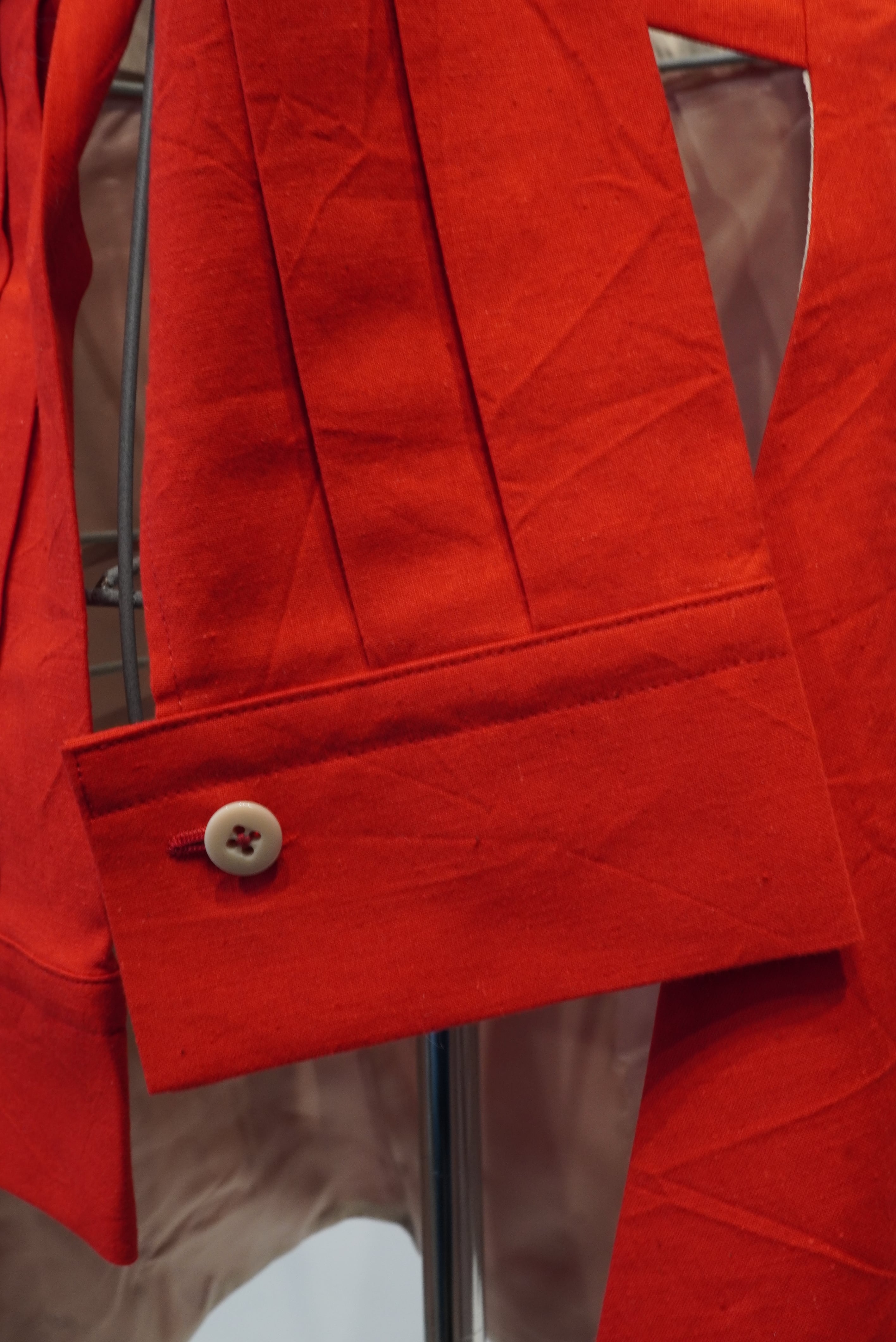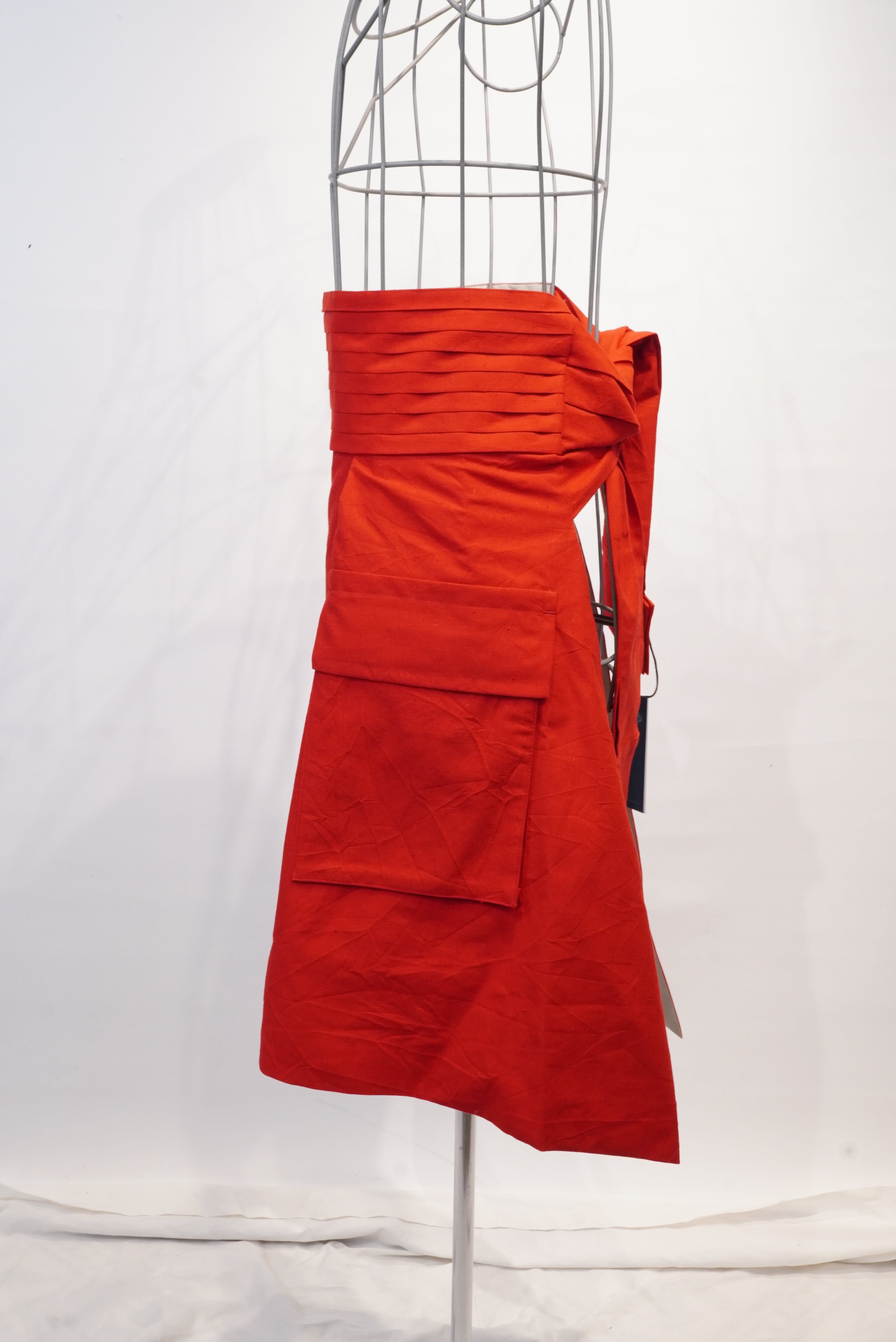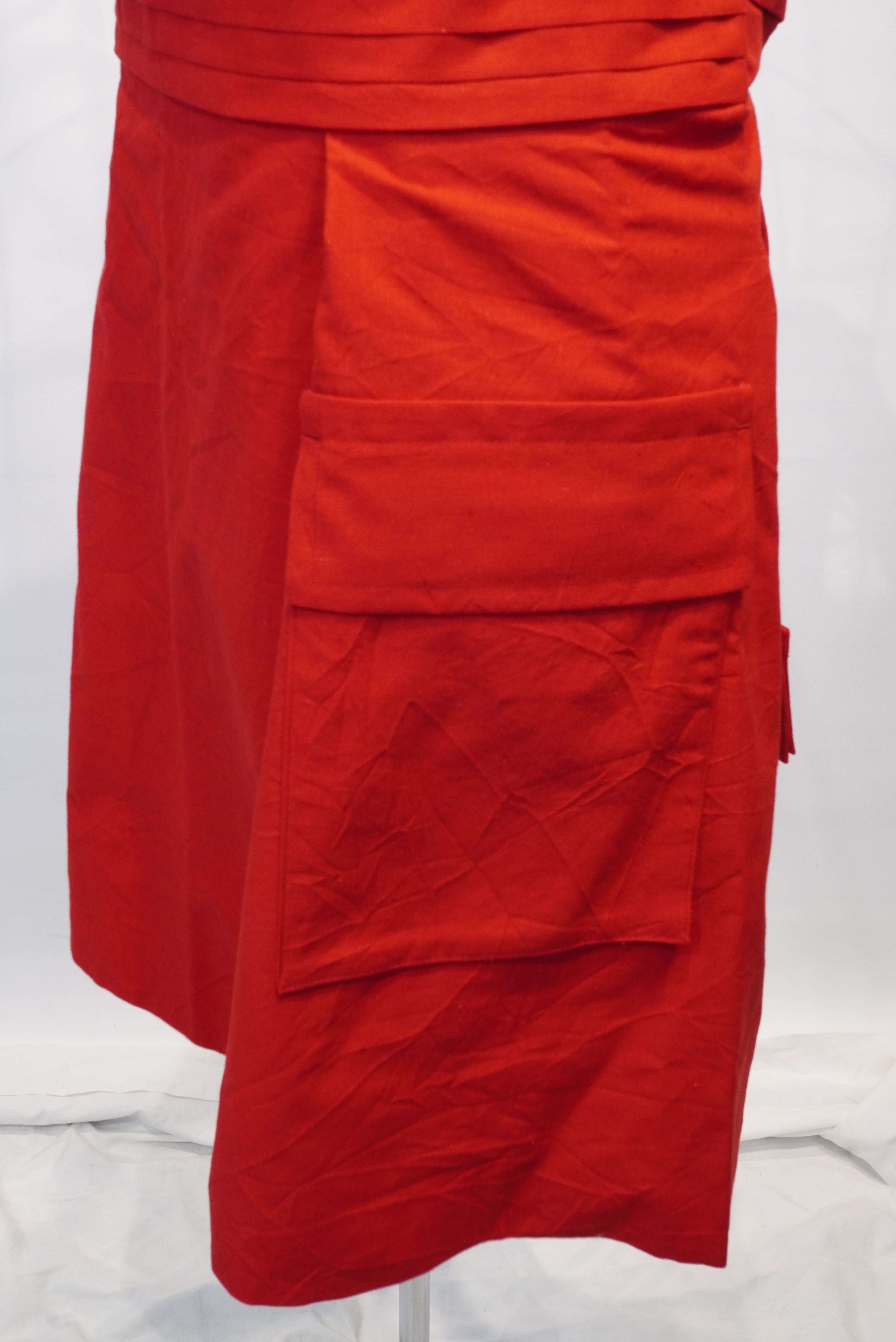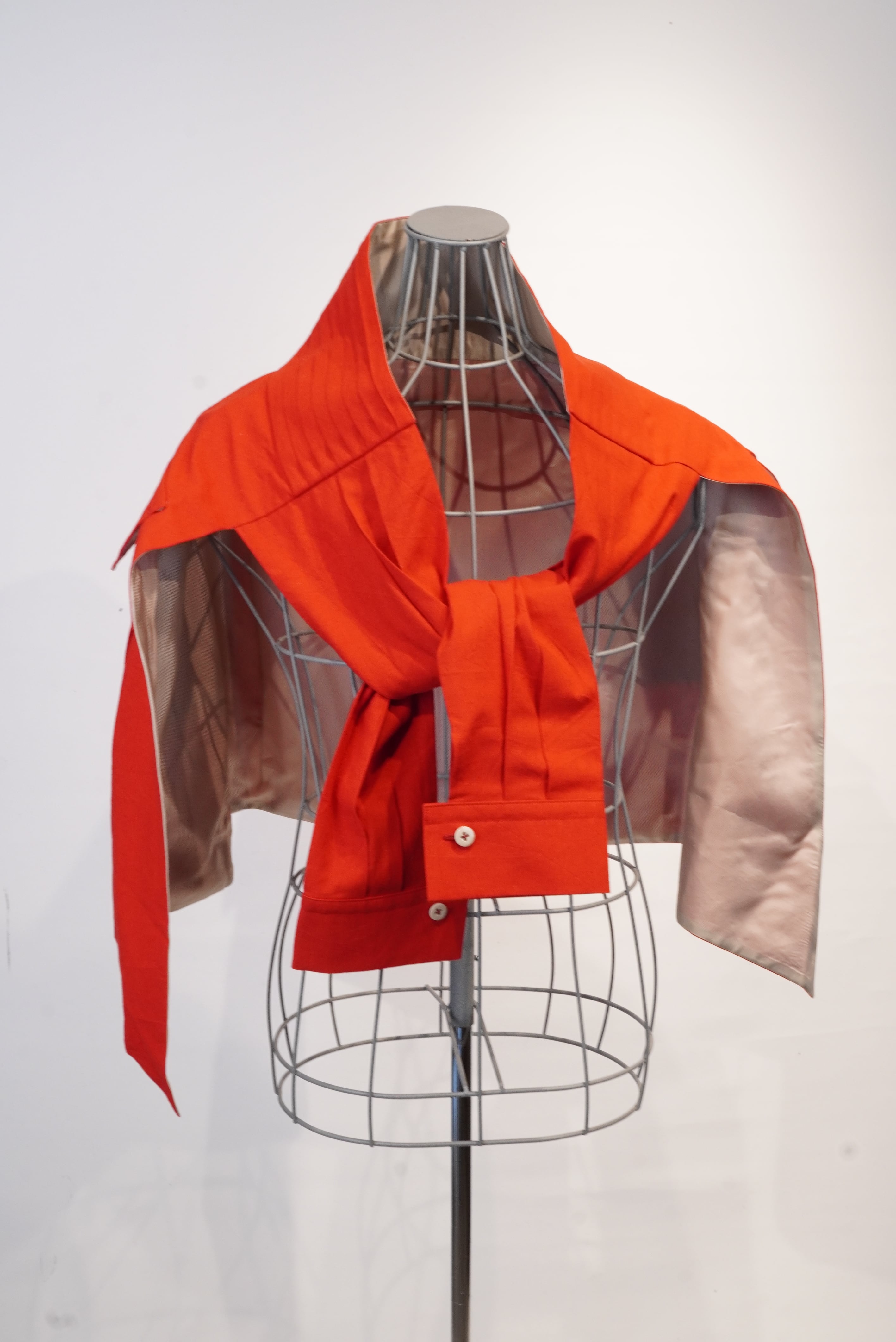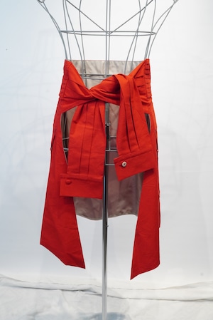 コンセプトは"腰に巻く洋服"。タキシードを着る時に巻くカマーバンドの要素をデザインし、更にその留め具としてフックやベルトではなく、シャツ袖でギュッと縛るスタイル。更にシャツを腰に巻いた時のようなデザインにし、両サイドに立体感のあるコートのアウトポケットをようなモノを付ける事で実用性もプラス。A BLUE CONCERTのジャケットやTシャツとも相性良く仕上げました。肩から巻いたりもアレンジできるので、シーズンを気にせずにスタイリングでお使い頂けます。全体的にキュプラ100%の裏地が付いているので冬辺りになると裏返しで腰に巻くスタイリングもオススメです。国内最高峰のジャケット工場の縫製により、裏側も美しくオリジナルスタイルでスタイリングをお楽しみください。レッドはARCD別注カラーとなります。
