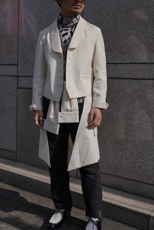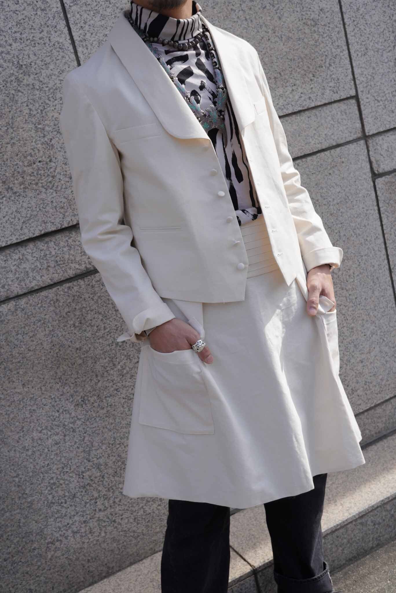 コンセプトは"腰に巻く洋服"。タキシードを着る時に巻くカマーバンドの要素をデザインし、更にその留め具としてフックやベルトではなく、シャツ袖でギュッと縛るスタイル。更にシャツを腰に巻いた時のようなデザインにし、両サイドに立体感のあるコートのアウトポケットをようなモノを付ける事で実用性もプラス。A BLUE CONCERTのジャケットやTシャツとも相性良く仕上げました。肩から巻いたりもアレンジできるので、シーズンを気にせずにスタイリングでお使い頂けます。全体的にキュプラ100%の裏地が付いているので冬辺りになると裏返しで腰に巻くスタイリングもオススメです。国内最高峰のジャケット工場の縫製により、裏側も美しくオリジナルスタイルでスタイリングをお楽しみください。
