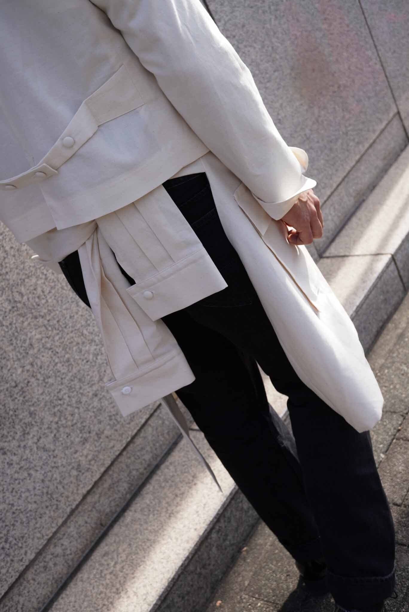 The concept is "clothing worn around the waist." Its design incorporates elements of the cummerbund worn with a tuxedo, but instead of a hook or belt, it is fastened tightly with the shirt sleeve. The design mimics a shirt worn around the waist, and the three-dimensional outer pockets on both sides, reminiscent of a coat, add practicality. It pairs well with A BLUE CONCERT jackets and T-shirts. It can be worn over the shoulder, so it can be styled any time of the year. The entire garment is lined with 100% cupra, so we recommend turning it inside out and wearing it around the waist in the winter. Stitched by Japan's top jacket factory, the inside is also beautiful, allowing you to enjoy styling with your own original style.