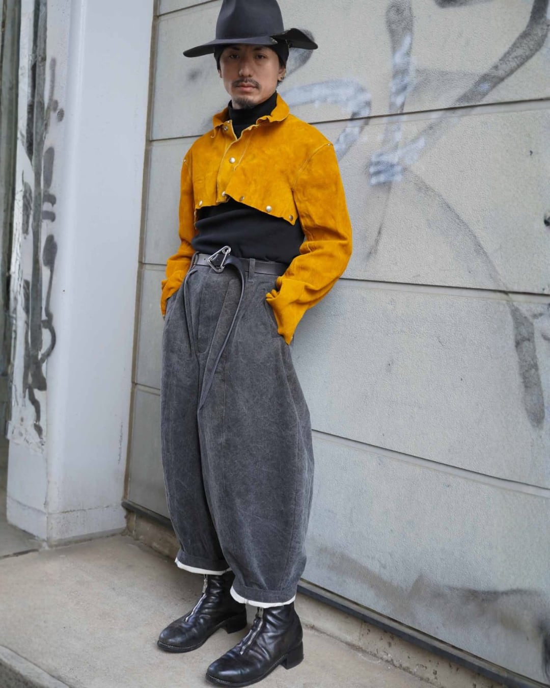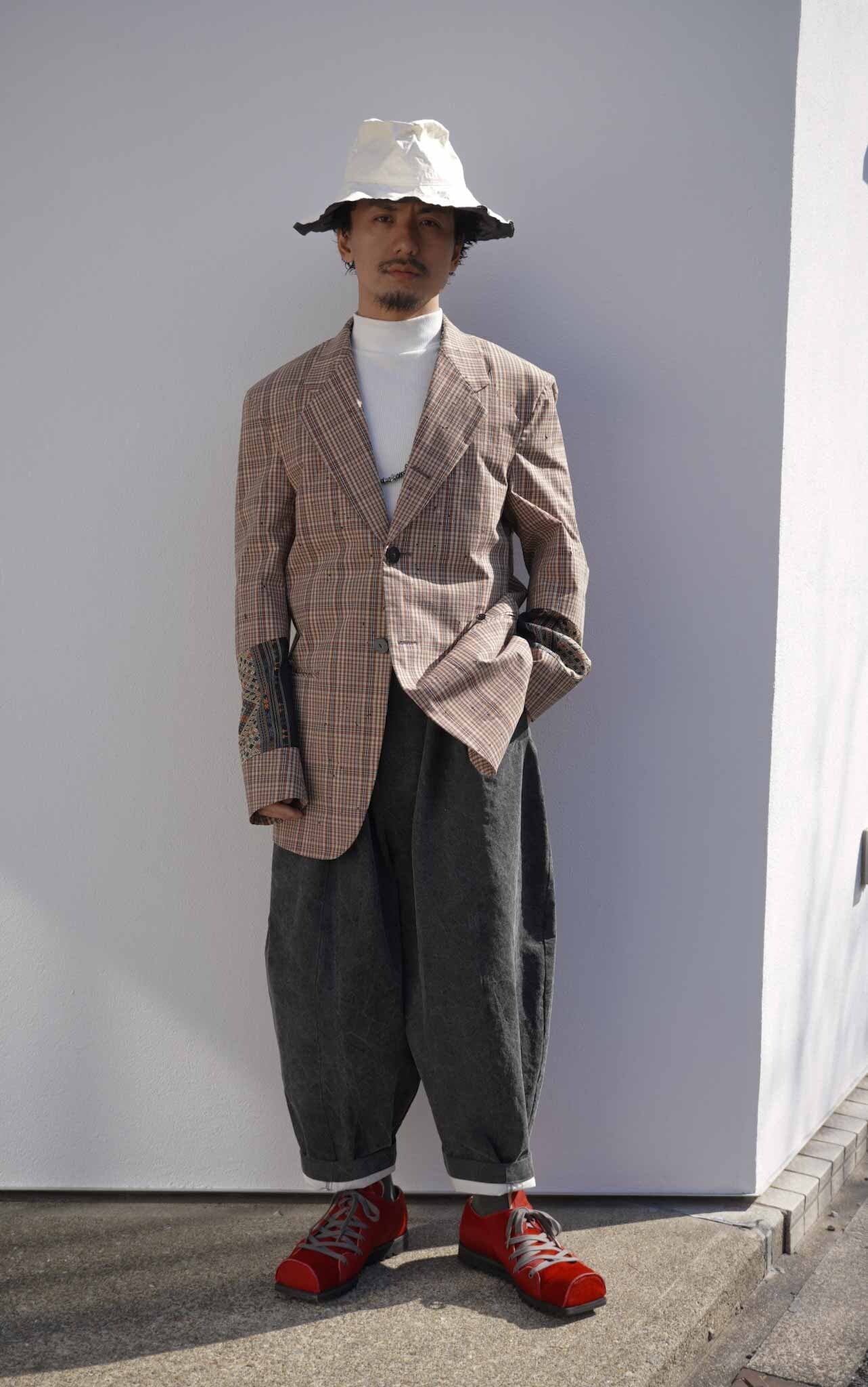These balloon pants were experimentally created with the aim of creating a highly three-dimensional structure by dividing each leg into four vertical sections and tapering the hemline. The fabric is cotton twill with a pigment coating, which creates tension and texture on the surface, helping to create the silhouette. The extra-wide silhouette is reminiscent of pants with gathered waists and excessive inseams found in Central Asia (such as the Indian shalwar and Afghan tombon).